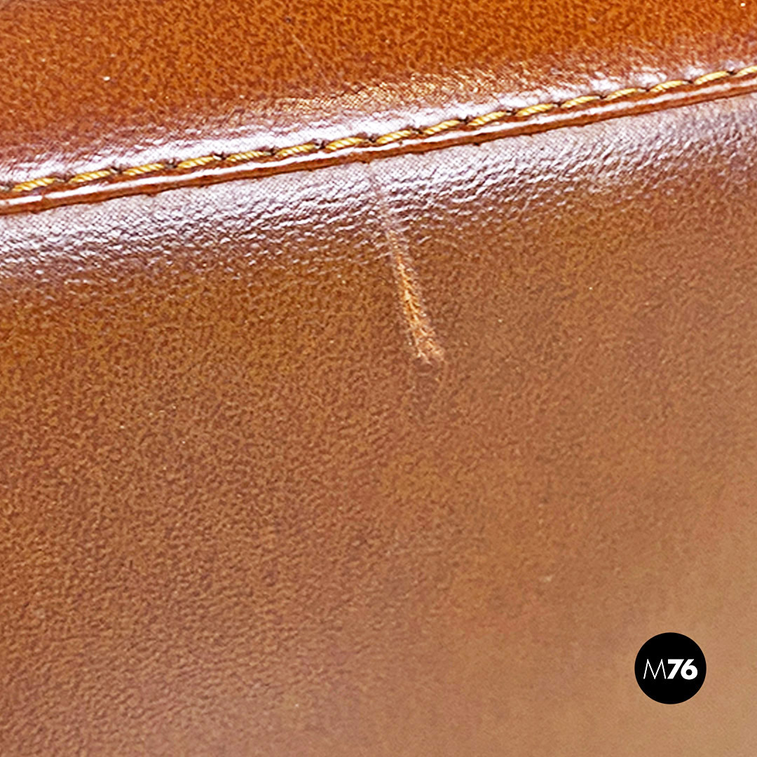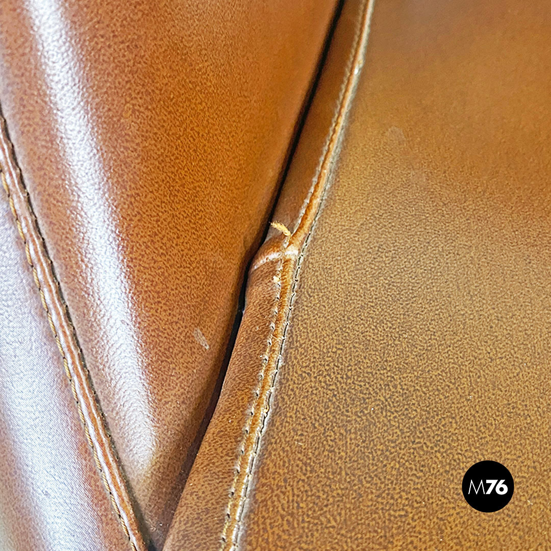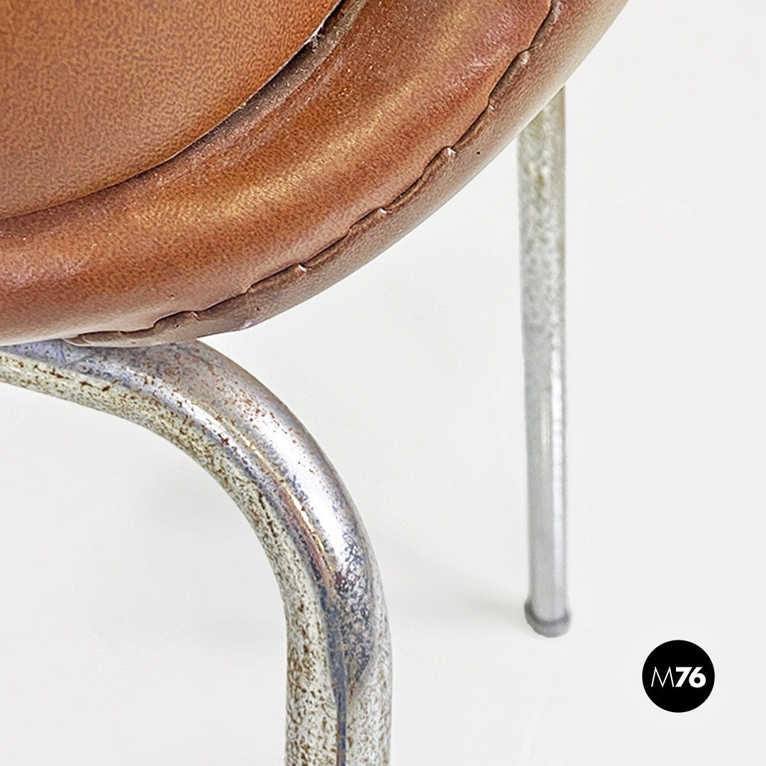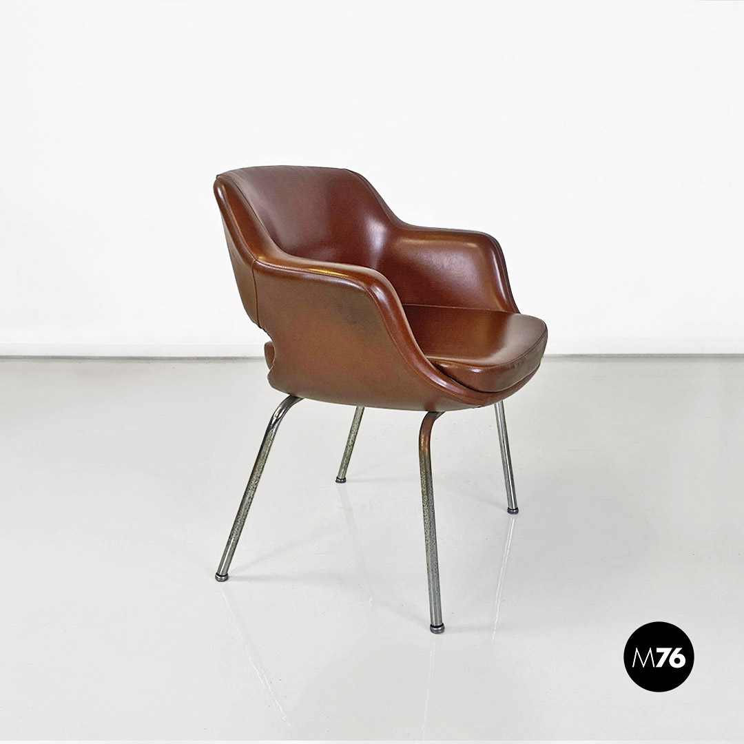 Coppia di piccole poltrone da ufficio o da scrivania, in pelle marrone, con braccioli e zampe in acciaio cromato.