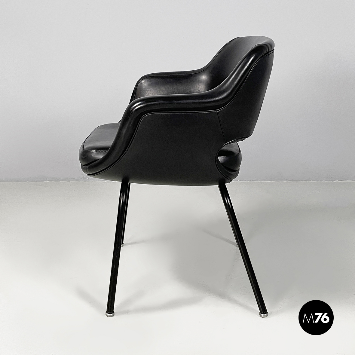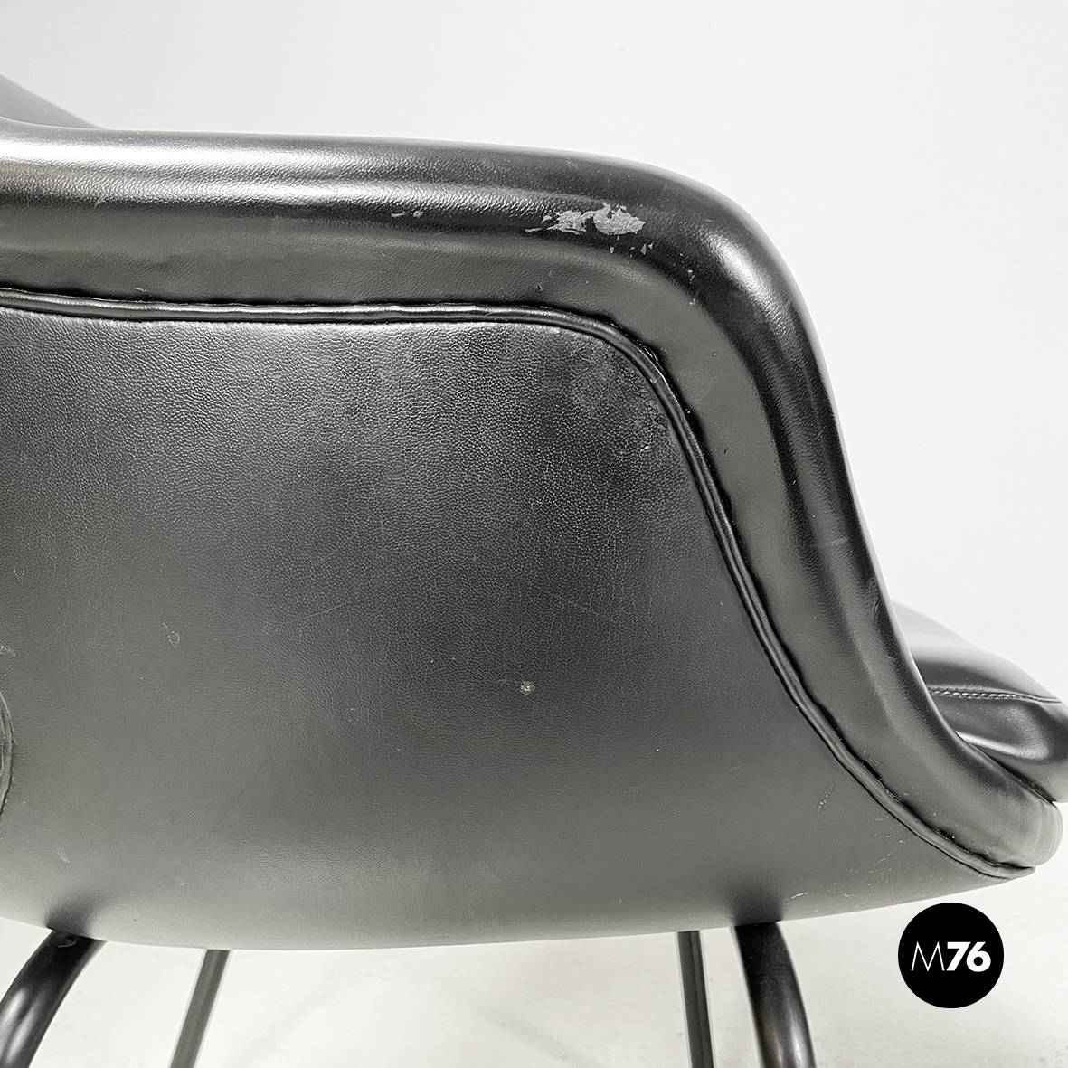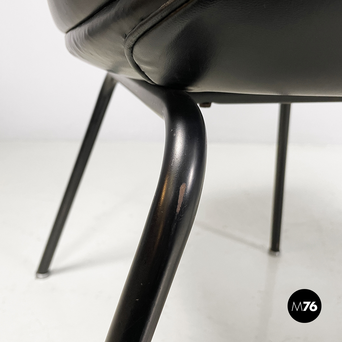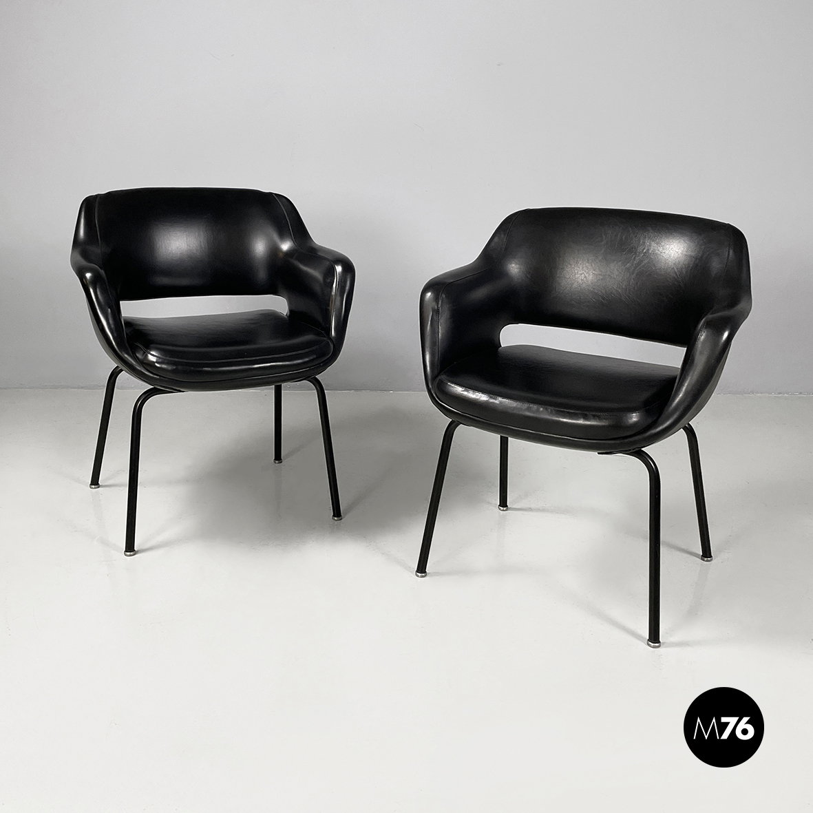 Coppia di poltrone con seduta e schienale imbottiti e rivestiti in finta pelle nera. Braccioli presenti. Le zampe a sezione tonda sono in metallo verniciato nero con piedini tondi in metallo.