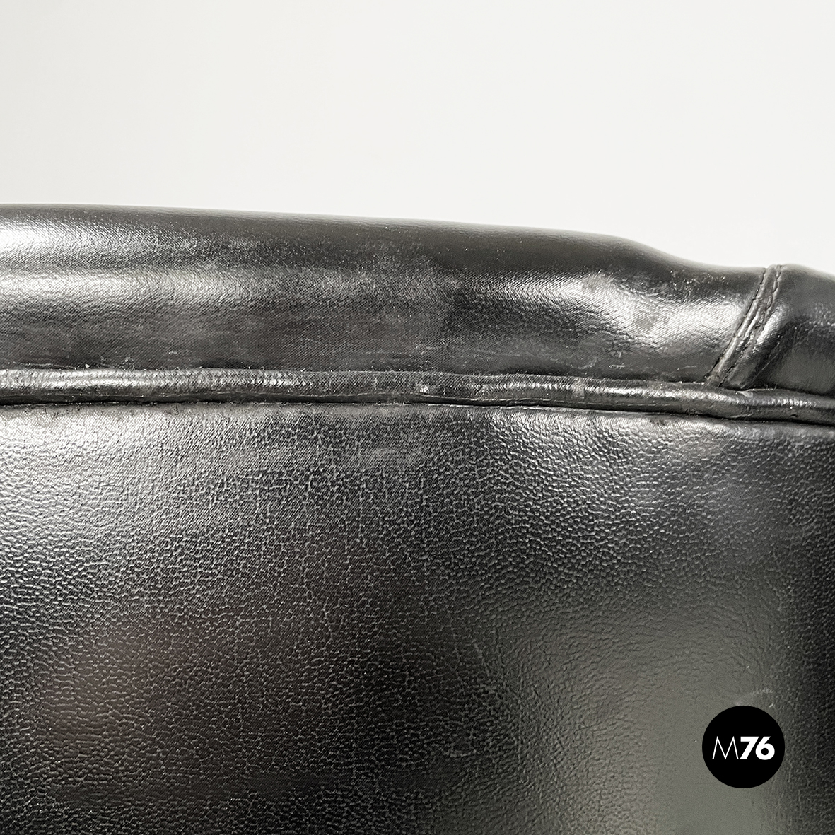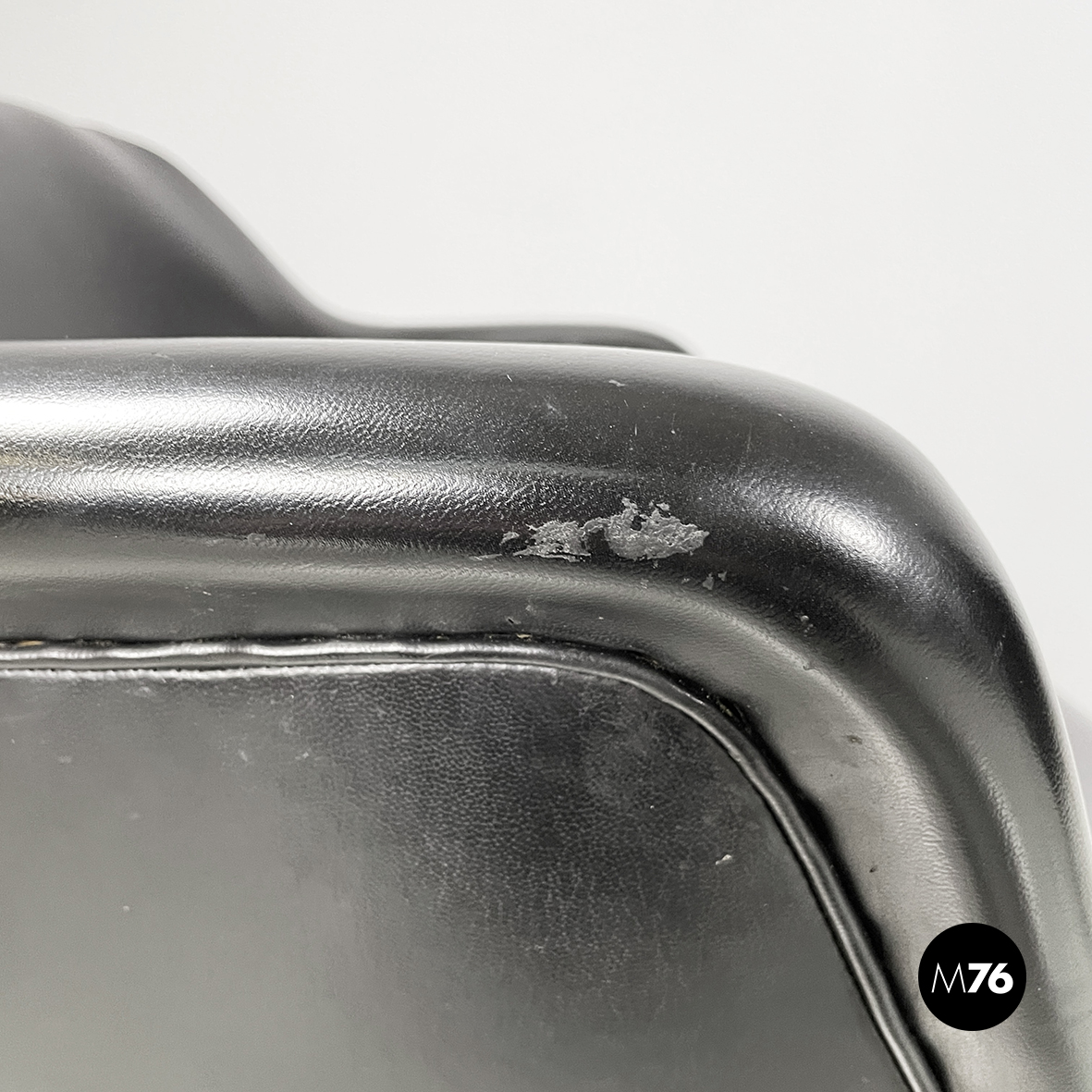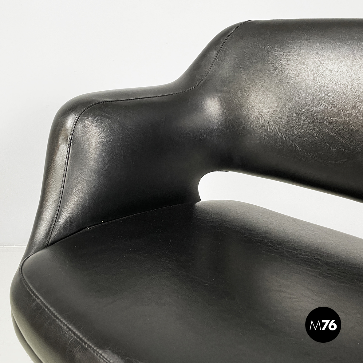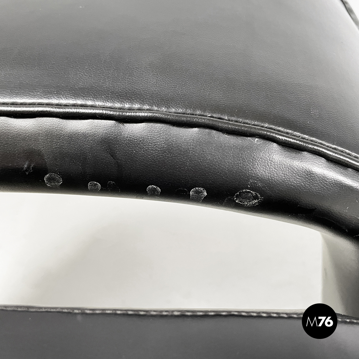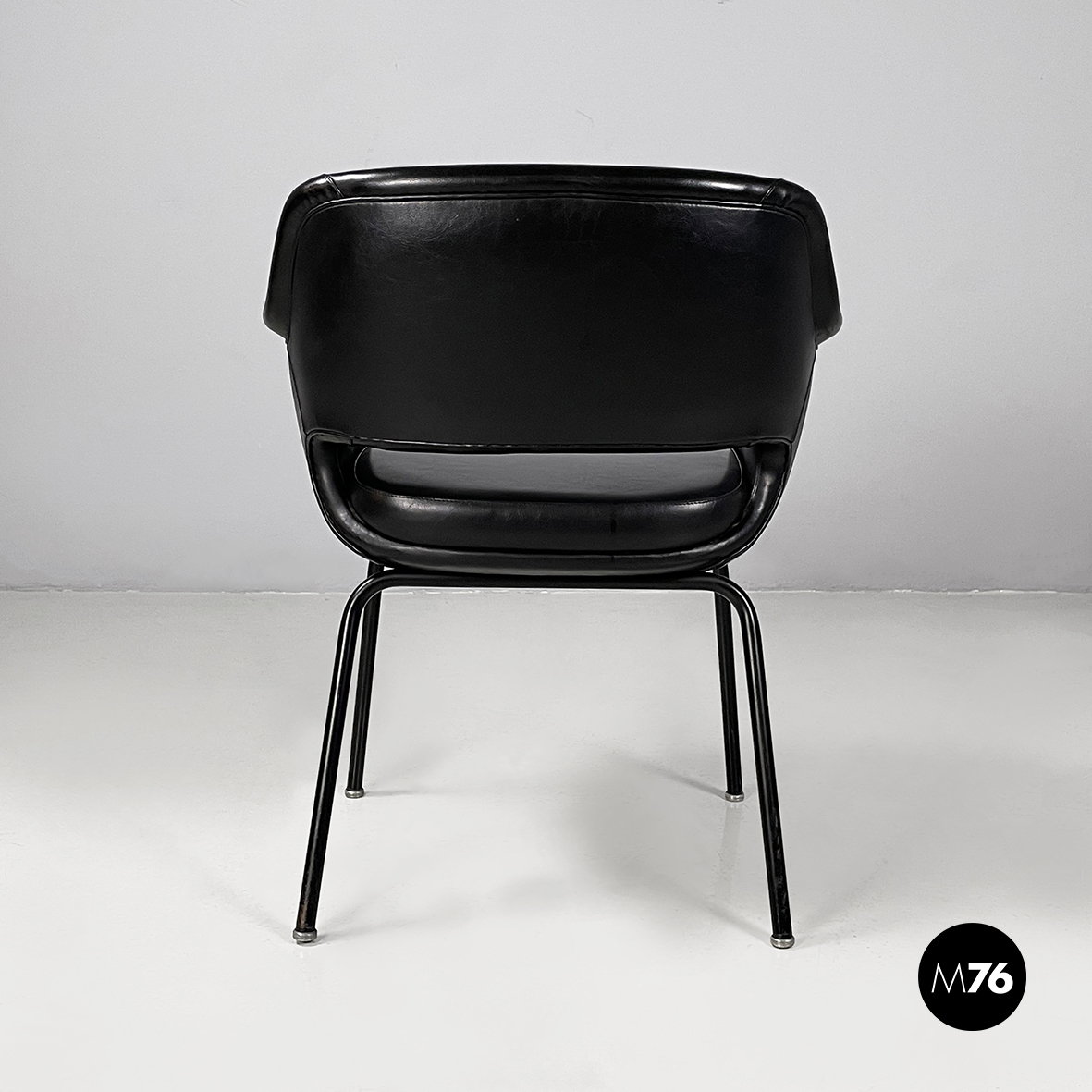 Coppia di poltrone con seduta e schienale imbottiti e rivestiti in finta pelle nera. Braccioli presenti. Le zampe a sezione tonda sono in metallo verniciato nero con piedini tondi in metallo.