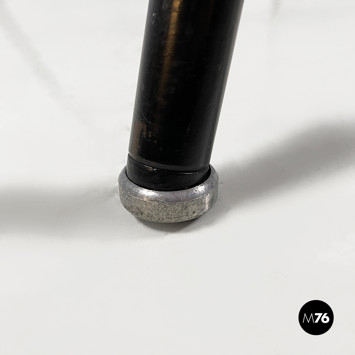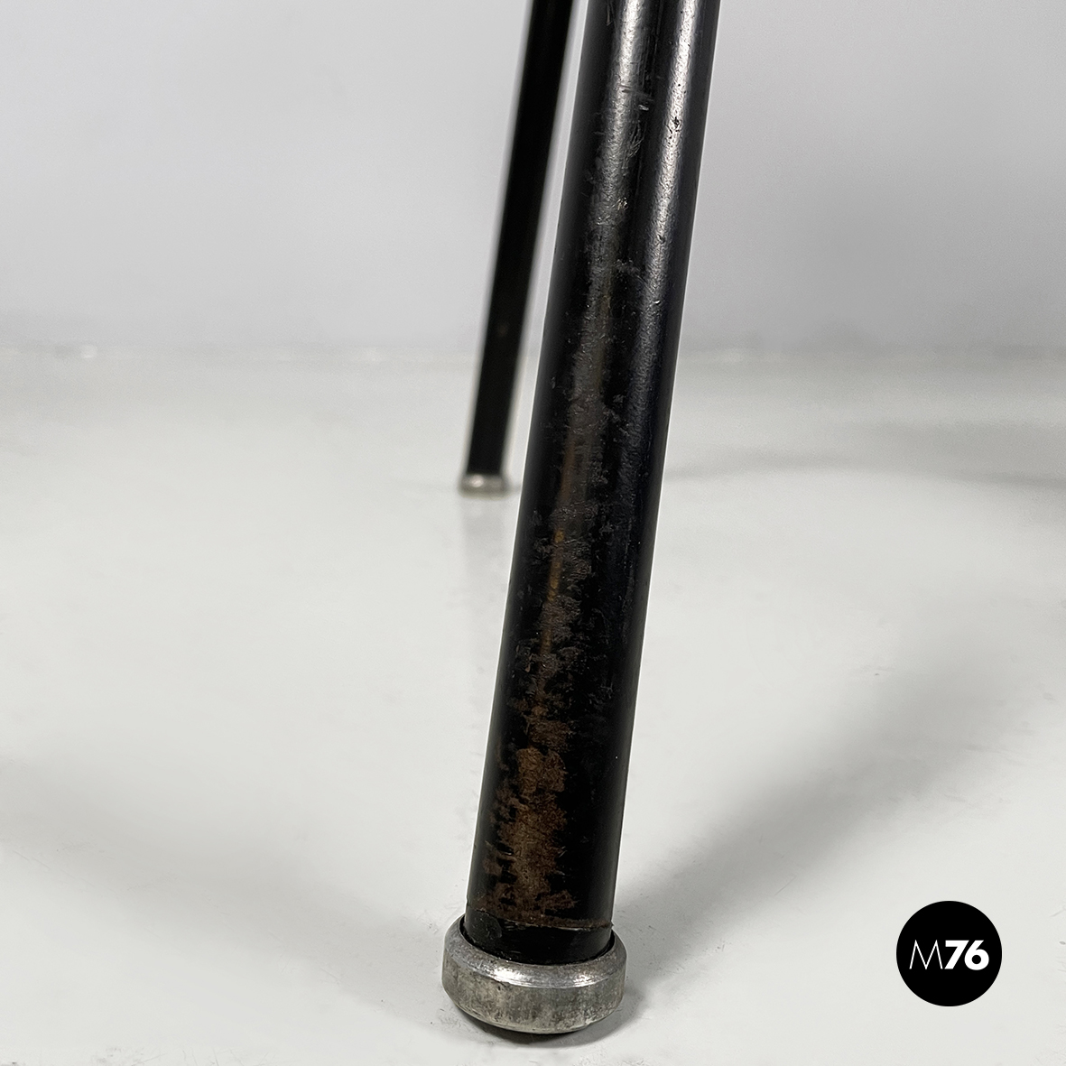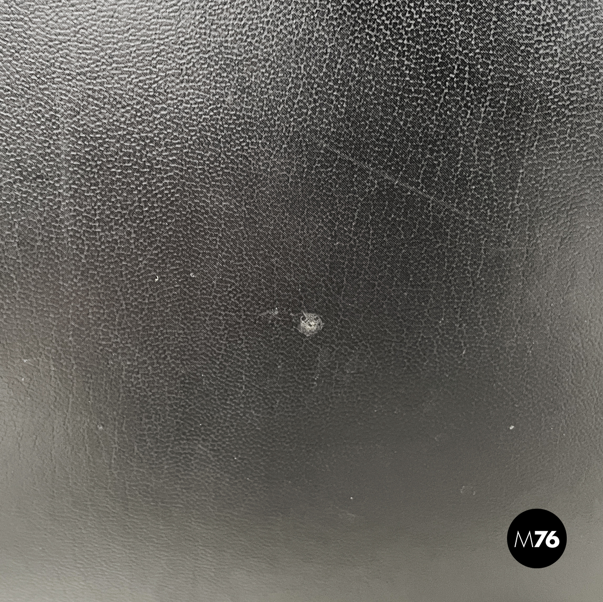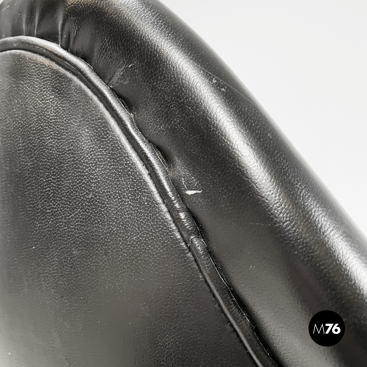 Coppia di poltrone con seduta e schienale imbottiti e rivestiti in finta pelle nera. Braccioli presenti. Le zampe a sezione tonda sono in metallo verniciato nero con piedini tondi in metallo.