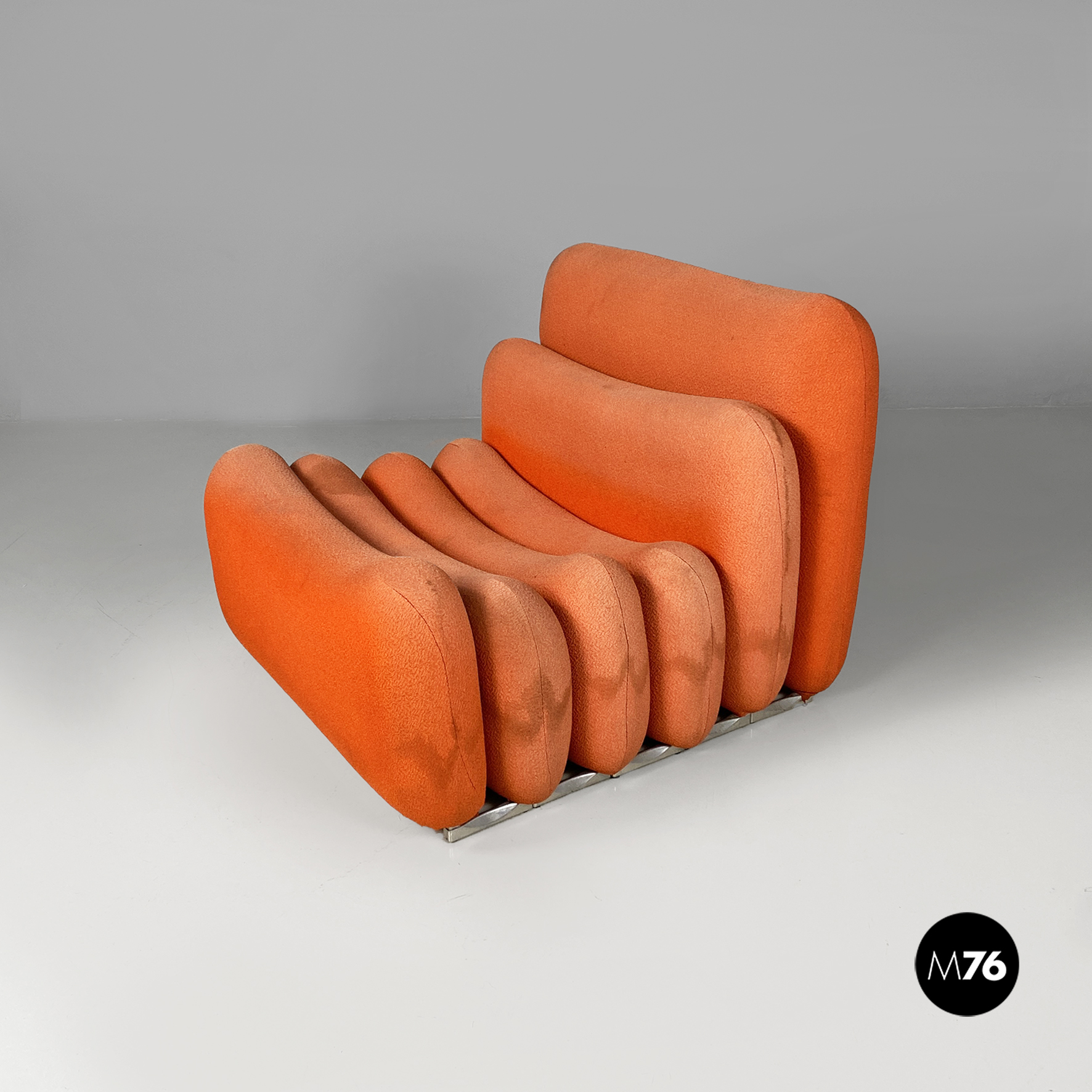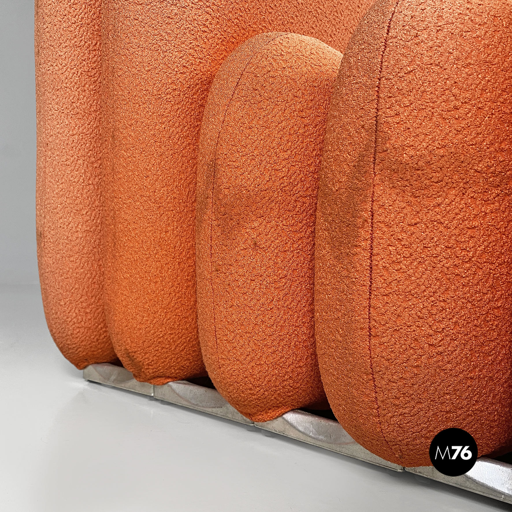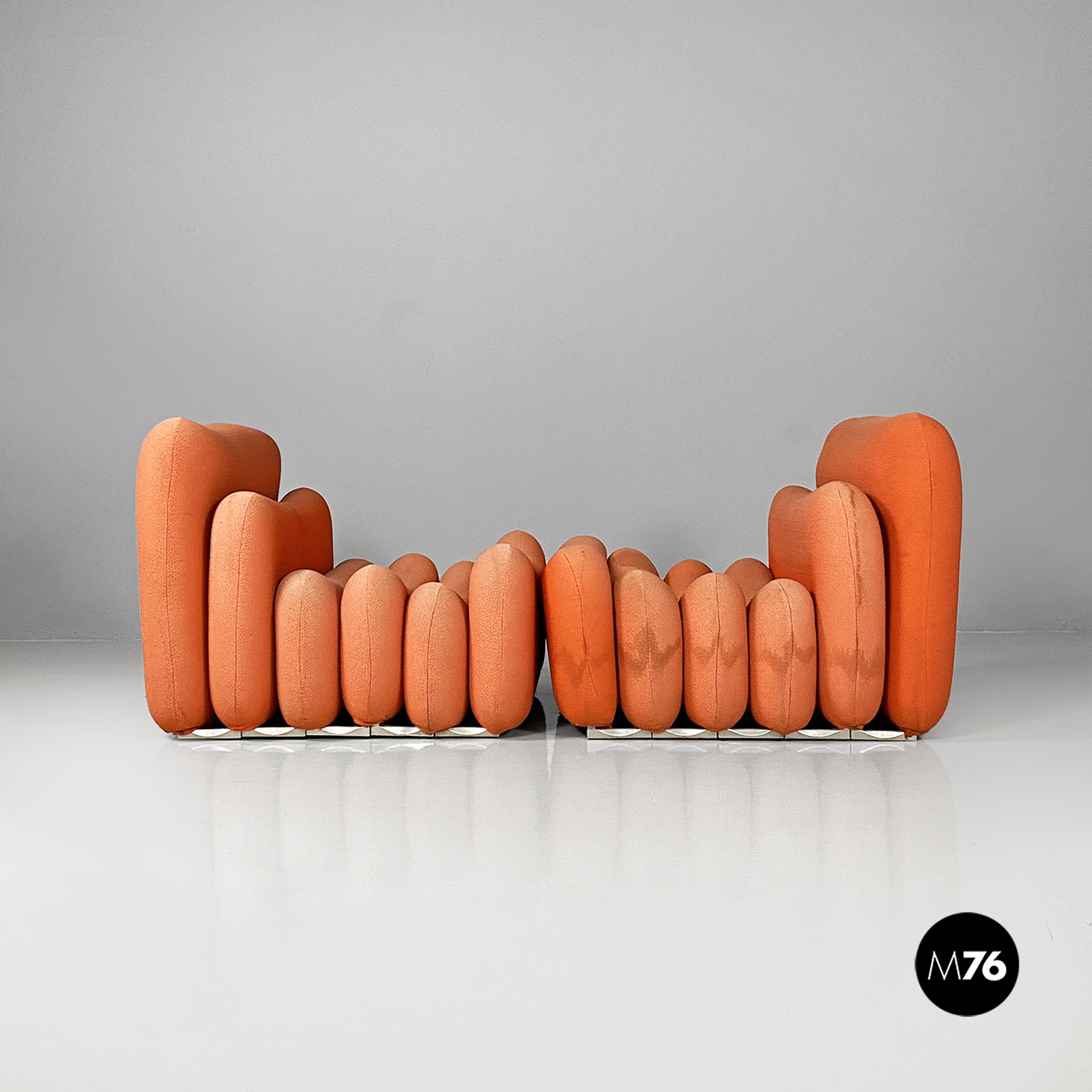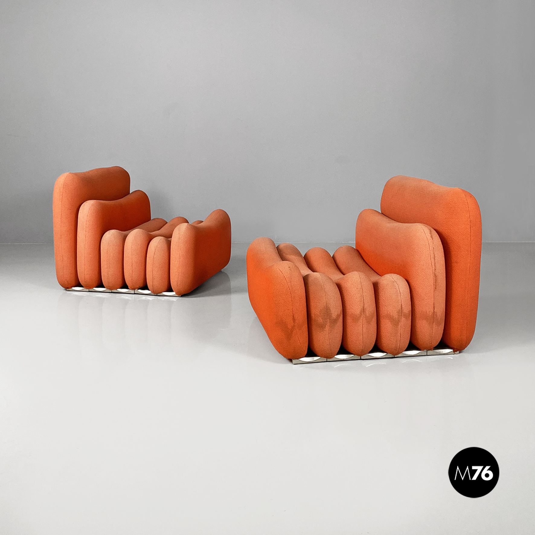 Coppia di poltrone modello Additional System, con base in alluminio e con sei cuscini ciascuna, con bordi arrotondati e di diverse dimensioni, affiancati l’uno all’altro e connessi tra loro tramite dei ganci sottoststanti che permettono di cambiare e creare la forma che più si desidera, da poltrona a chaise longue, pouf o daybed. I cuscini sono rivestiti in un tessuto color arancio salmone, originale degli anni Settanta.