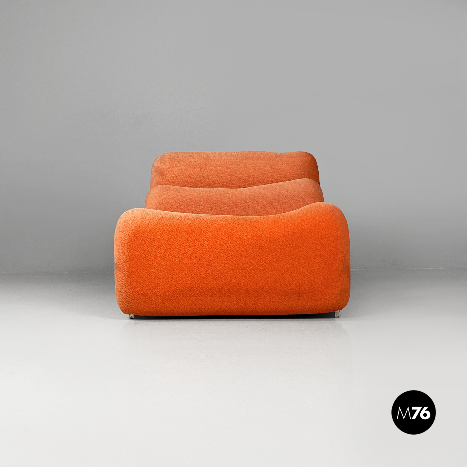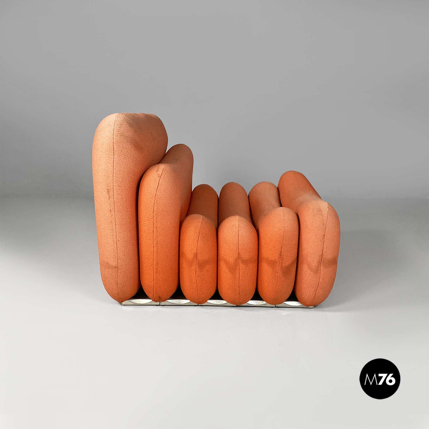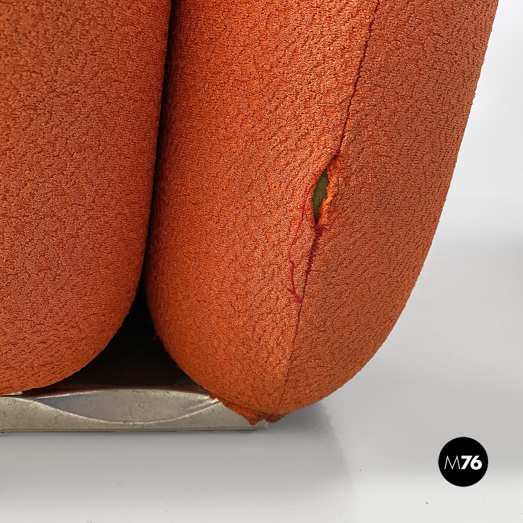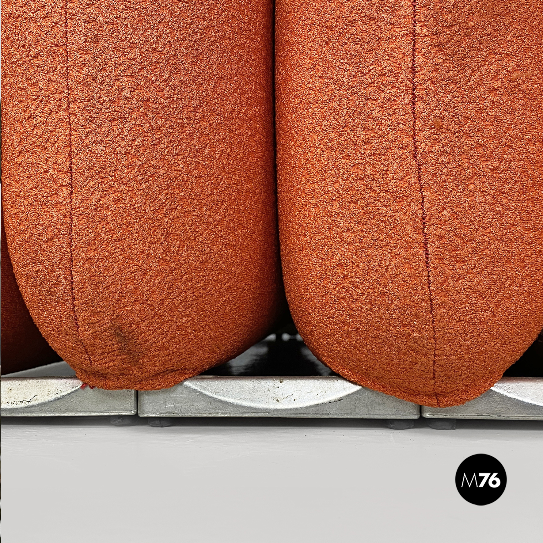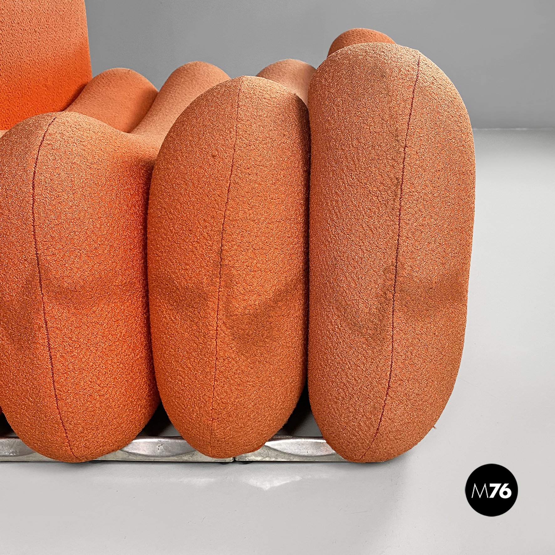 Coppia di poltrone modello Additional System, con base in alluminio e con sei cuscini ciascuna, con bordi arrotondati e di diverse dimensioni, affiancati l’uno all’altro e connessi tra loro tramite dei ganci sottoststanti che permettono di cambiare e creare la forma che più si desidera, da poltrona a chaise longue, pouf o daybed. I cuscini sono rivestiti in un tessuto color arancio salmone, originale degli anni Settanta.