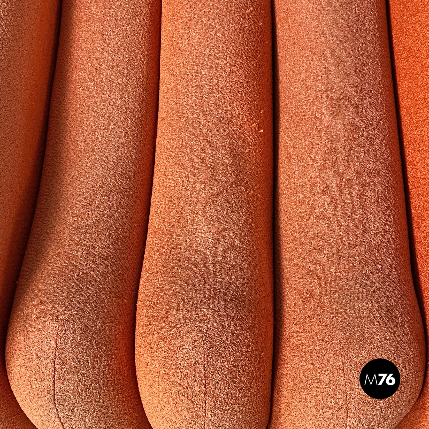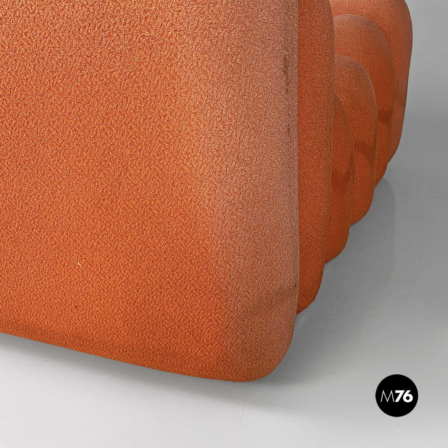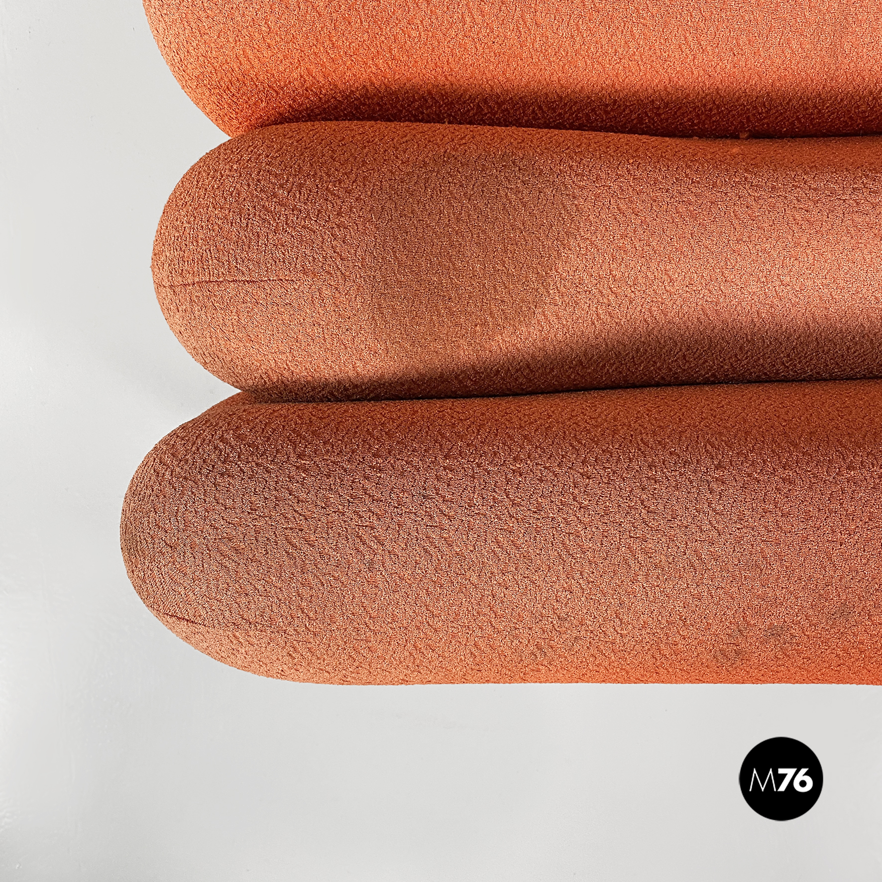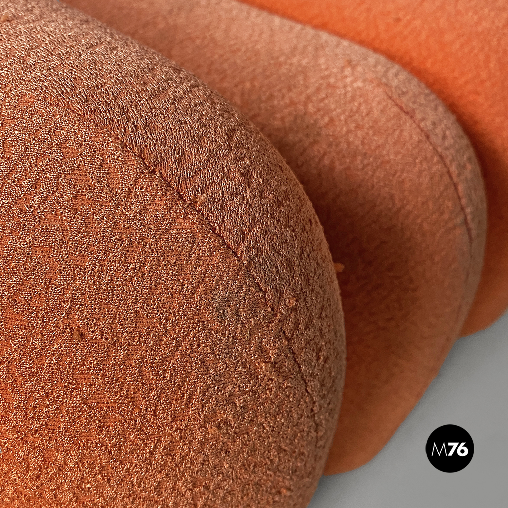 Coppia di poltrone modello Additional System, con base in alluminio e con sei cuscini ciascuna, con bordi arrotondati e di diverse dimensioni, affiancati l’uno all’altro e connessi tra loro tramite dei ganci sottoststanti che permettono di cambiare e creare la forma che più si desidera, da poltrona a chaise longue, pouf o daybed. I cuscini sono rivestiti in un tessuto color arancio salmone, originale degli anni Settanta.