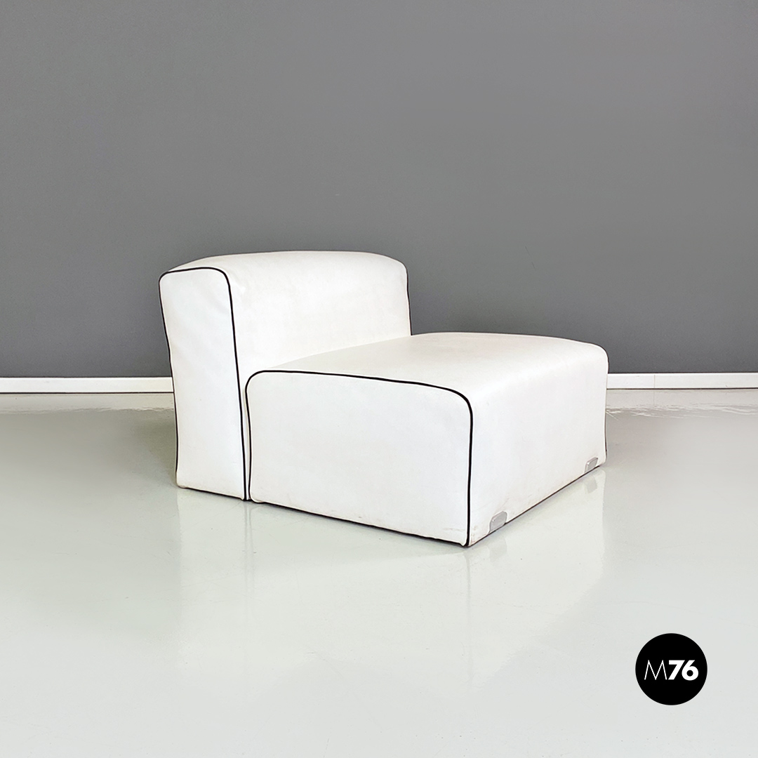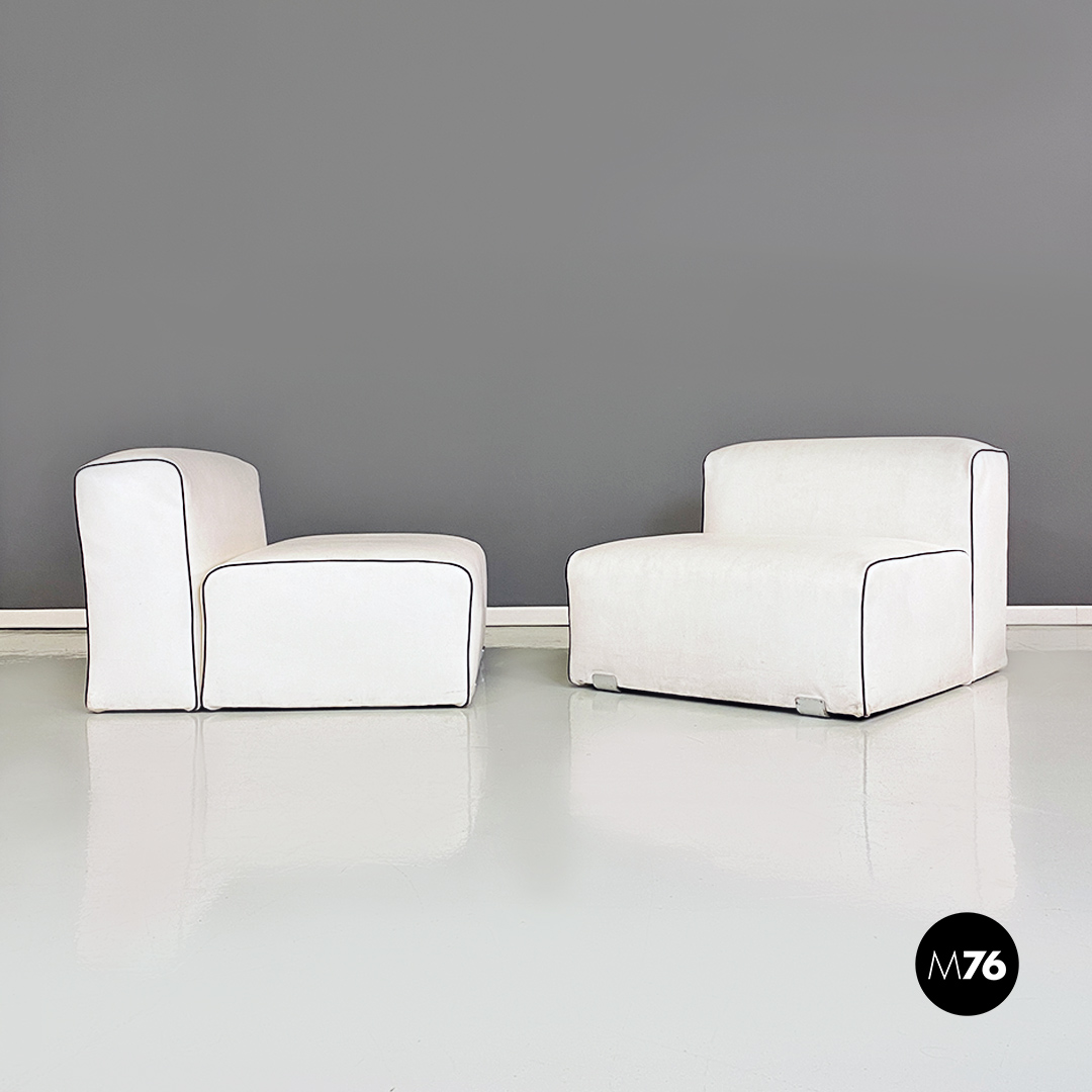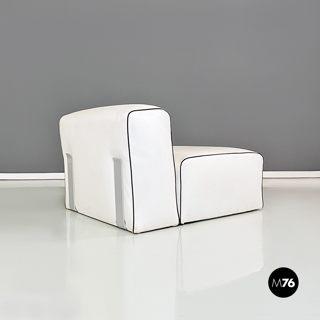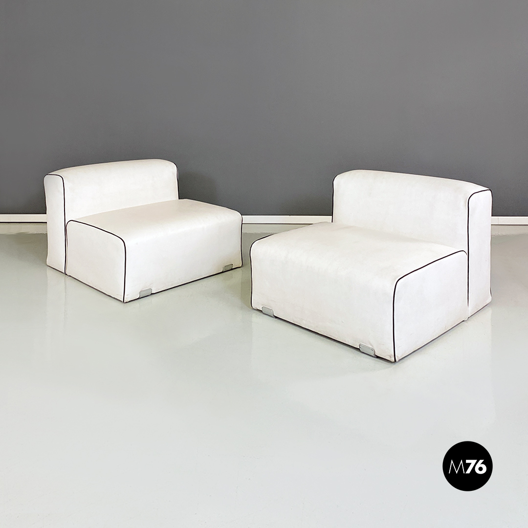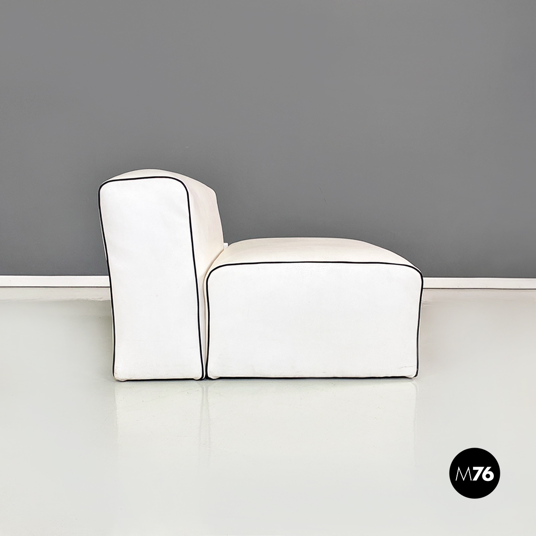 Coppia di poltrone in pelle bianca con cordino nero sul profilo, con dettagli in acciaio satinato. Insieme, compongono un divanetto due posti grazie anche al loro peso che le rende molto stabili.
