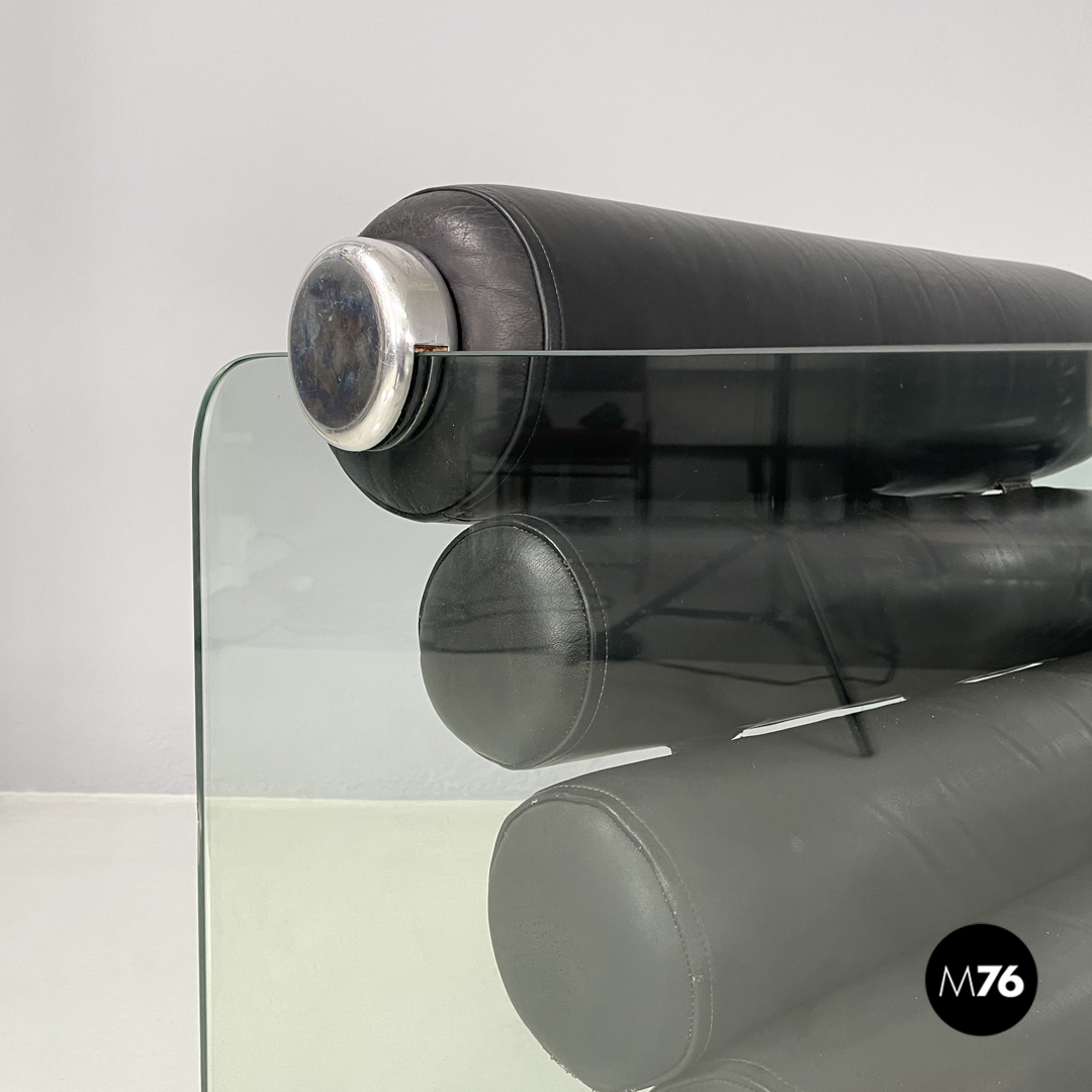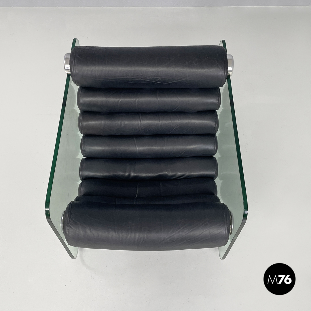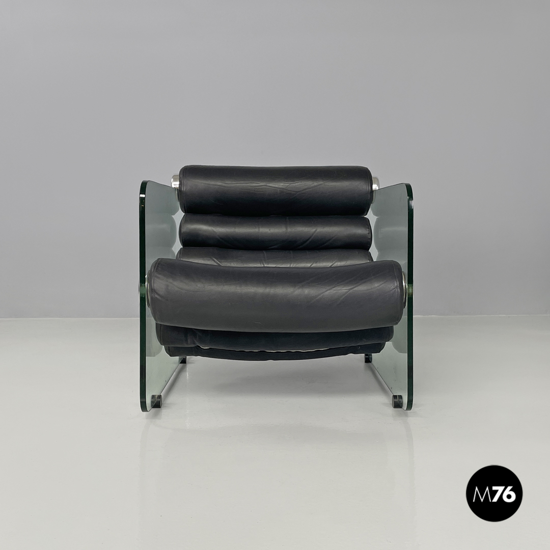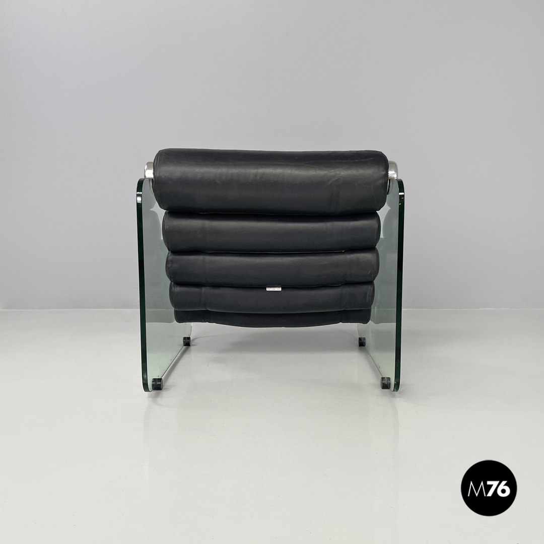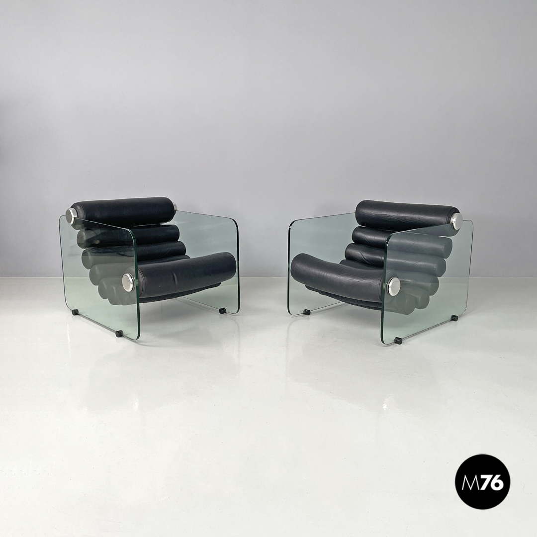 Coppia di poltrone modello Hyaline a base rettangolare. La seduta e lo schienale sono composti da vari cilindri in pelle nera imbottita, mentre la struttura portante che fa anche da braccioli e data da due lastre di vetro rettangolari. La seduta e lo schienale sono collegati alla struttura in vetro tramite quattro supporti di forma tonda, i due frontali fissi e due posteriori, su una delle due poltrone è possibile modificare l’inclinazione dello schienale. Ogni poltrona presenta quattro piedini tondi in plastica nera.