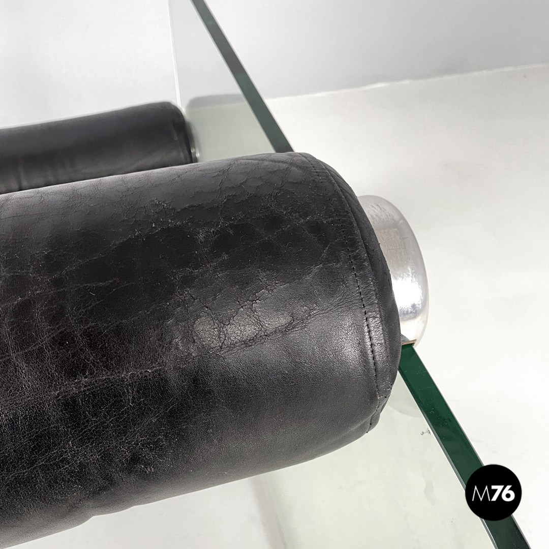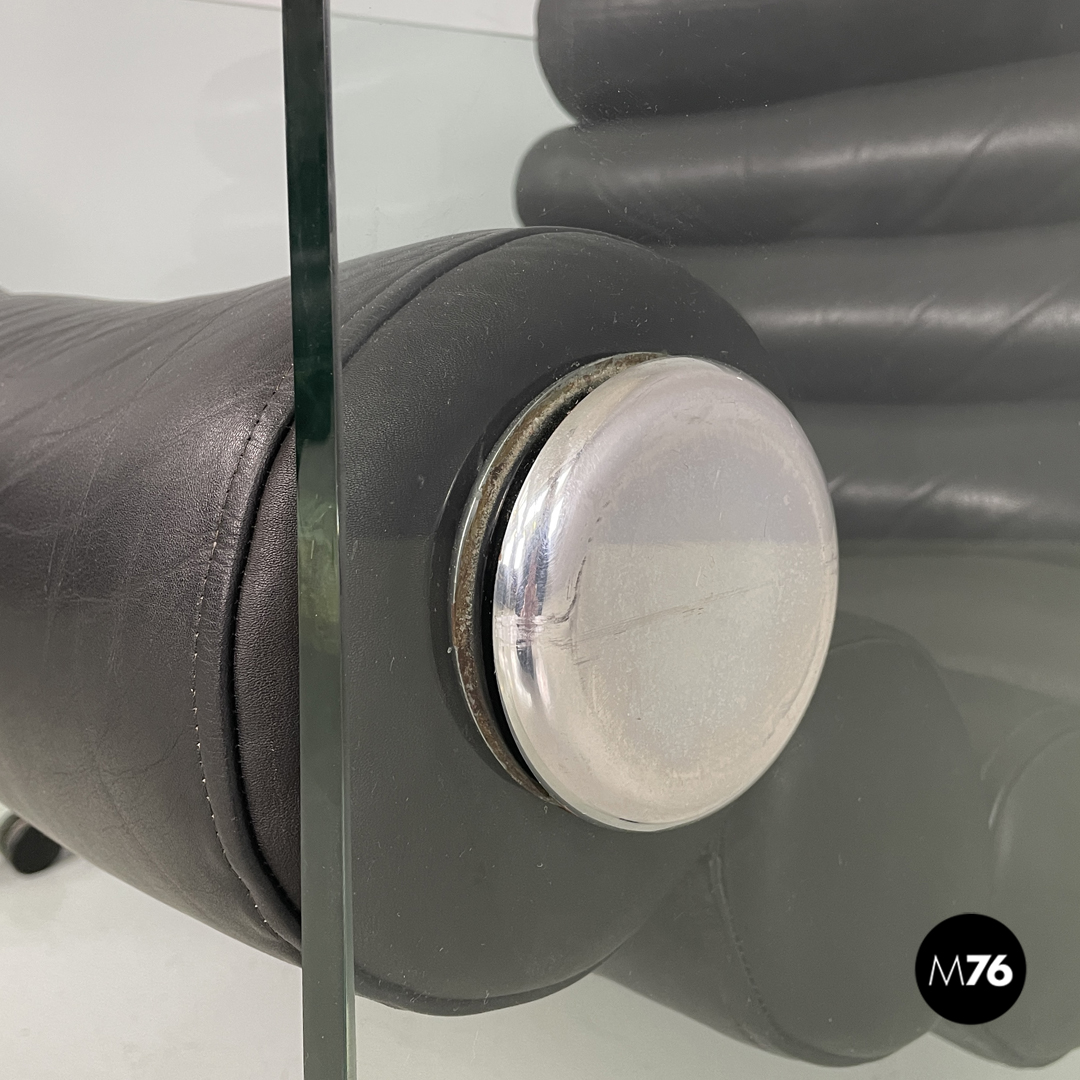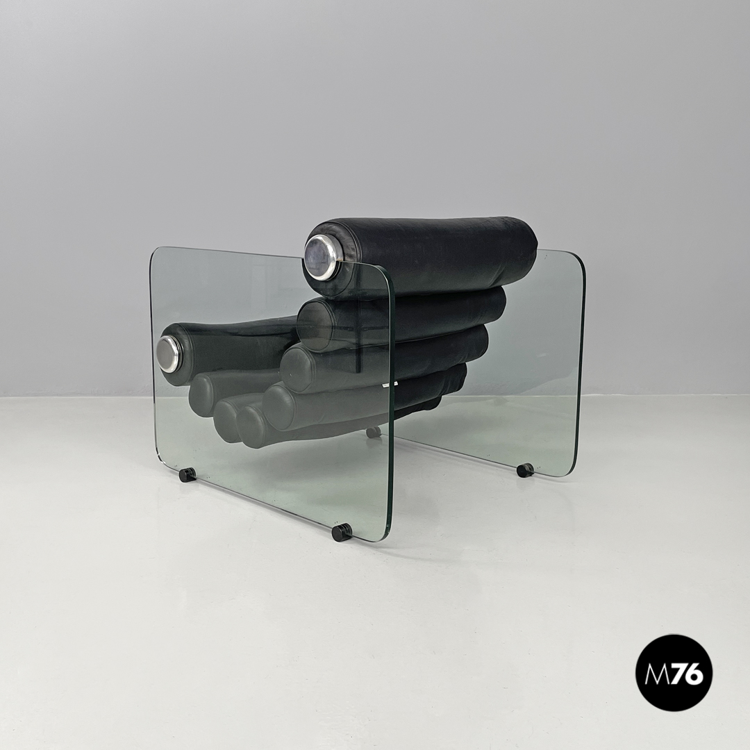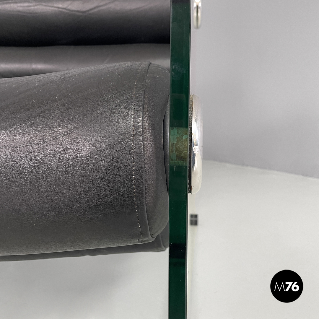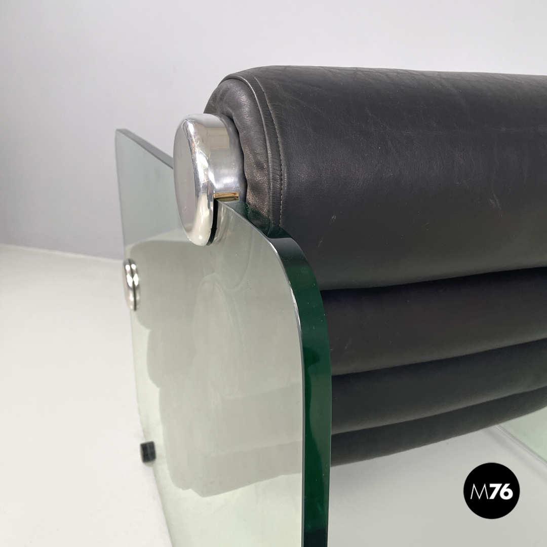 Coppia di poltrone modello Hyaline a base rettangolare. La seduta e lo schienale sono composti da vari cilindri in pelle nera imbottita, mentre la struttura portante che fa anche da braccioli e data da due lastre di vetro rettangolari. La seduta e lo schienale sono collegati alla struttura in vetro tramite quattro supporti di forma tonda, i due frontali fissi e due posteriori, su una delle due poltrone è possibile modificare l’inclinazione dello schienale. Ogni poltrona presenta quattro piedini tondi in plastica nera.