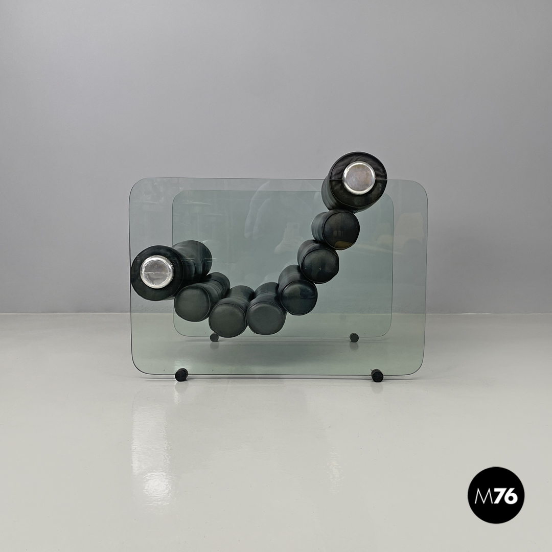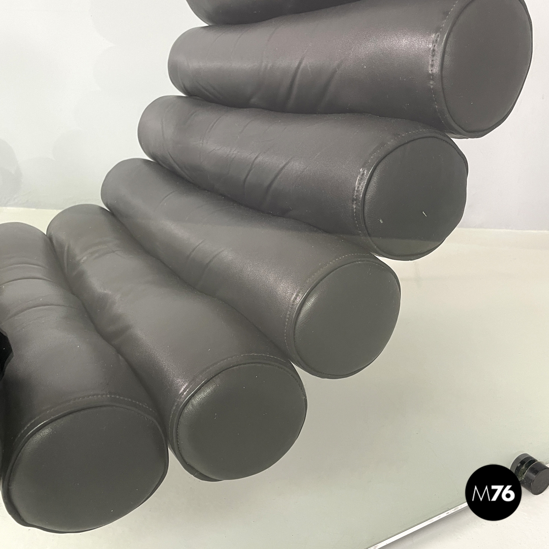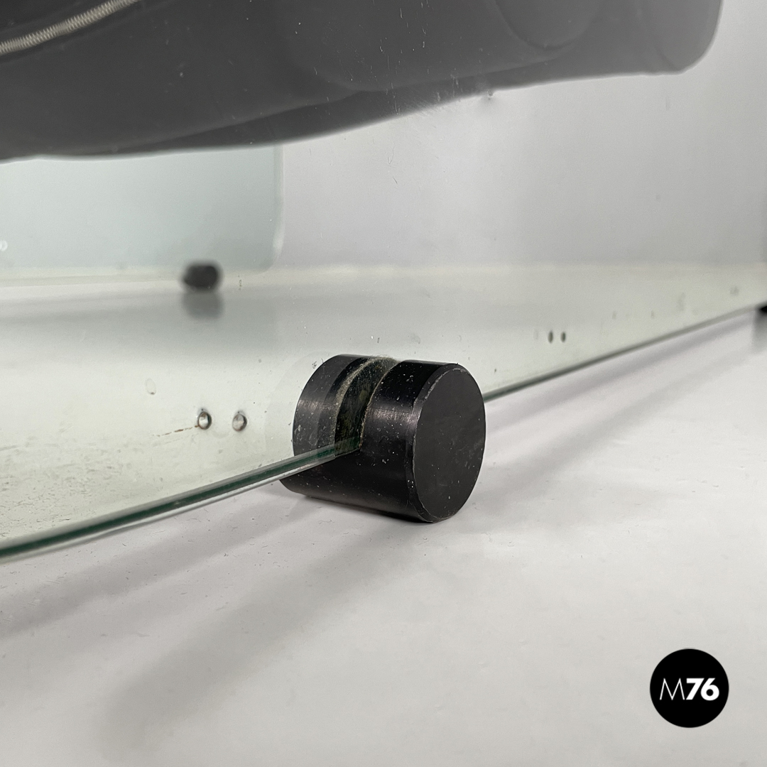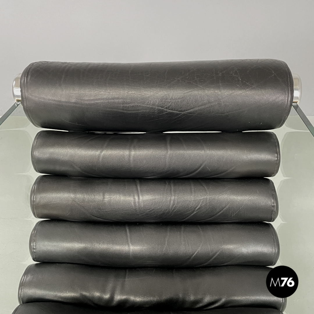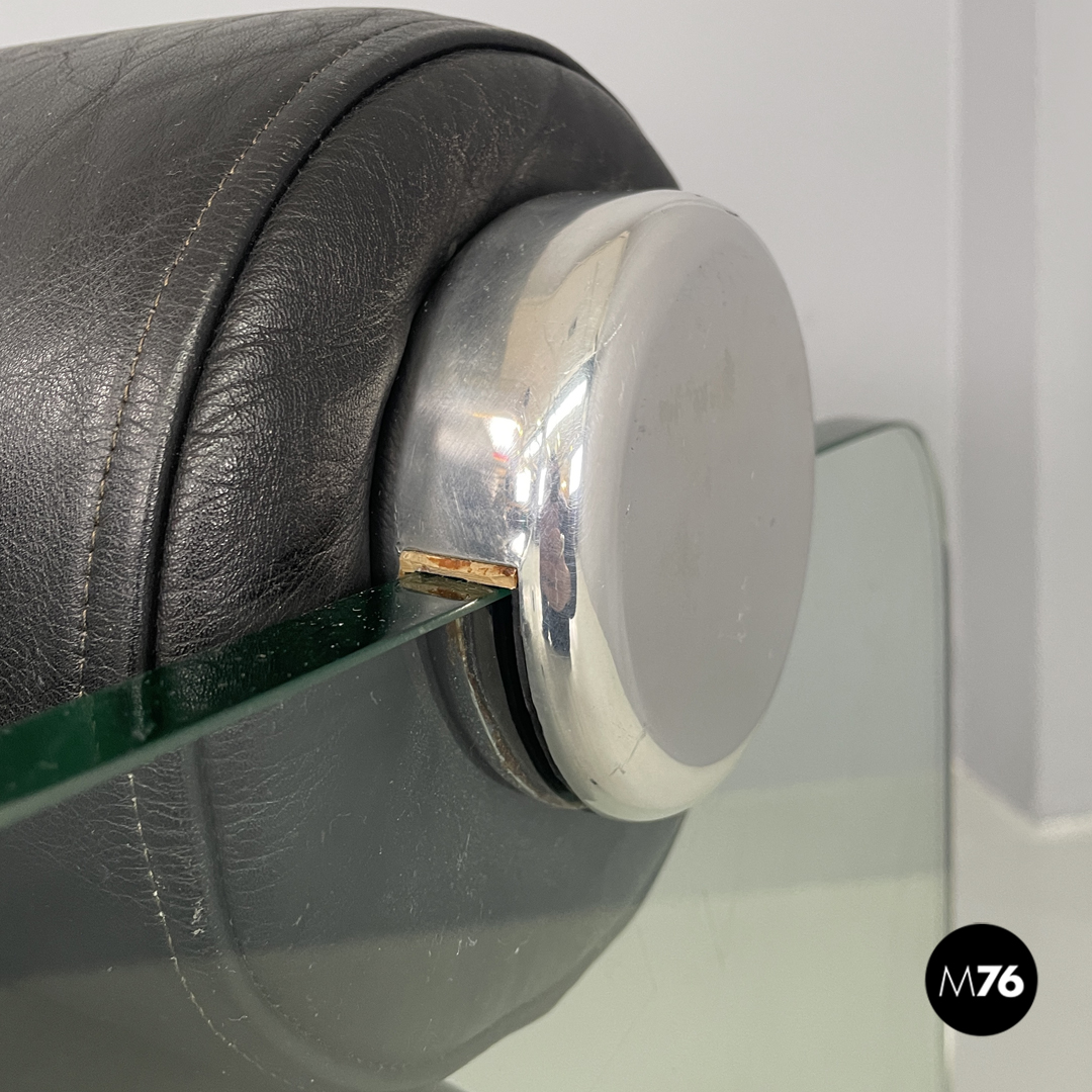 Coppia di poltrone modello Hyaline a base rettangolare. La seduta e lo schienale sono composti da vari cilindri in pelle nera imbottita, mentre la struttura portante che fa anche da braccioli e data da due lastre di vetro rettangolari. La seduta e lo schienale sono collegati alla struttura in vetro tramite quattro supporti di forma tonda, i due frontali fissi e due posteriori, su una delle due poltrone è possibile modificare l’inclinazione dello schienale. Ogni poltrona presenta quattro piedini tondi in plastica nera.