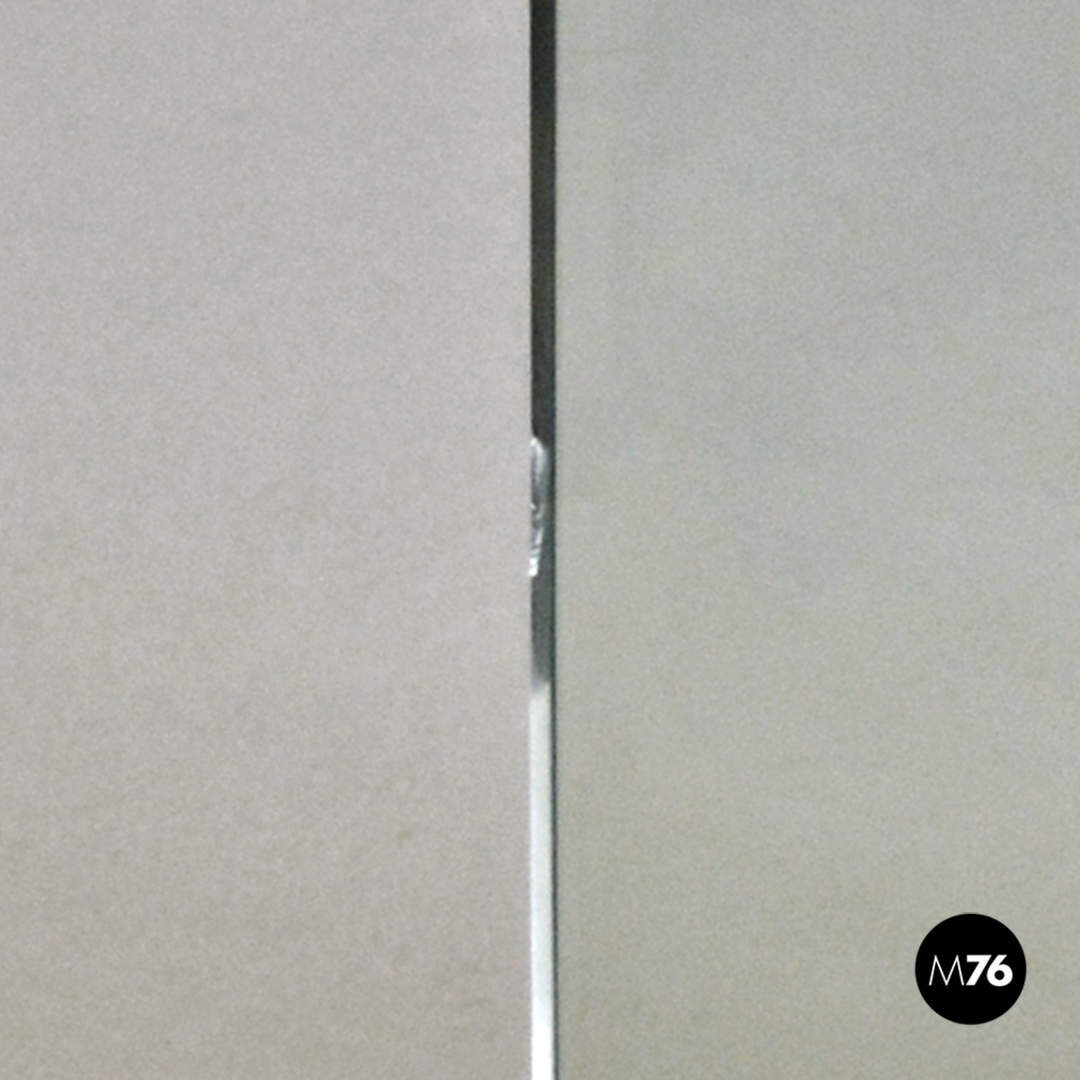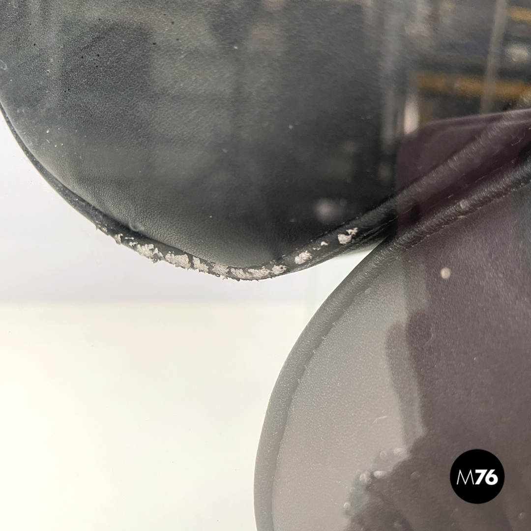 Buone condizioni, con segni dell’uso e del tempo sparsi, con piccoli fori nel vetro. Su una poltrona è presente una mancanza sulla struttura in vetro sul retro dello schienale, sull’altra la pelle è rovinata nella parte alta dello schienale e con una mancanza del vetro sul retro dello schienale.