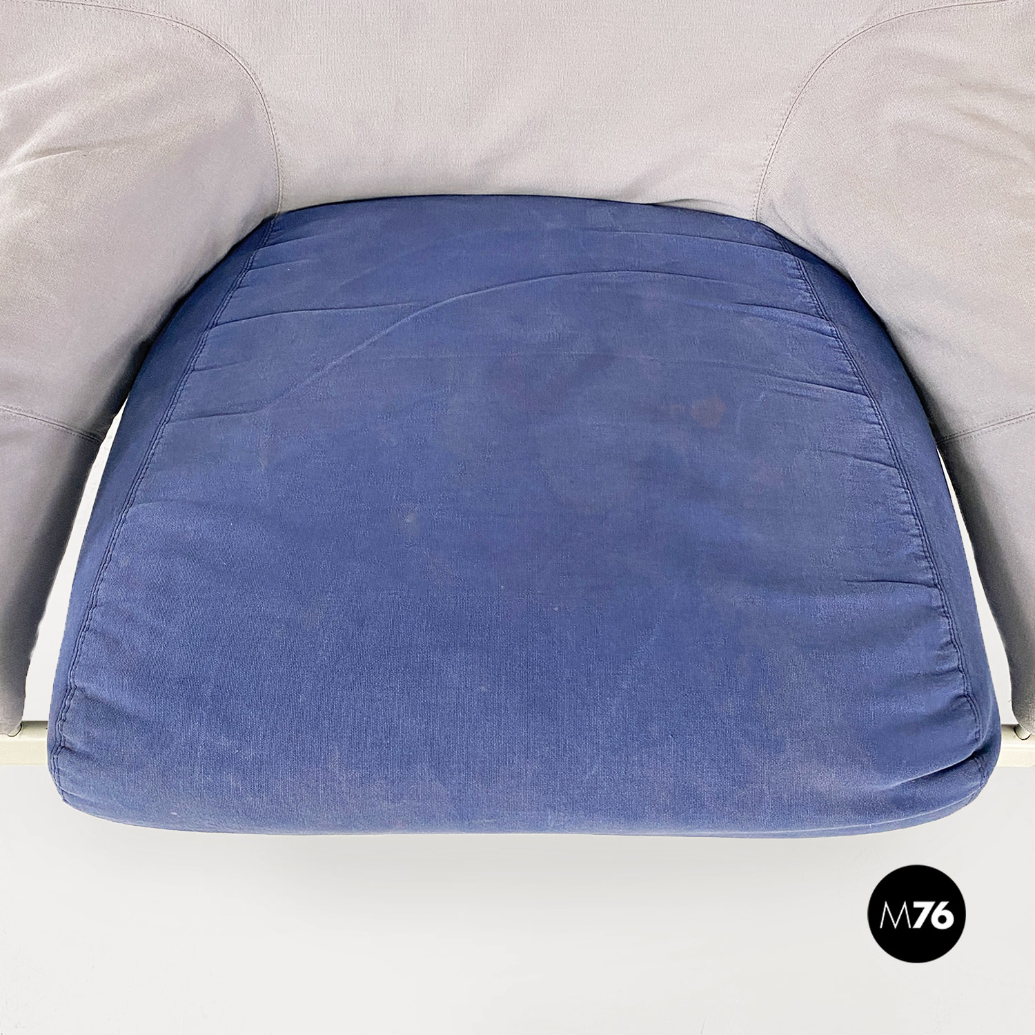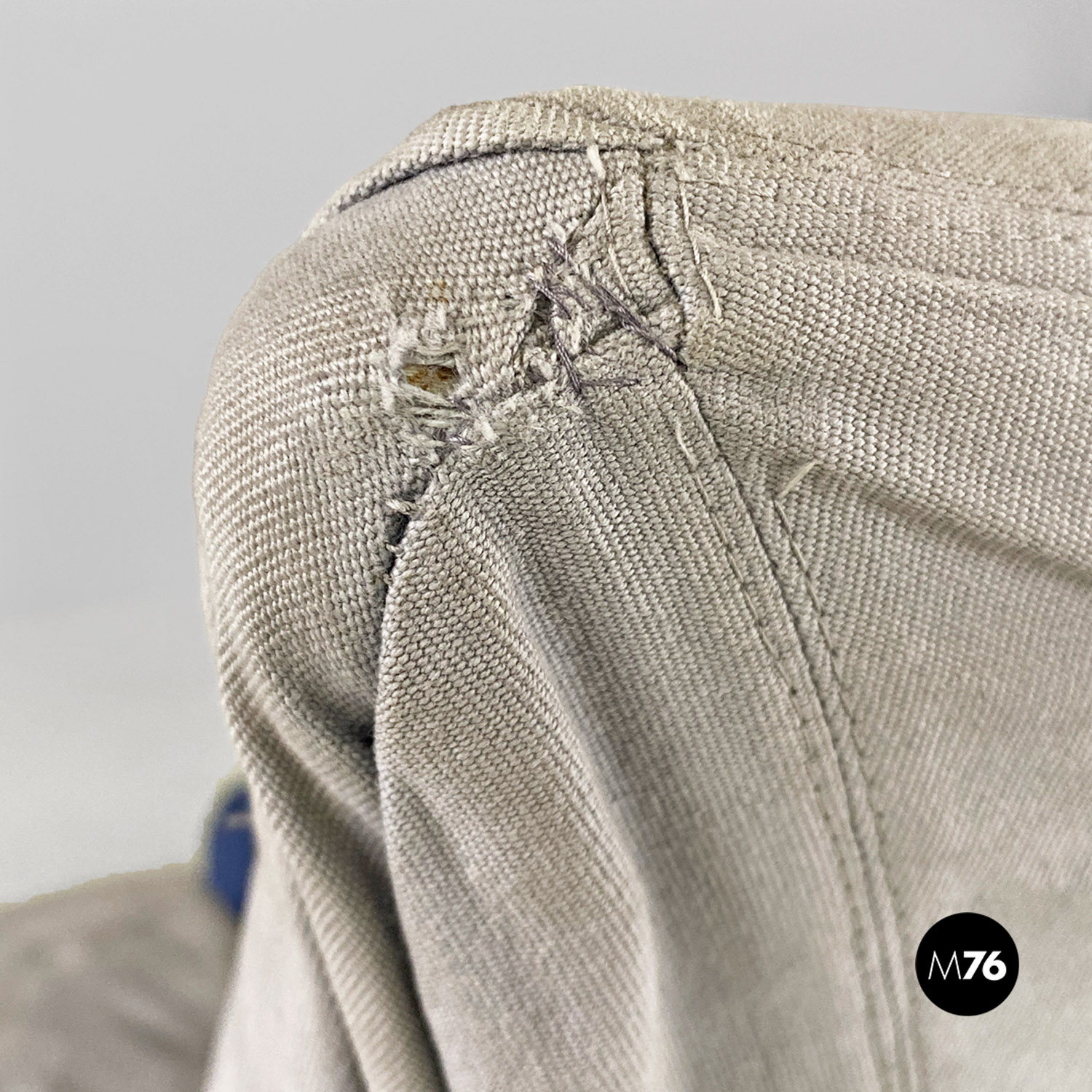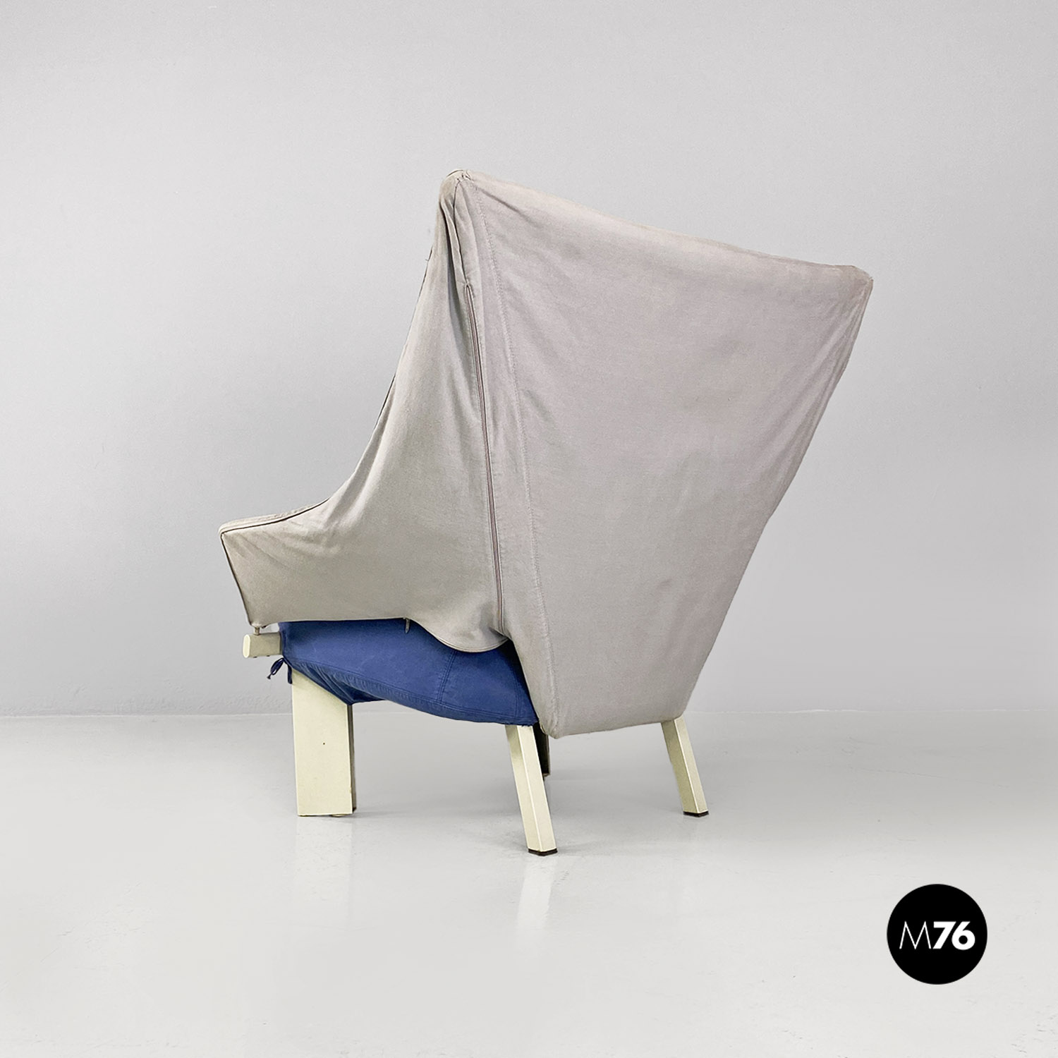 Poltrone con zampe in legno sfalsate verniciate in bianco panna, schienale alto in tela di cotone grigio, sia sul fronte che sul retro e seduta in blu interamente in tessuto originale dell’epoca.