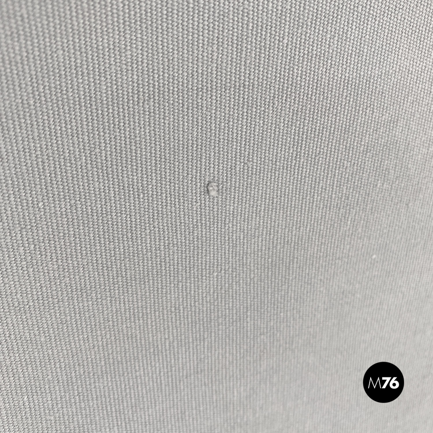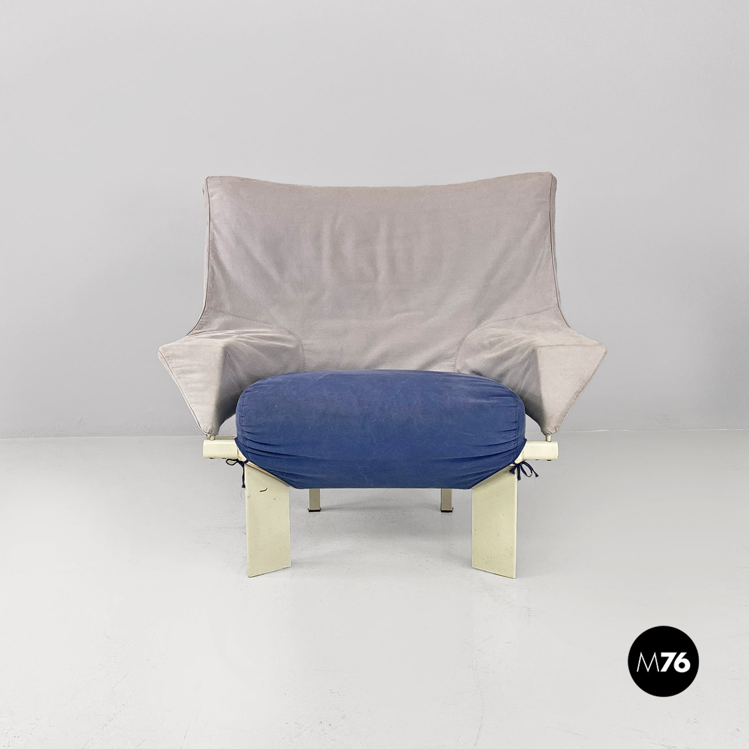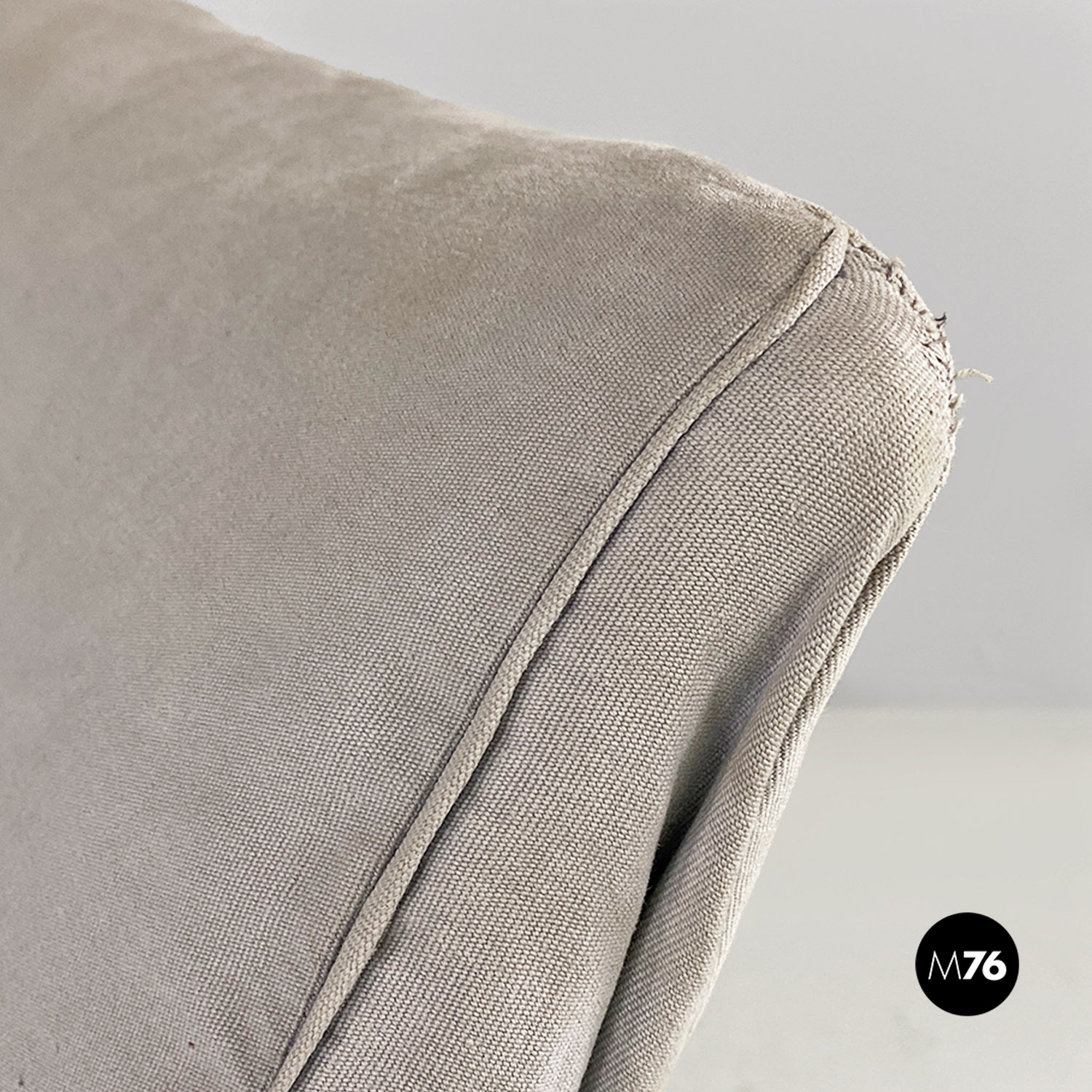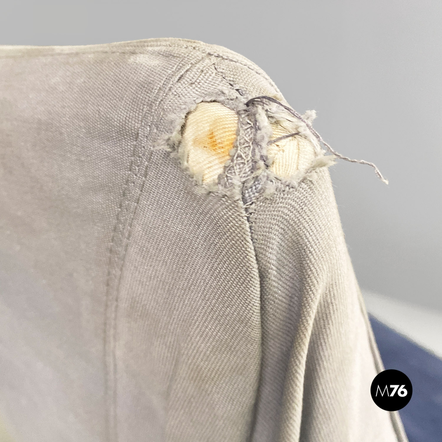 Poltrone con zampe in legno sfalsate verniciate in bianco panna, schienale alto in tela di cotone grigio, sia sul fronte che sul retro e seduta in blu interamente in tessuto originale dell’epoca.
