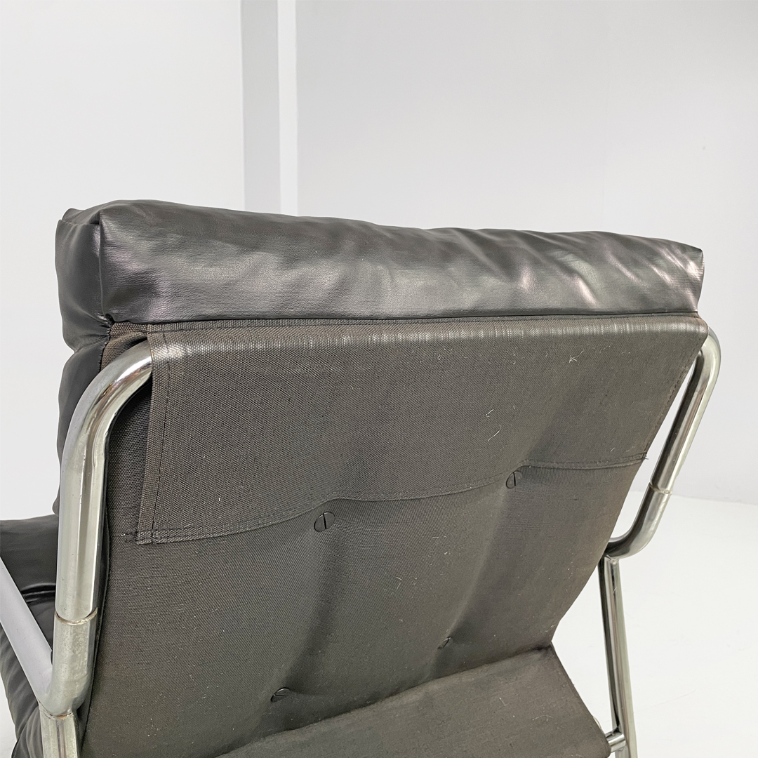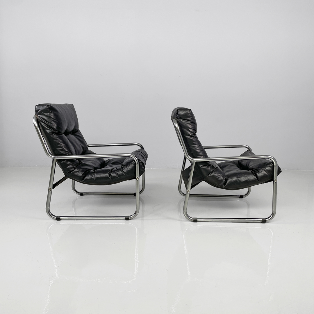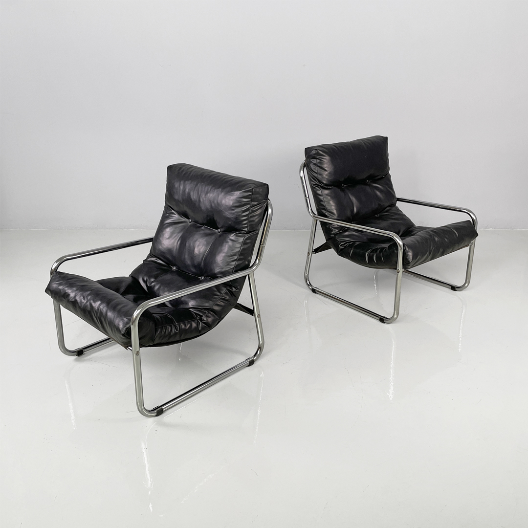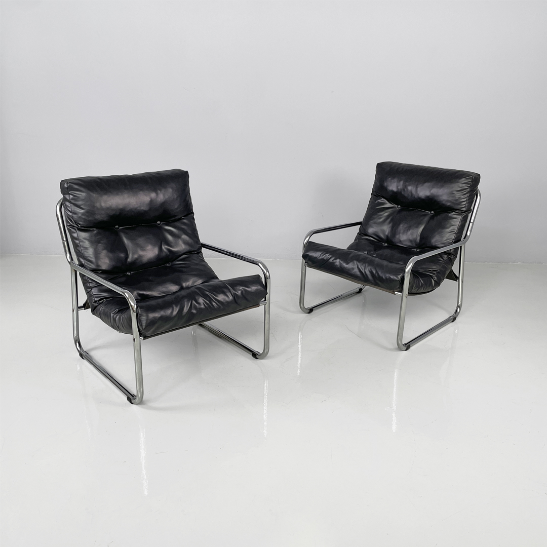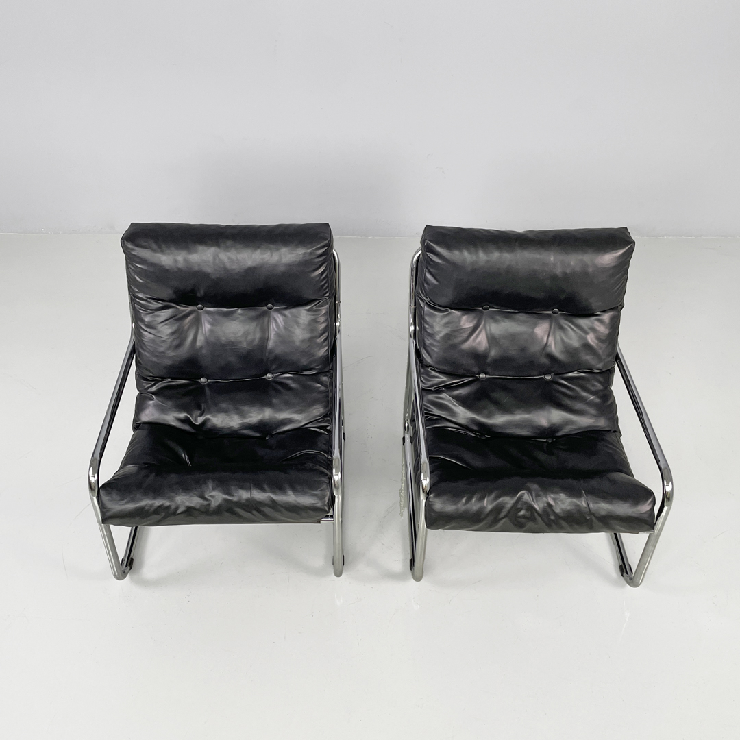 Coppia di poltrone in pelle sintetica colore nero. Un unico cuscino imbottito e con otto bottoni compone la seduta e lo schienale, il retro è in tessuto nero. La struttura è in tubolare di metallo cromato e presenta piedini a sella. Sono disponibili ulteriori due poltrone.