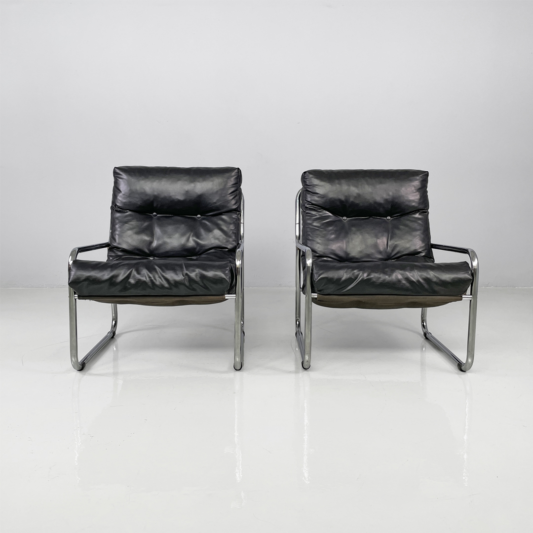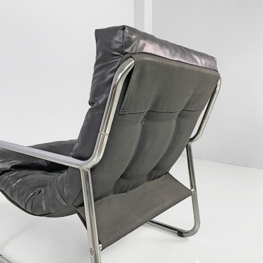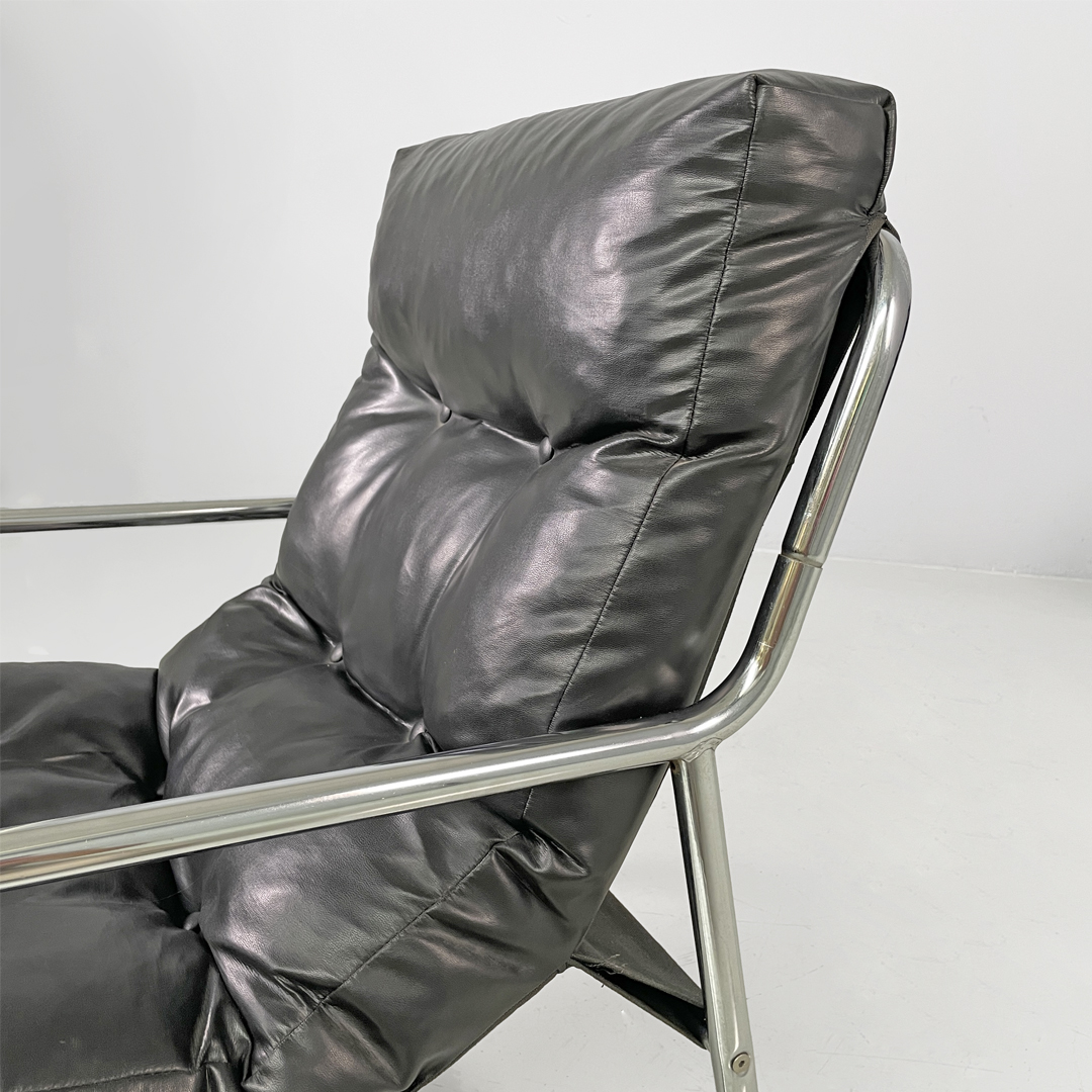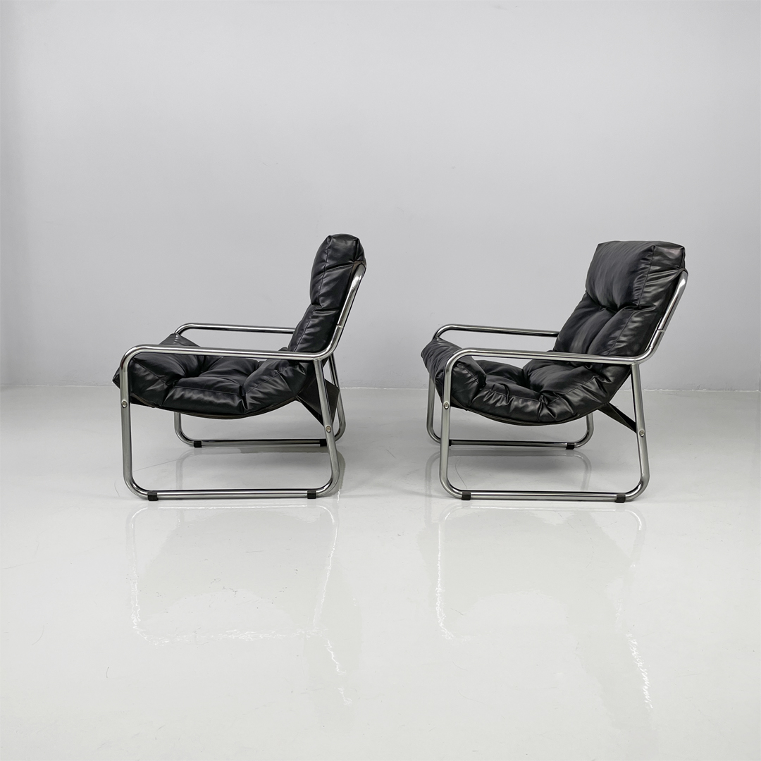Coppia di poltrone in pelle sintetica colore nero. Un unico cuscino imbottito e con otto bottoni compone la seduta e lo schienale, il retro è in tessuto nero. La struttura è in tubolare di metallo cromato e presenta piedini a sella. Sono disponibili ulteriori due poltrone.