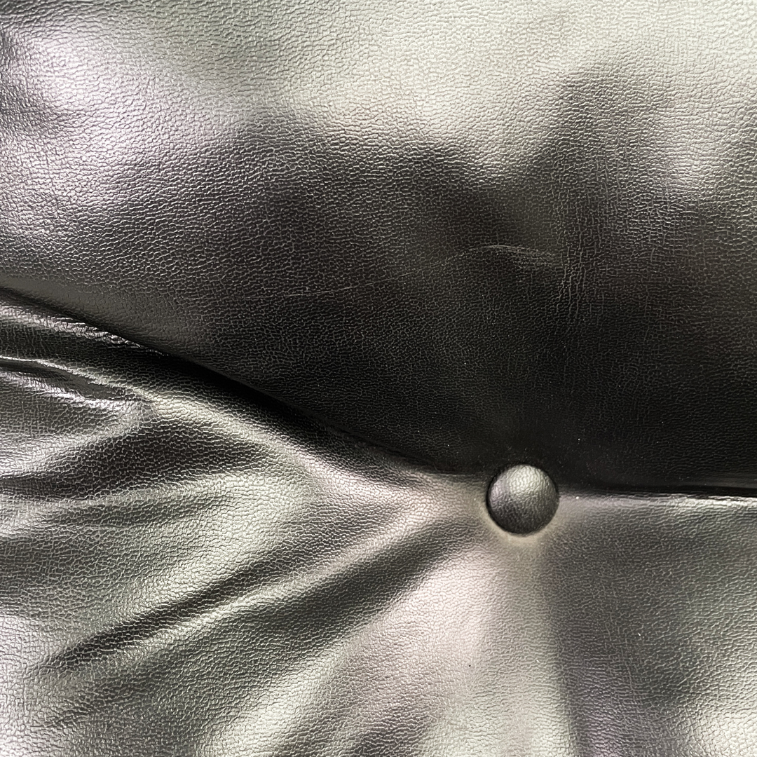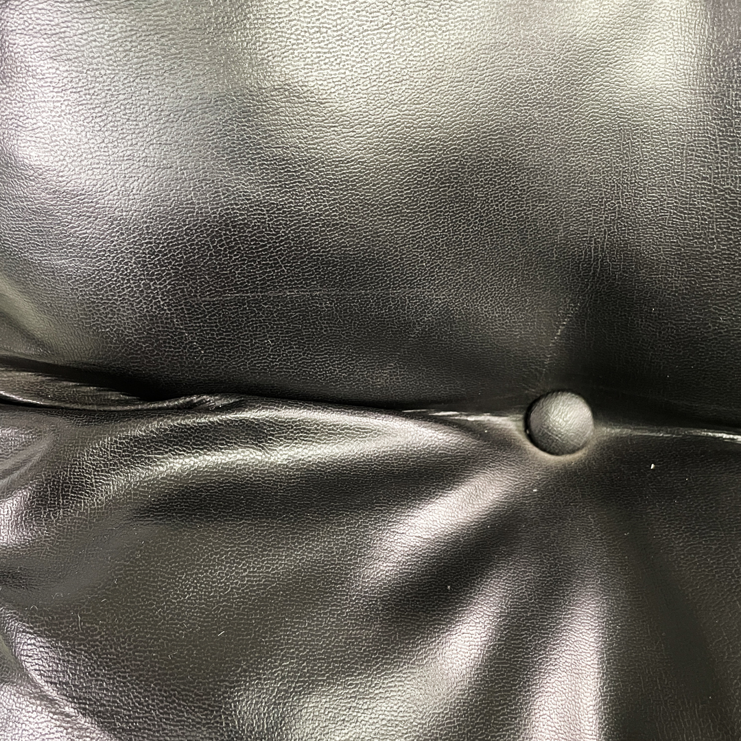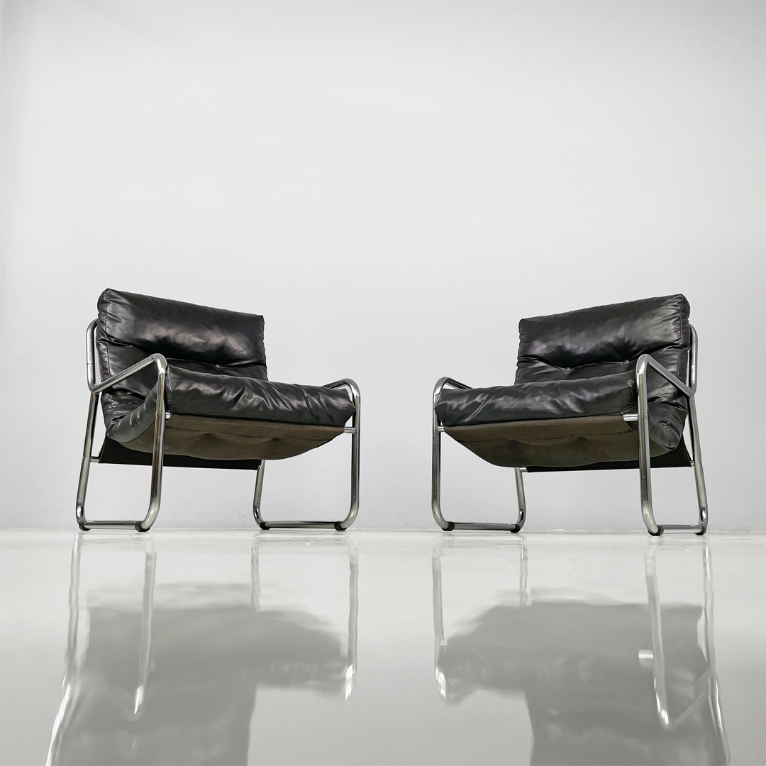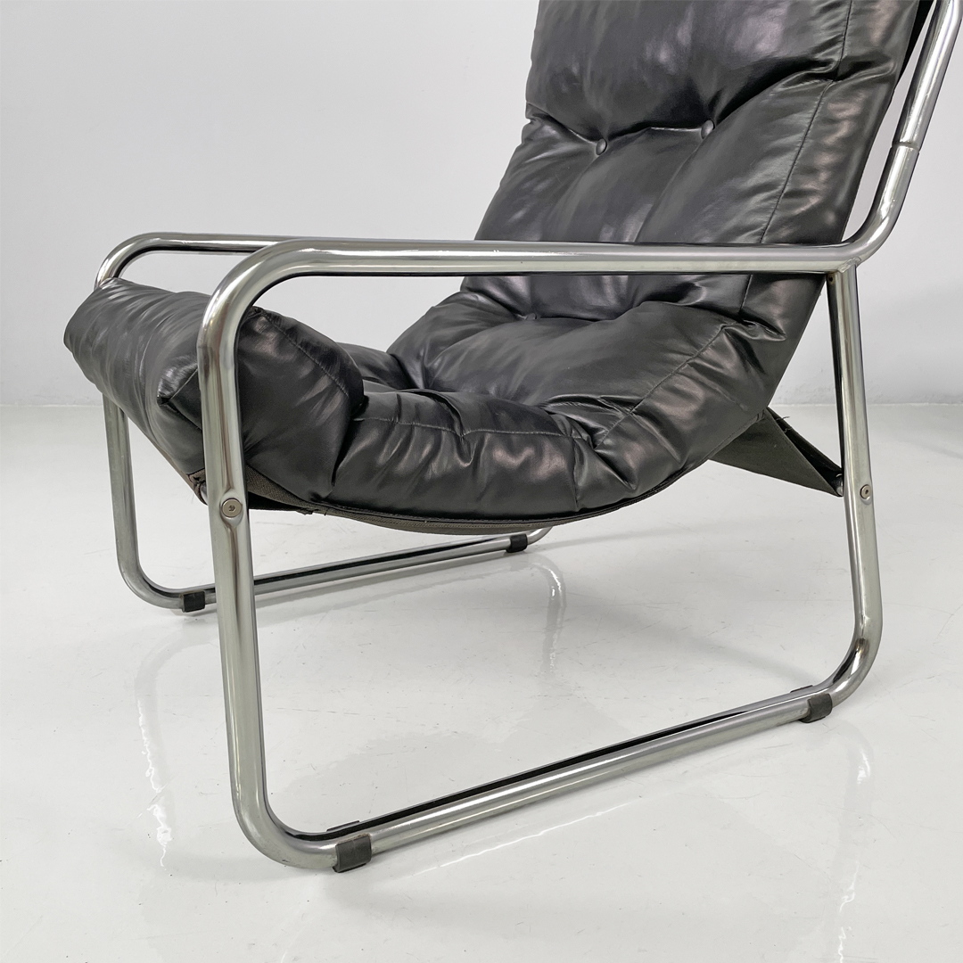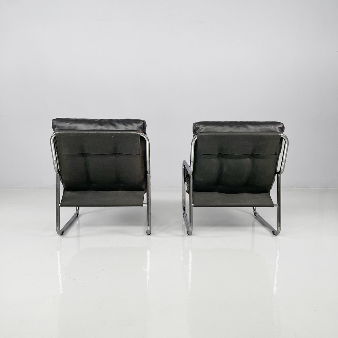 Coppia di poltrone in pelle sintetica colore nero. Un unico cuscino imbottito e con otto bottoni compone la seduta e lo schienale, il retro è in tessuto nero. La struttura è in tubolare di metallo cromato e presenta piedini a sella. Sono disponibili ulteriori due poltrone.