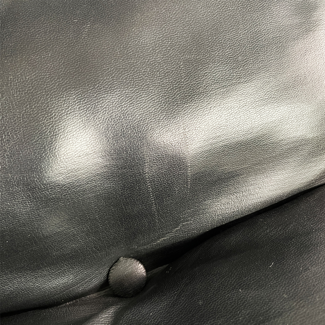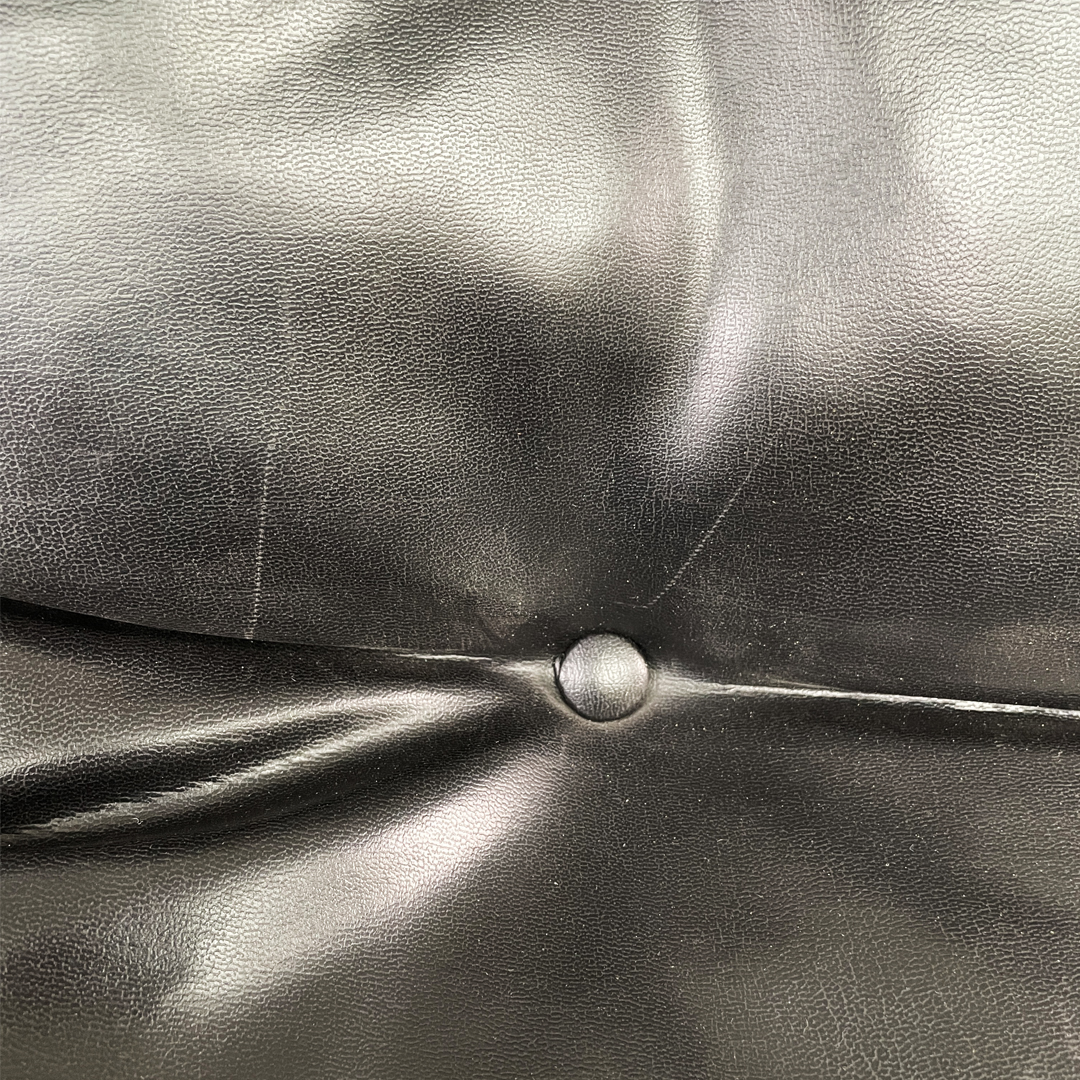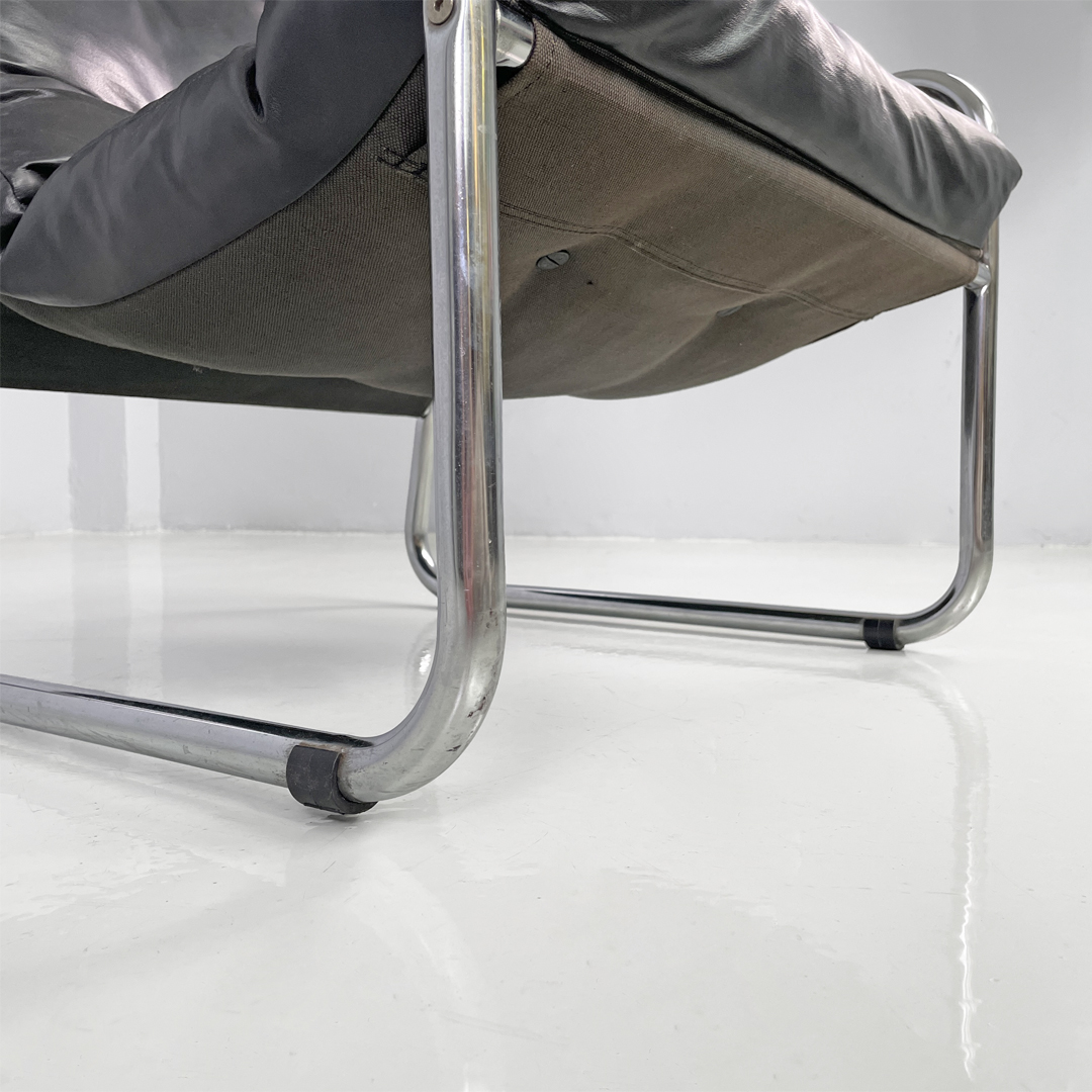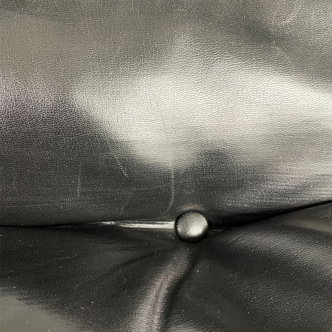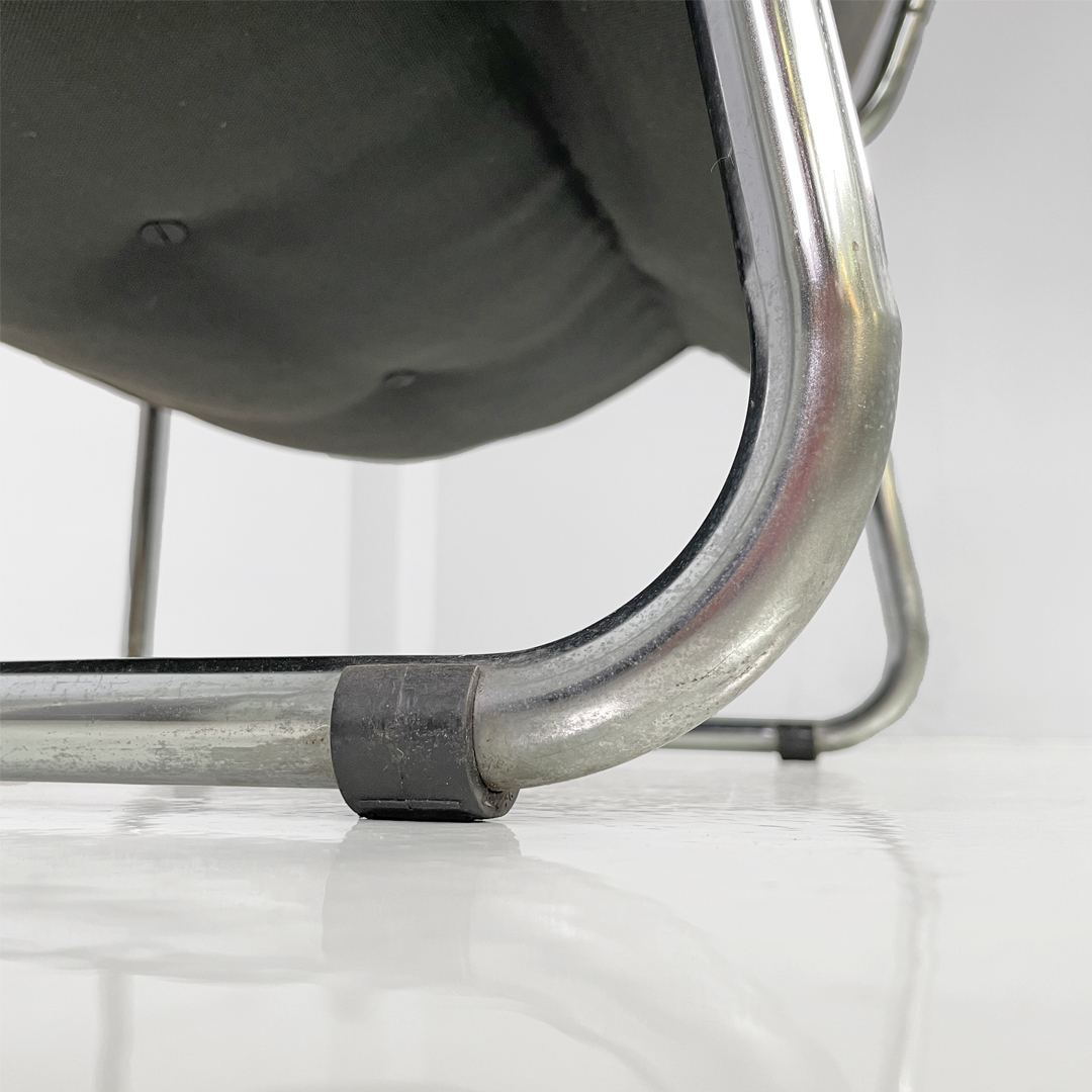 Coppia di poltrone in pelle sintetica colore nero. Un unico cuscino imbottito e con otto bottoni compone la seduta e lo schienale, il retro è in tessuto nero. La struttura è in tubolare di metallo cromato e presenta piedini a sella. Sono disponibili ulteriori due poltrone.