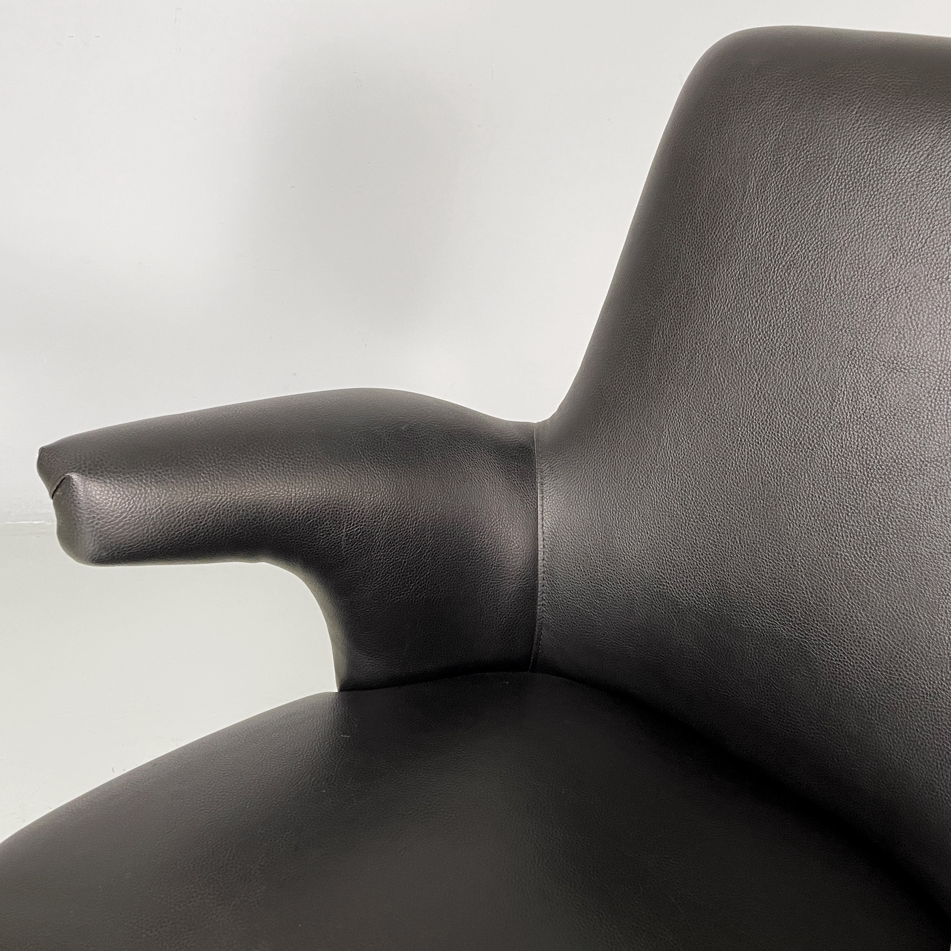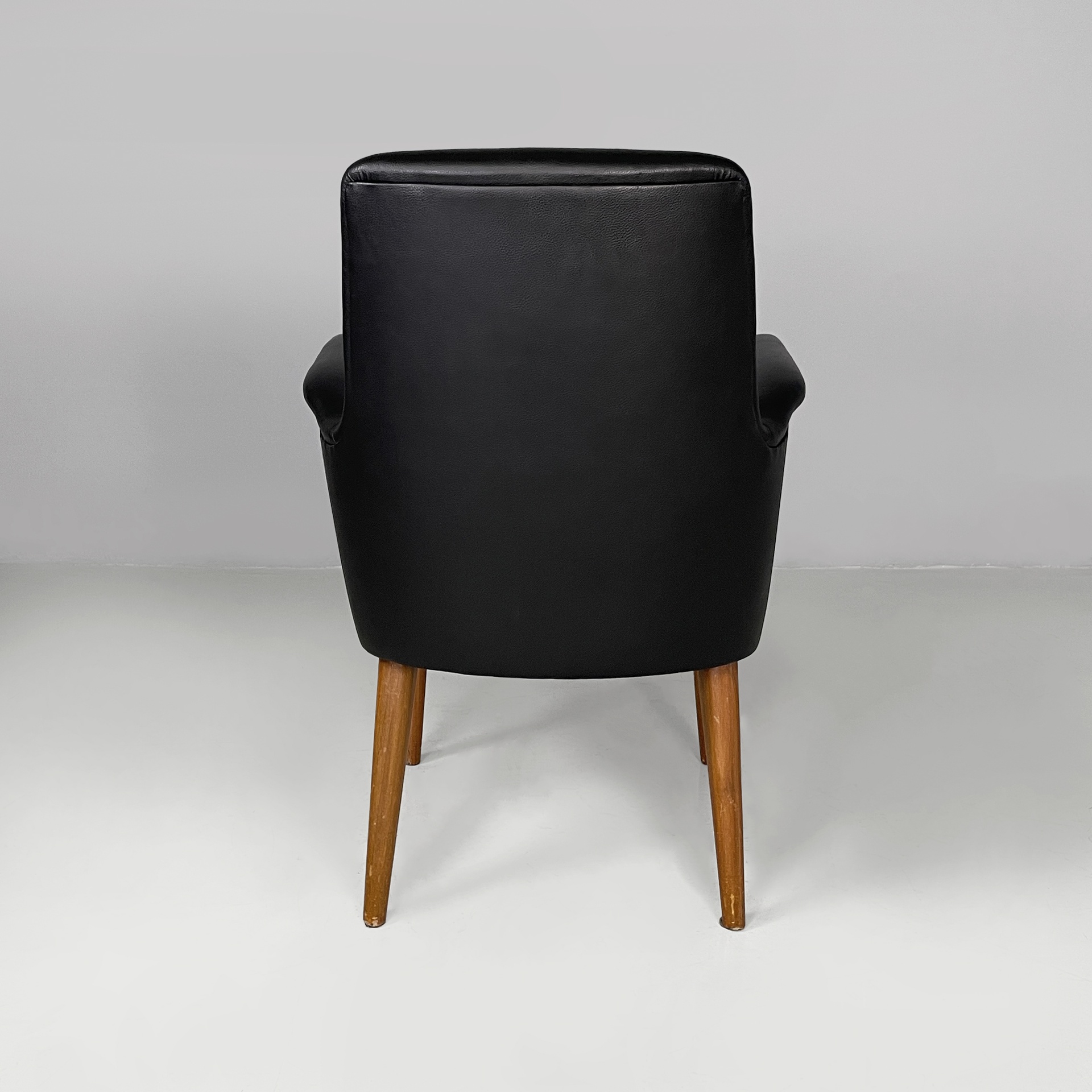 Coppia di poltrone con seduta, schienale e braccioli imbottiti e rivestiti in pelle nera. Le zampe a sezione tonda in legno.