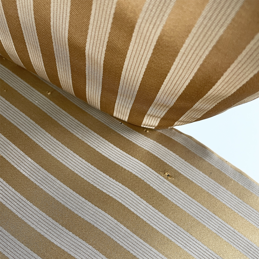 Set di tre poltrone con seduta e schienale imbottiti e rivestiti in tessuto beige a righe.