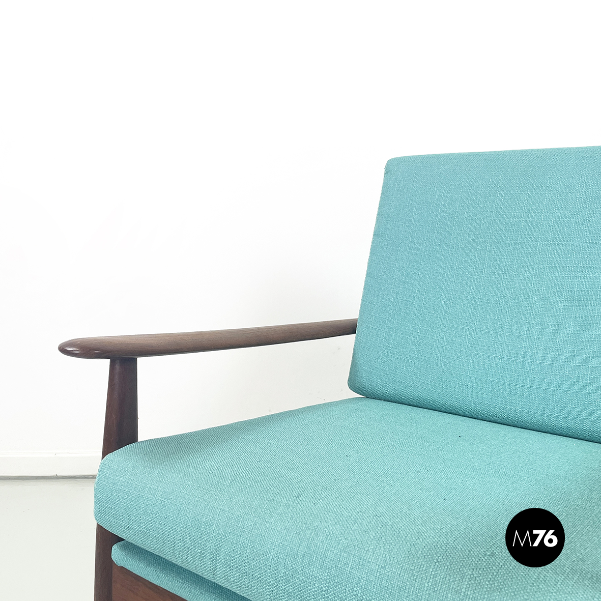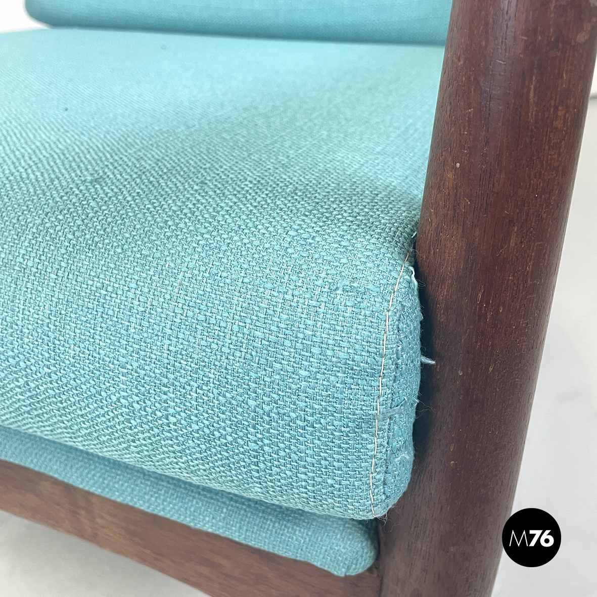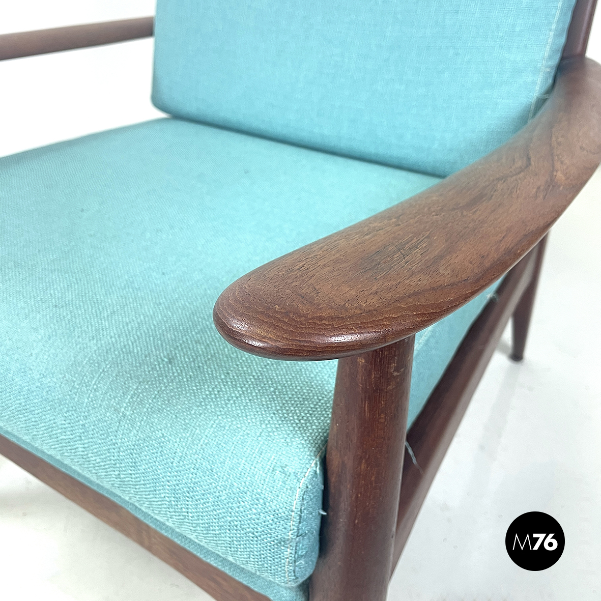 Coppia di poltrone con seduta e schienale squadrati, imbottiti e rivestiti in tessuto azzurro Tiffany. La struttura in legno massello presenta i bordi smussati e linee morbide, con rifinitura in tessuto sul retro dello schienale. Braccioli curvati. Zampe a sezione tonda.