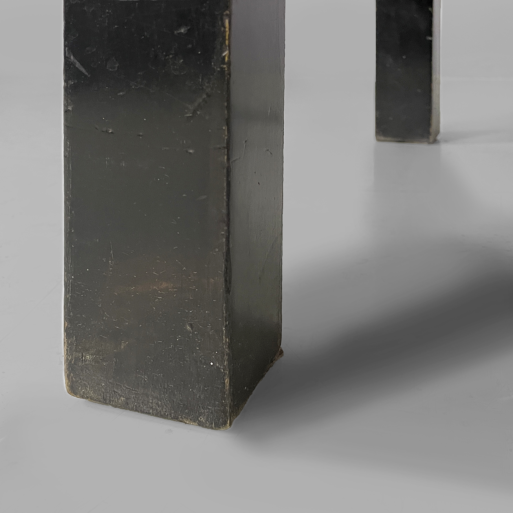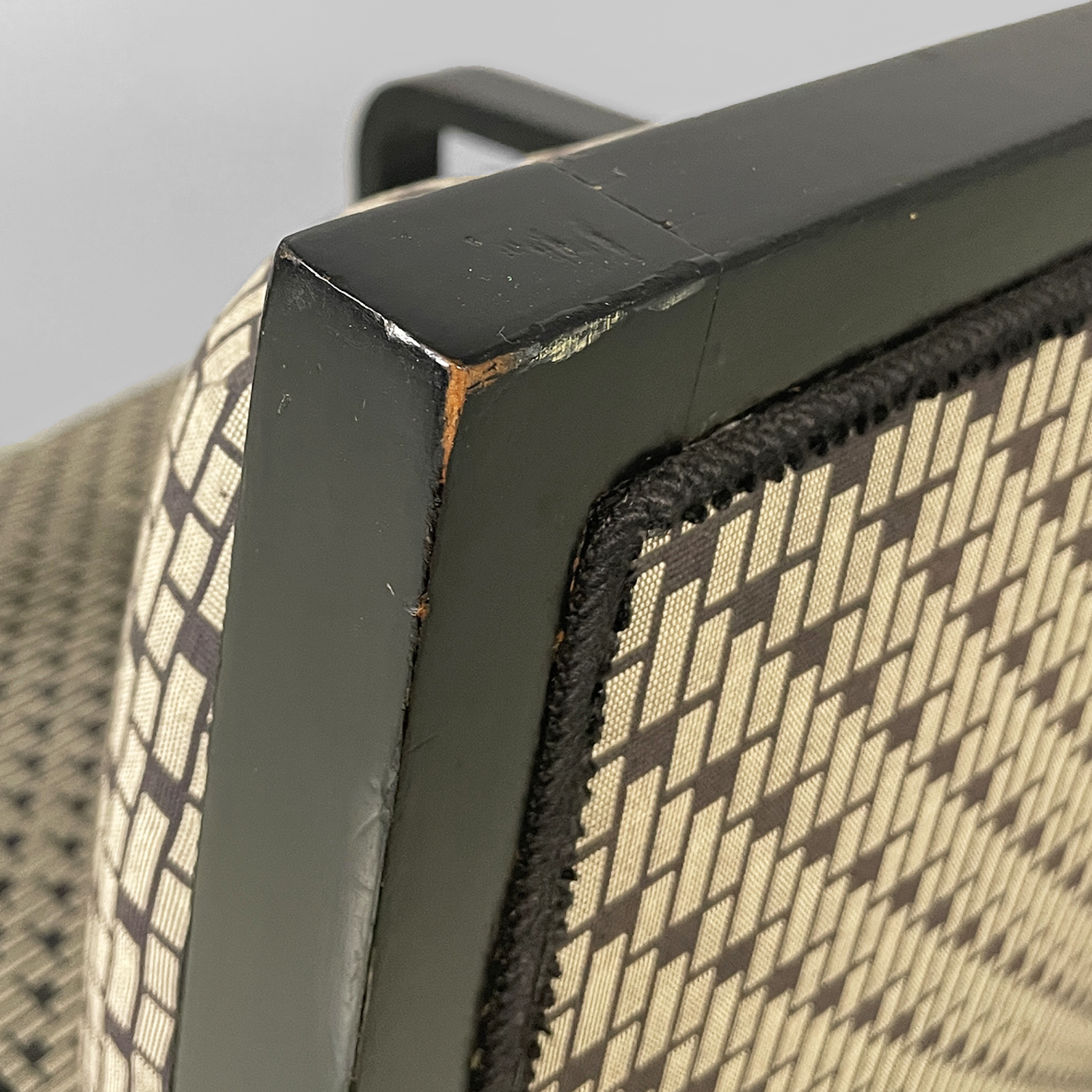 Buone condizioni. Il legno presenta segni sparsi dati dal tempo e piccole mancanze di colore. Il tessuto presenta leggeri segni, un cuscino presenta una piccola macchia.