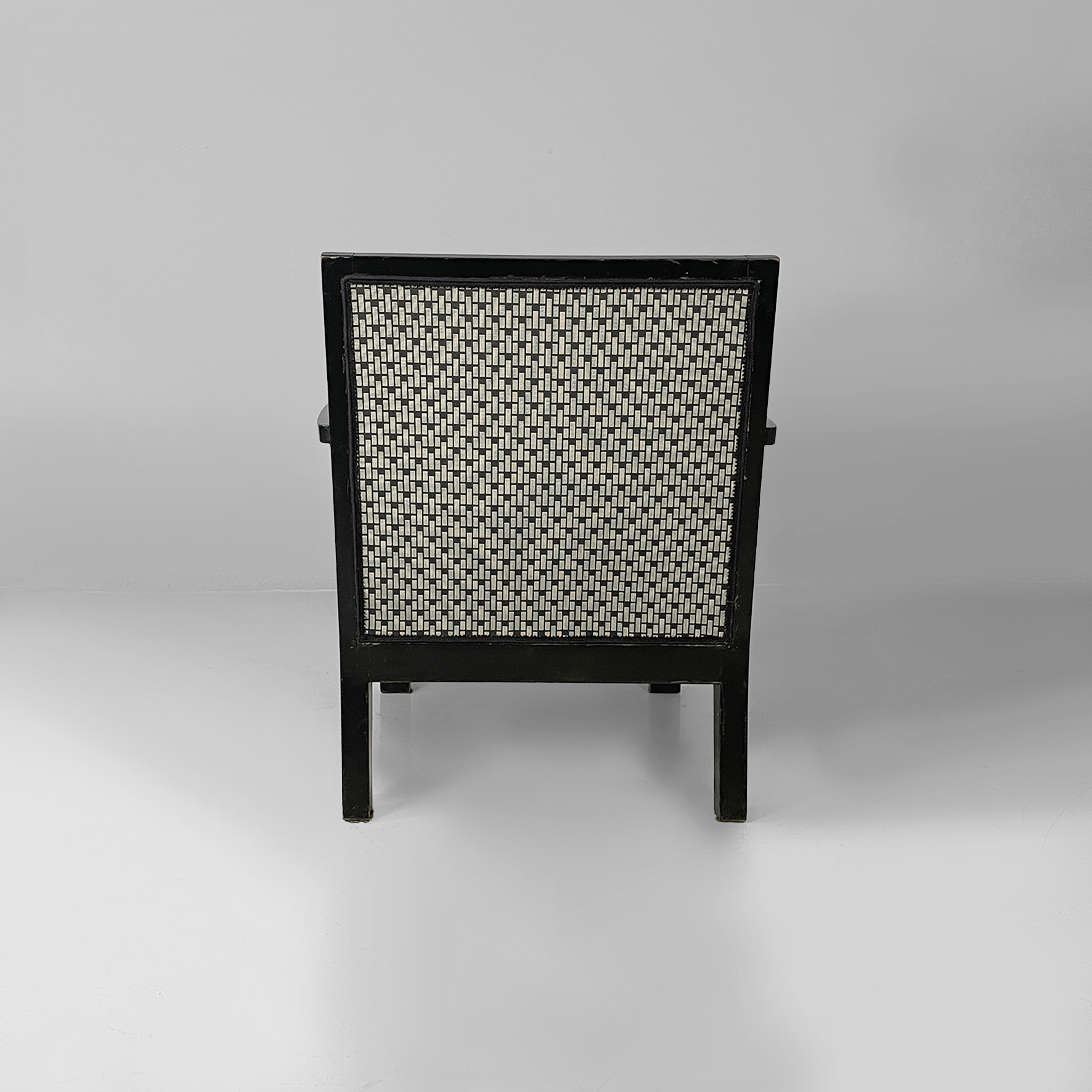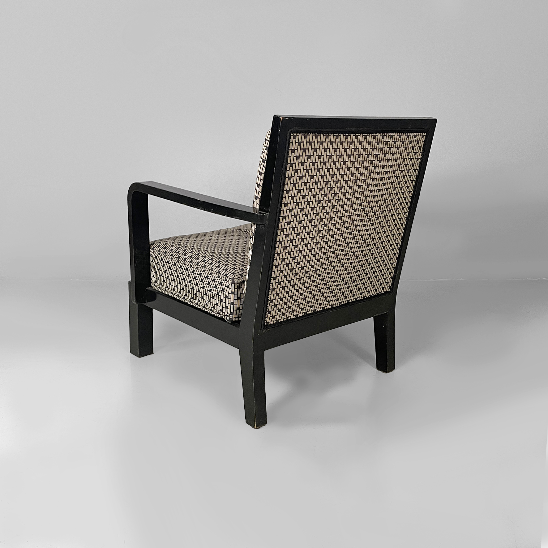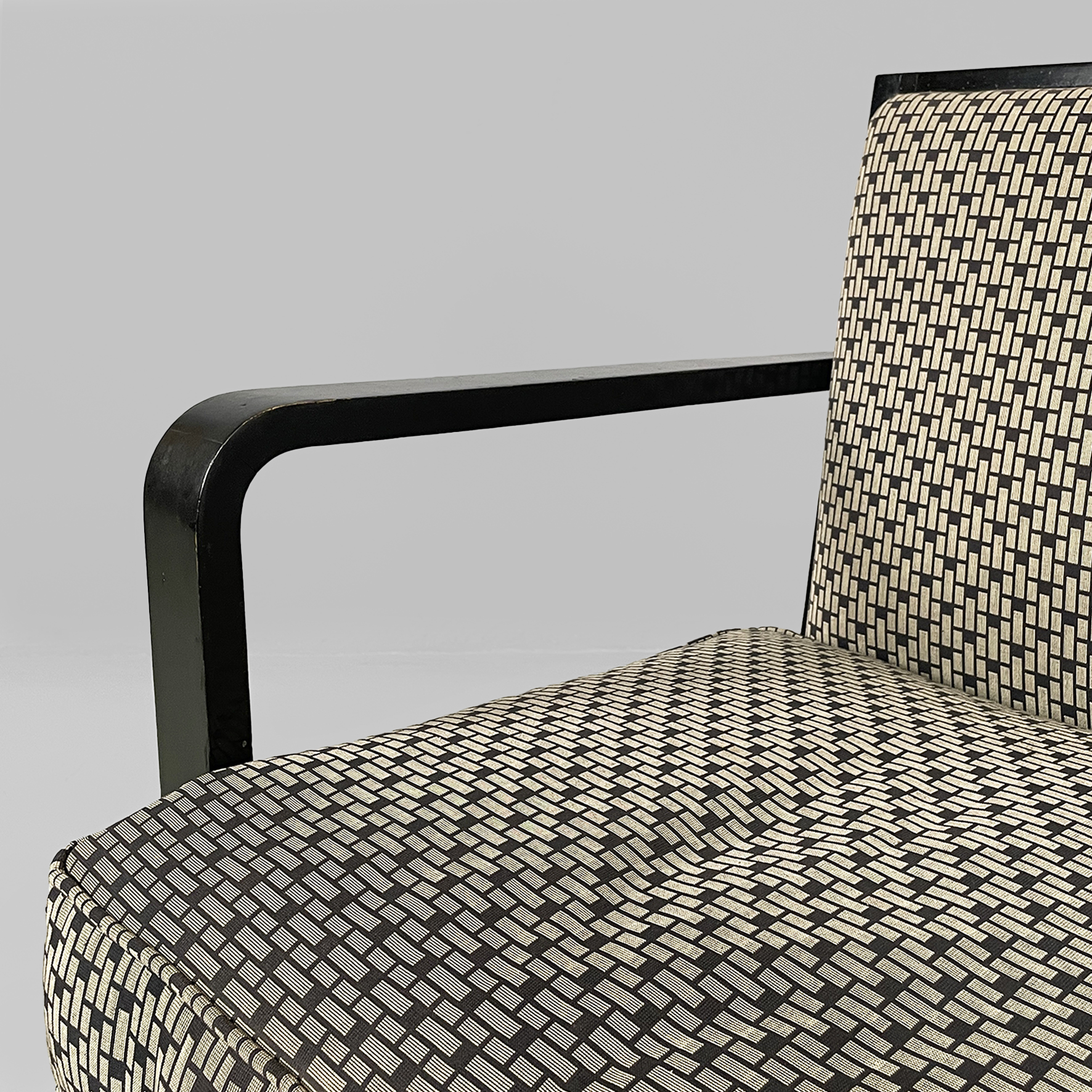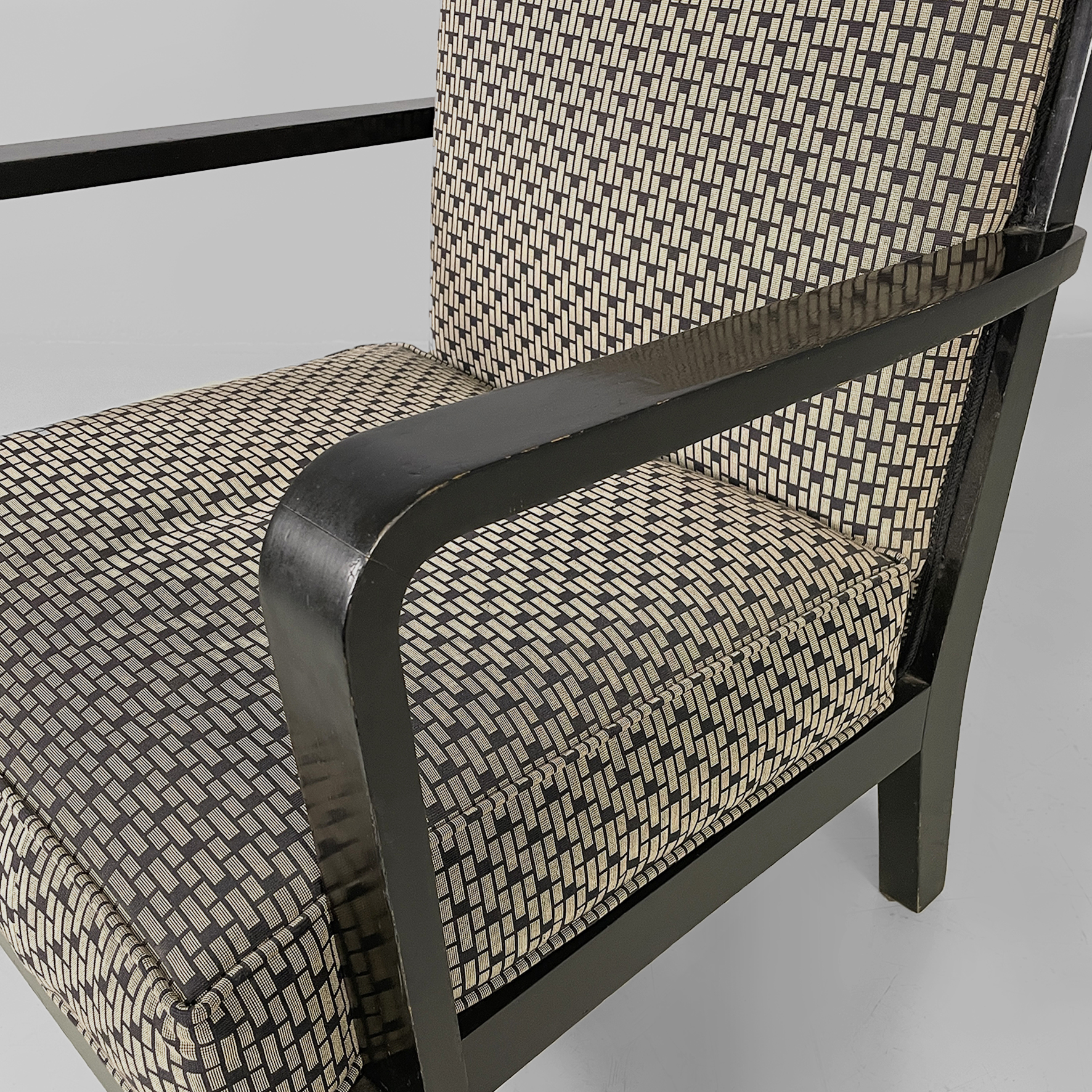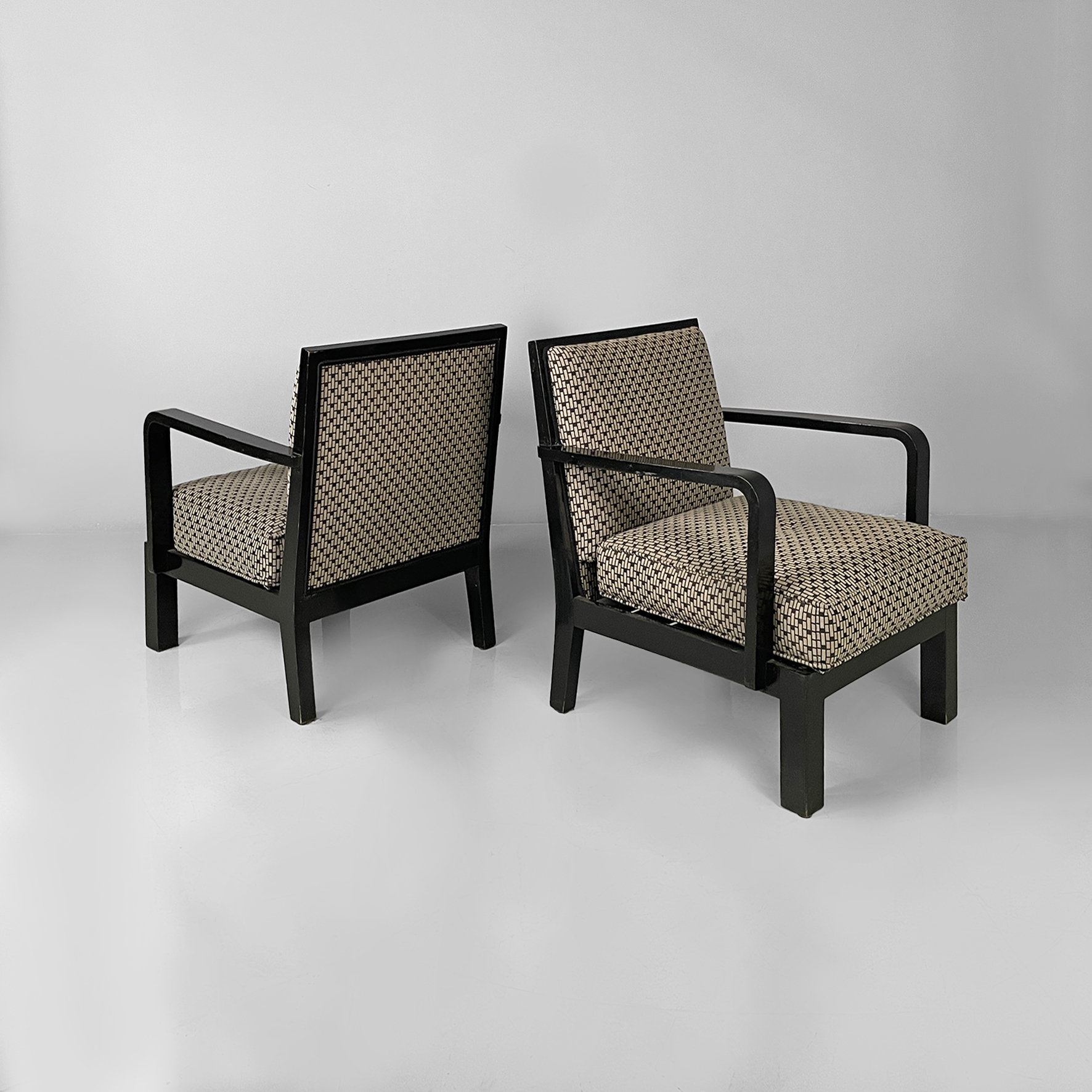 Coppia di poltrone con seduta e schienale squadrati, imbottiti e rivestiti in tessuto a fantasia geometrica in grigio e nero. Passamaneria nera presente sul profilo del cuscino dello schienale. I braccioli sono in listello di legno curvato verniciato nero. La struttura e le zampe sono in legno verniciato nero. Art Deco.
