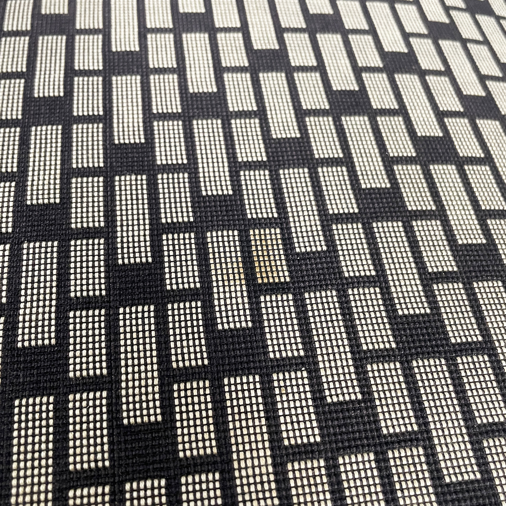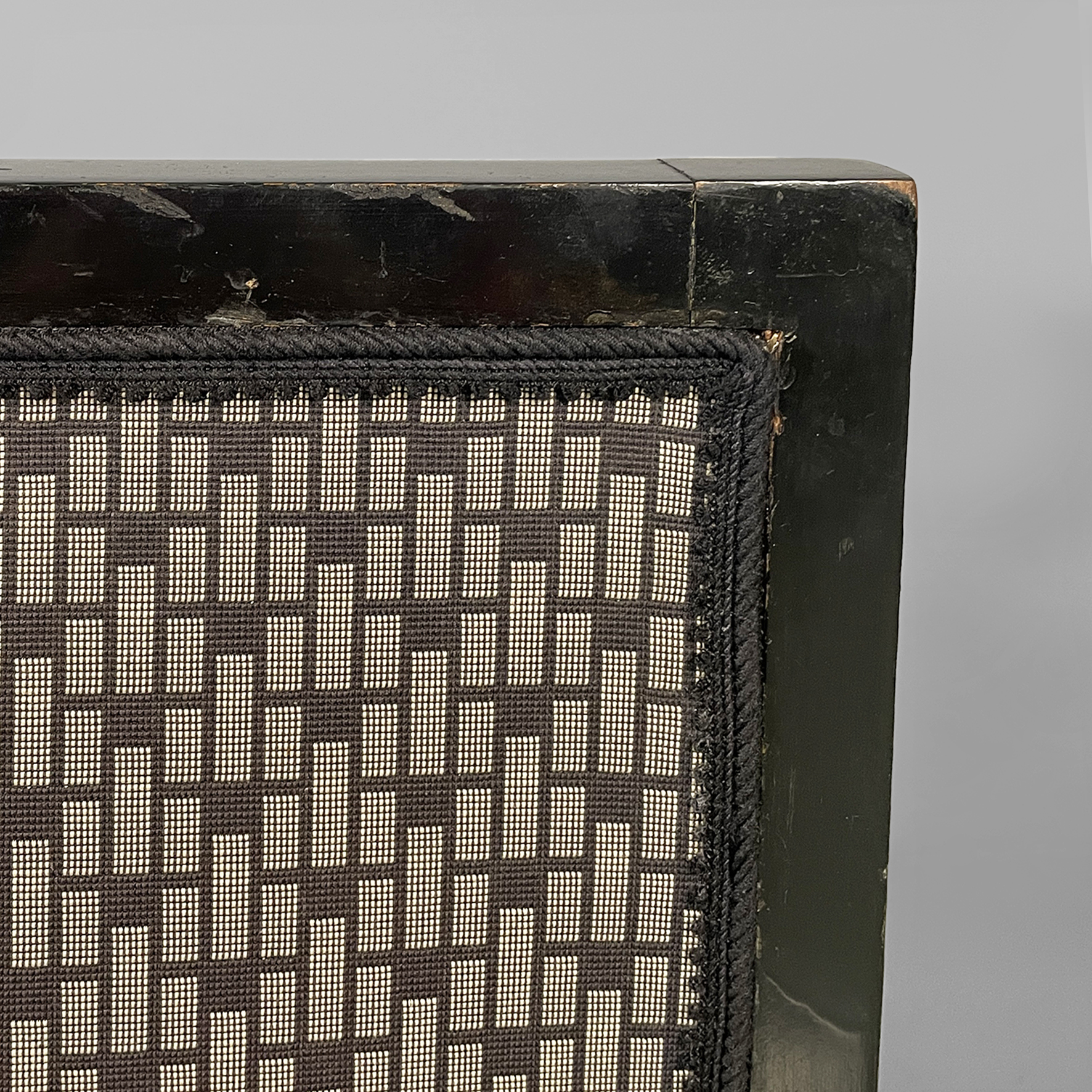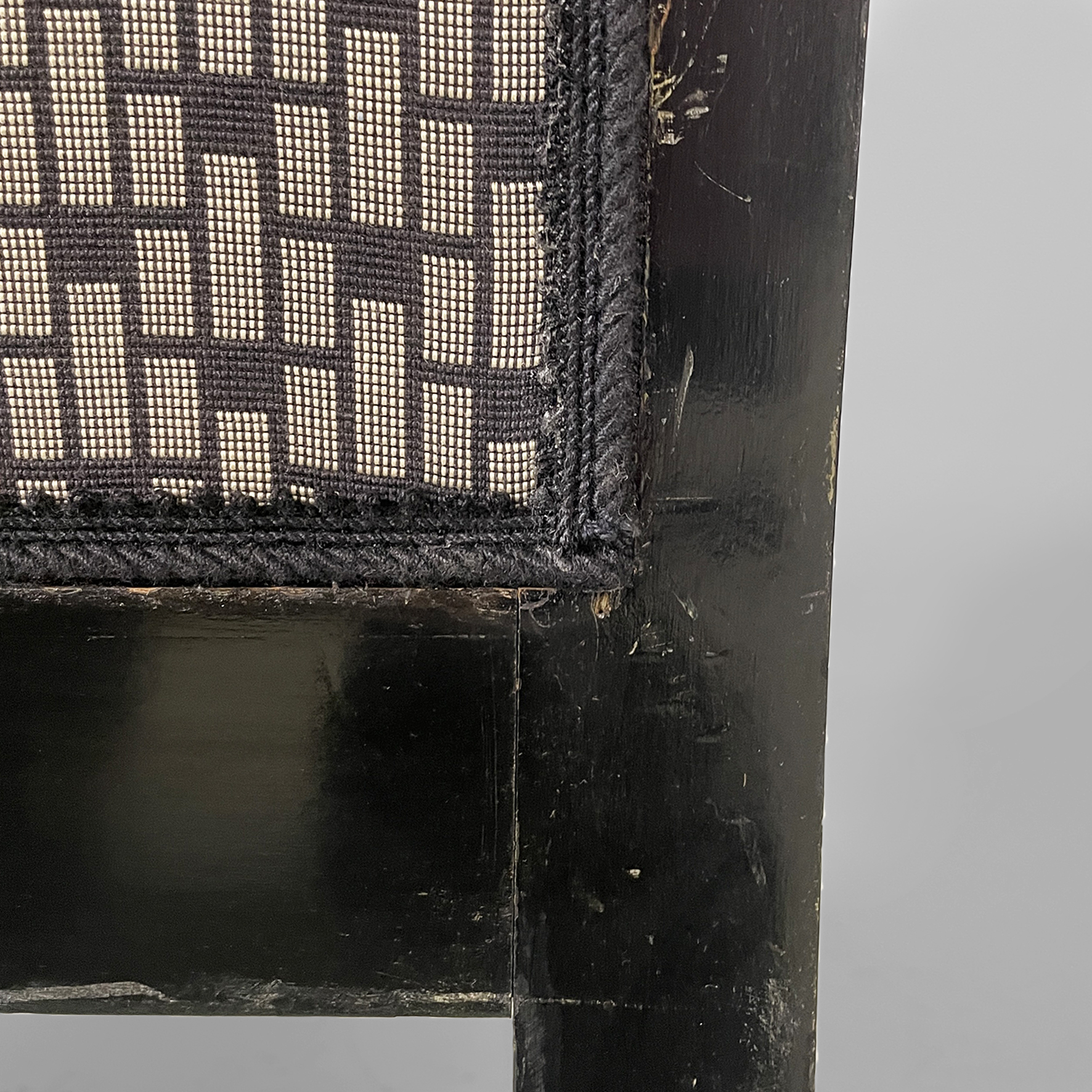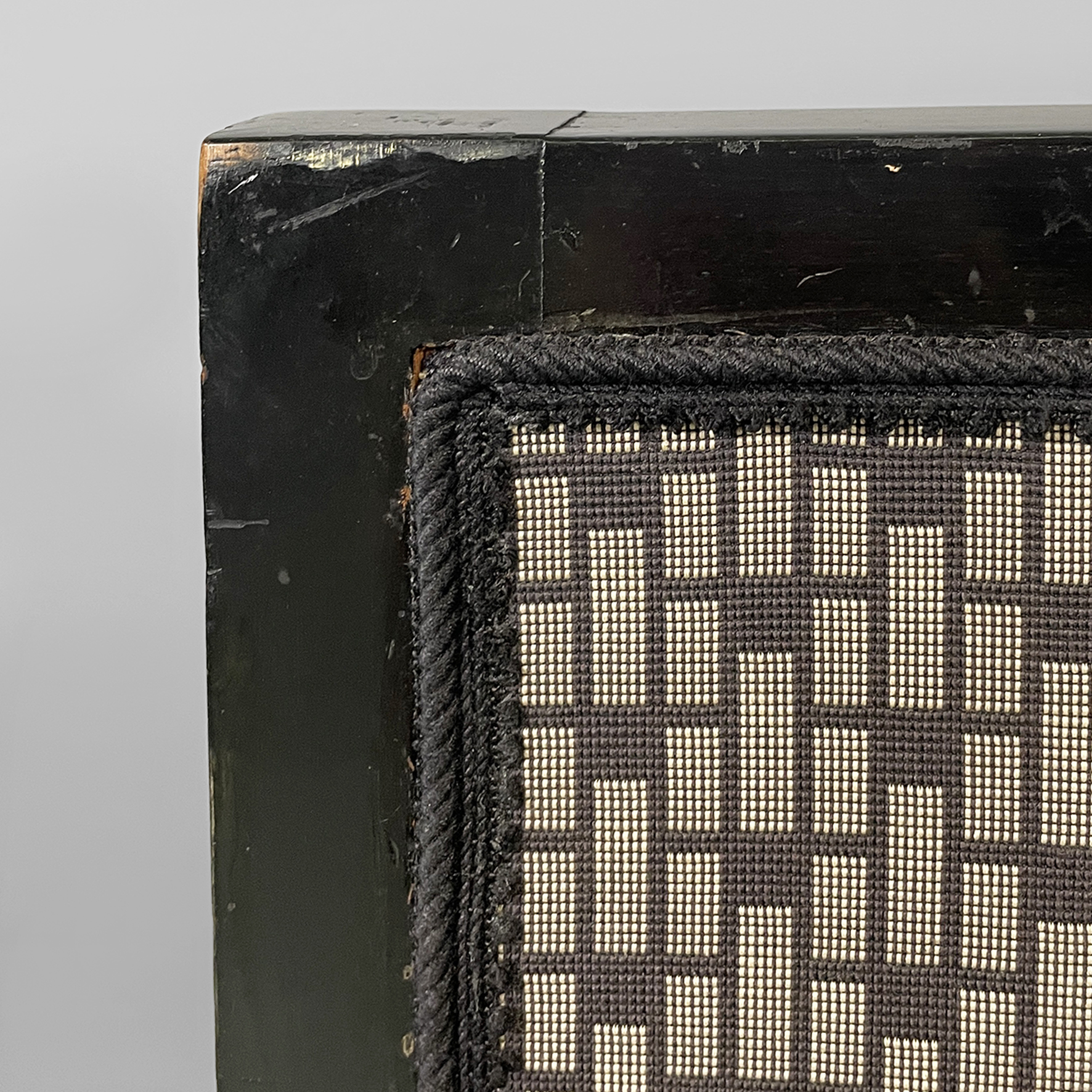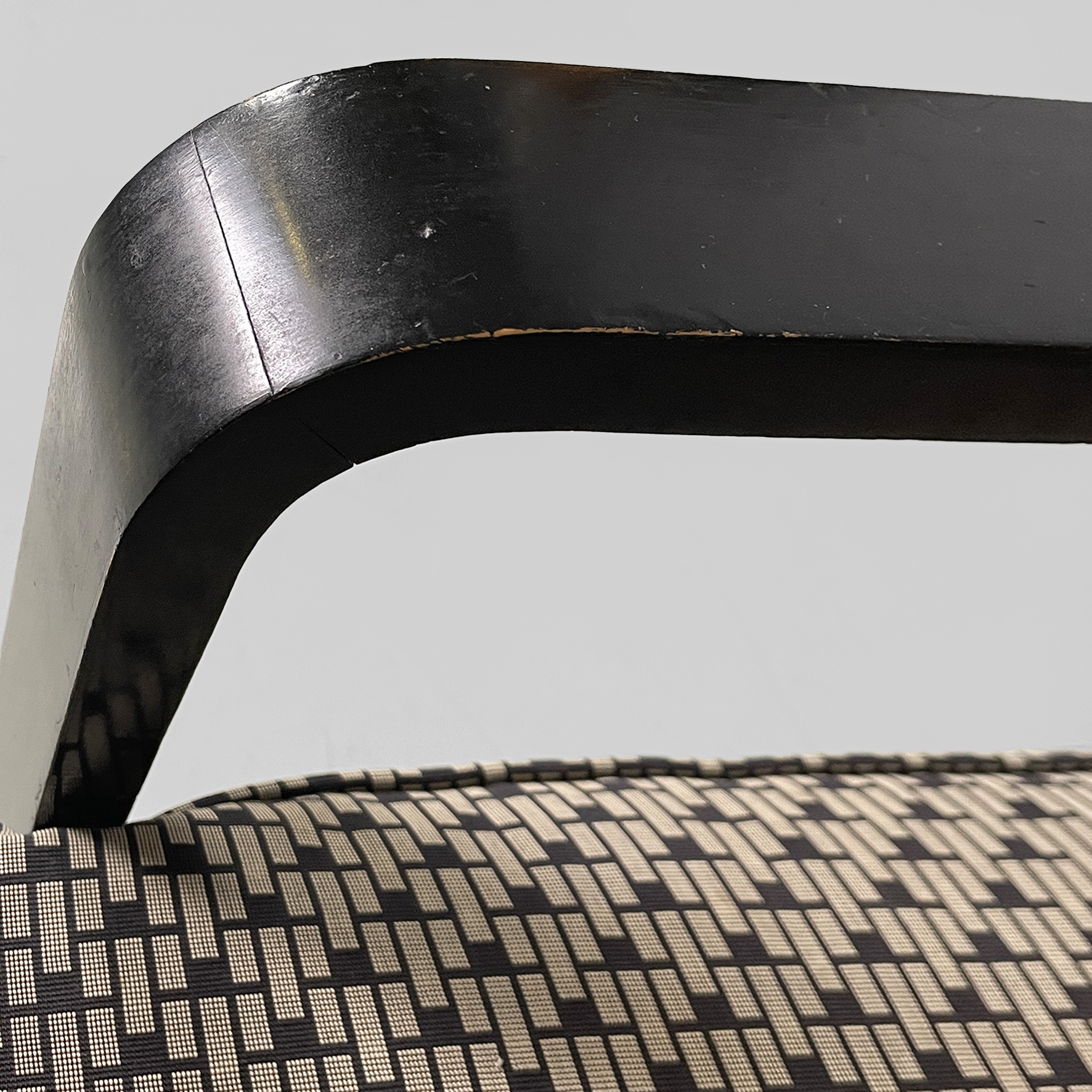 Coppia di poltrone con seduta e schienale squadrati, imbottiti e rivestiti in tessuto a fantasia geometrica in grigio e nero. Passamaneria nera presente sul profilo del cuscino dello schienale. I braccioli sono in listello di legno curvato verniciato nero. La struttura e le zampe sono in legno verniciato nero. Art Deco.