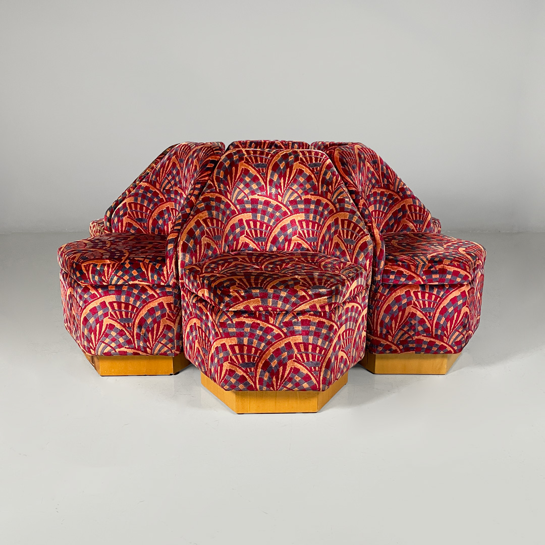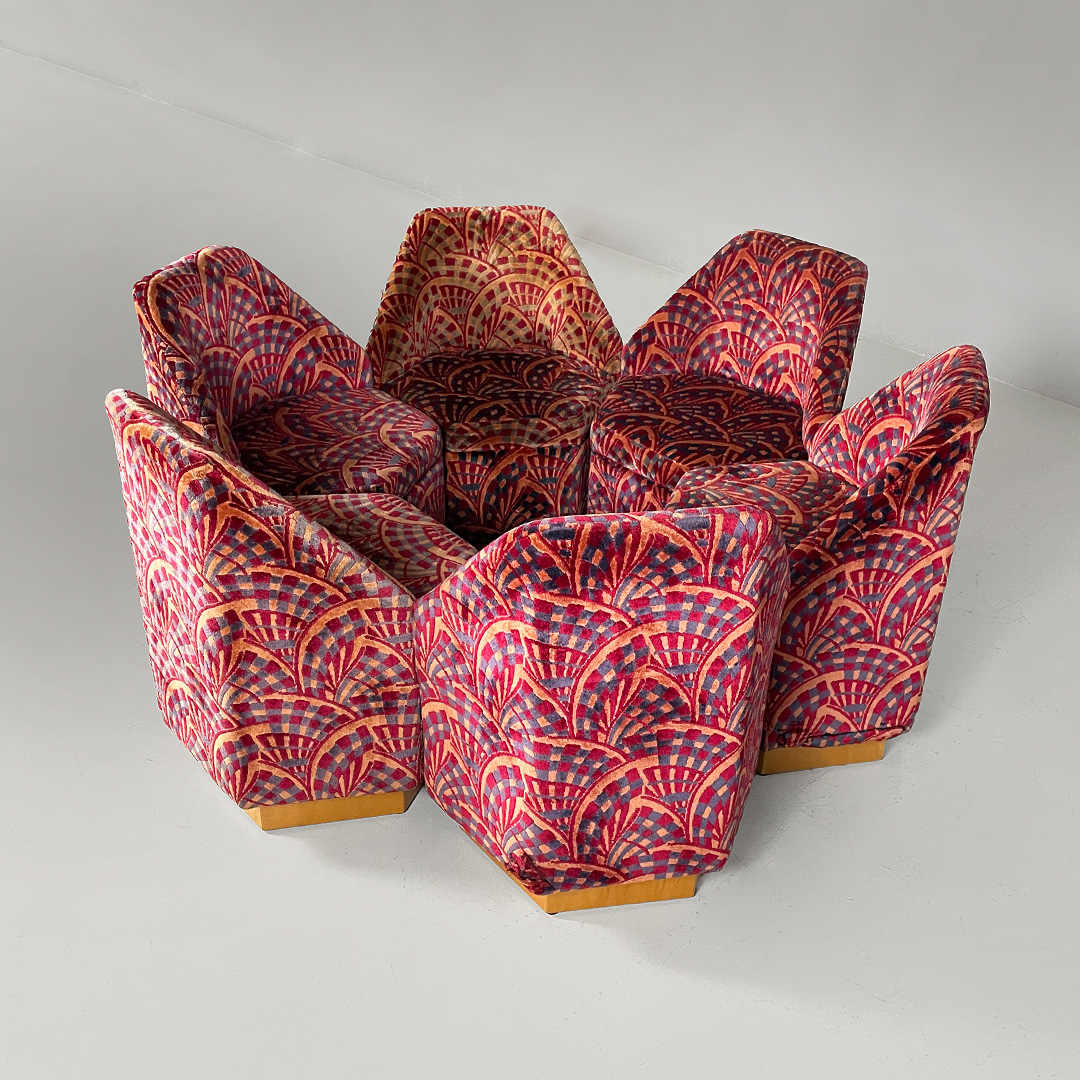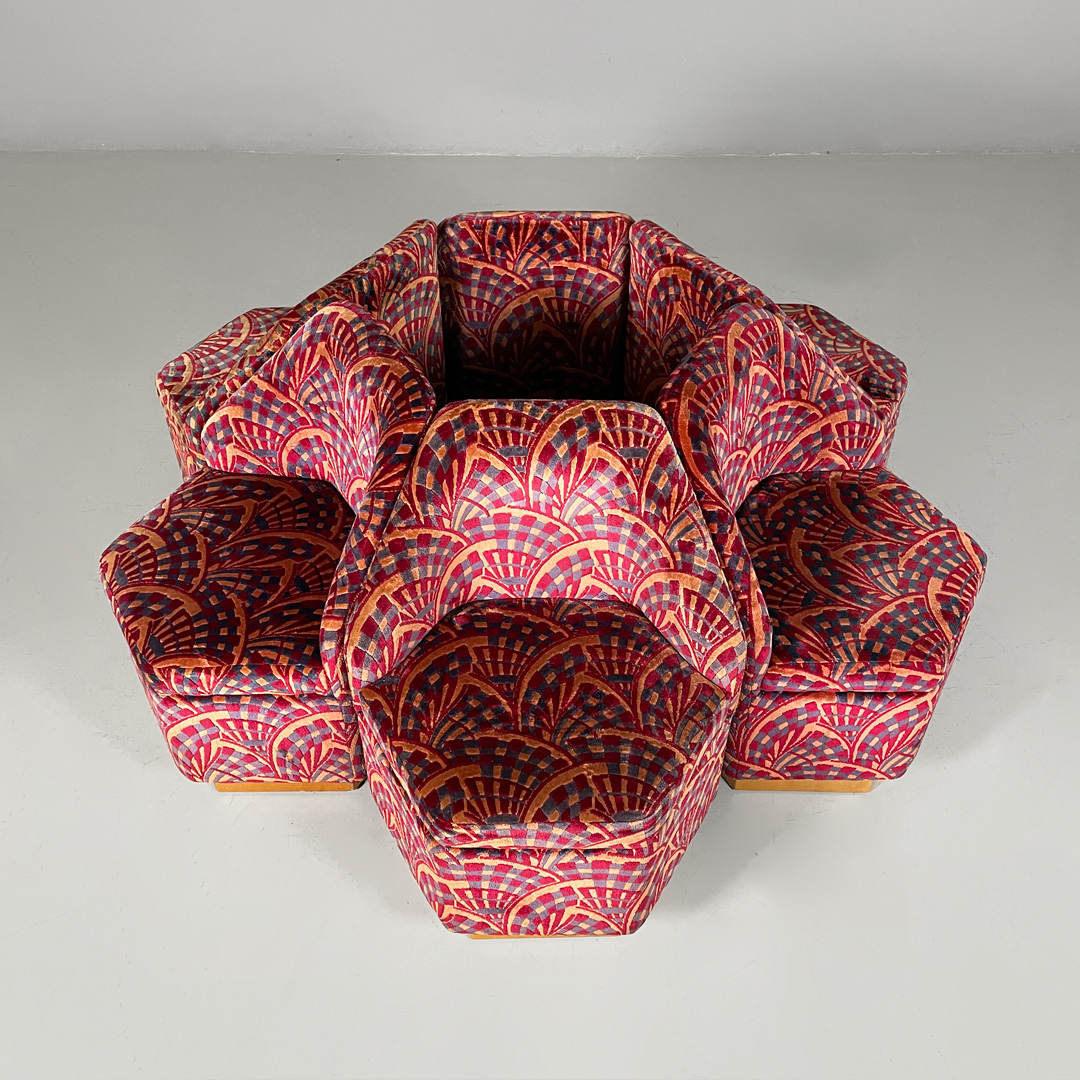 Set di sei poltrone modulari in legno. Le sedute sono rivestite in tessuto vellutato con motivo geometrico, declinato in una palette calda di rossi, bordeaux e aranci. La struttura e la base esagonale sono in legno. Il set si presta a creare composizioni circolari o elementi singoli. In stile Art Deco.