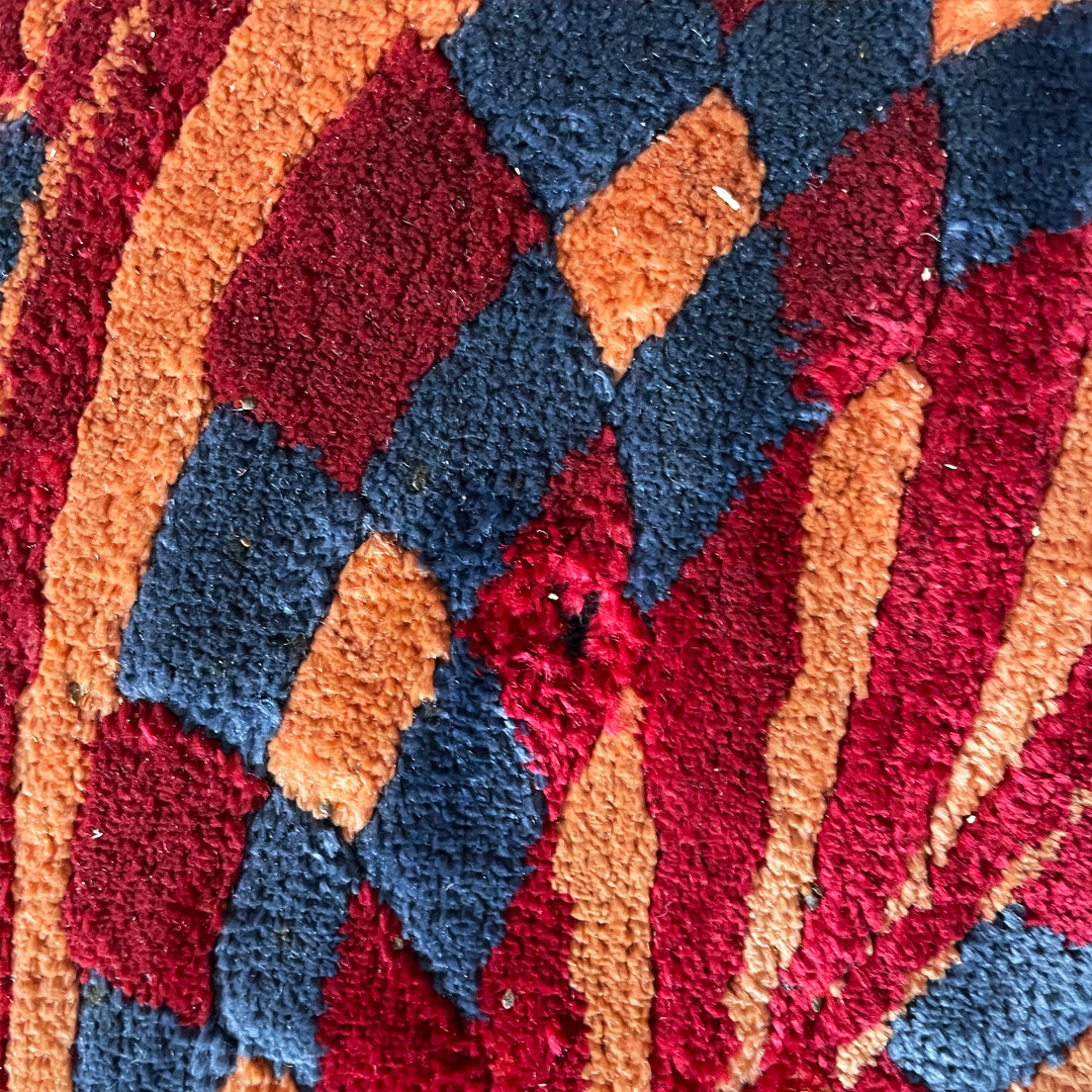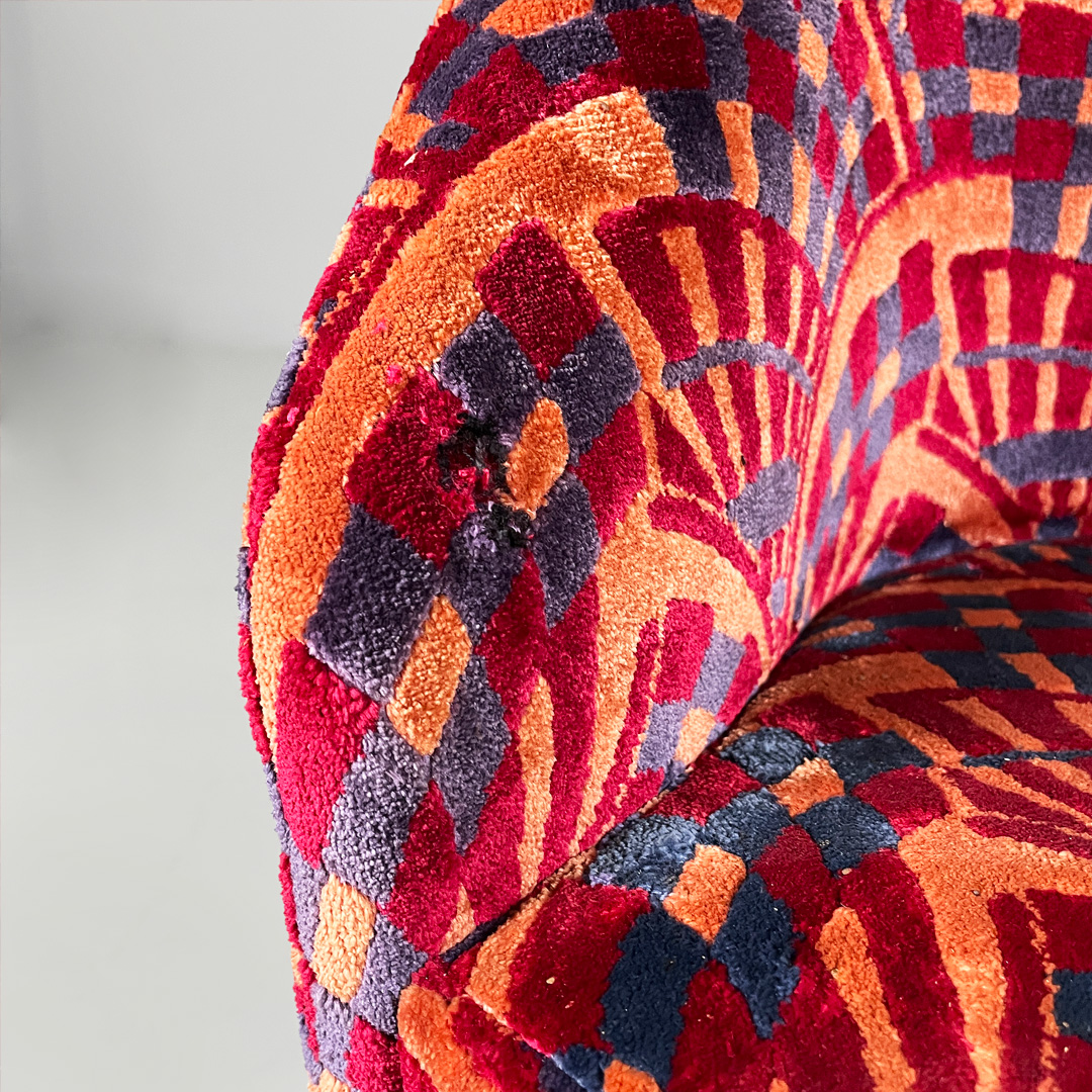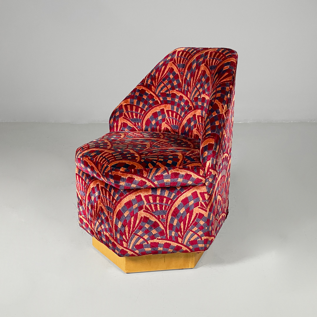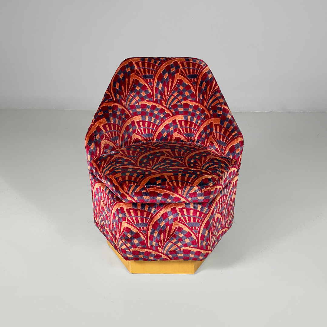 Set di sei poltrone modulari in legno. Le sedute sono rivestite in tessuto vellutato con motivo geometrico, declinato in una palette calda di rossi, bordeaux e aranci. La struttura e la base esagonale sono in legno. Il set si presta a creare composizioni circolari o elementi singoli. In stile Art Deco.