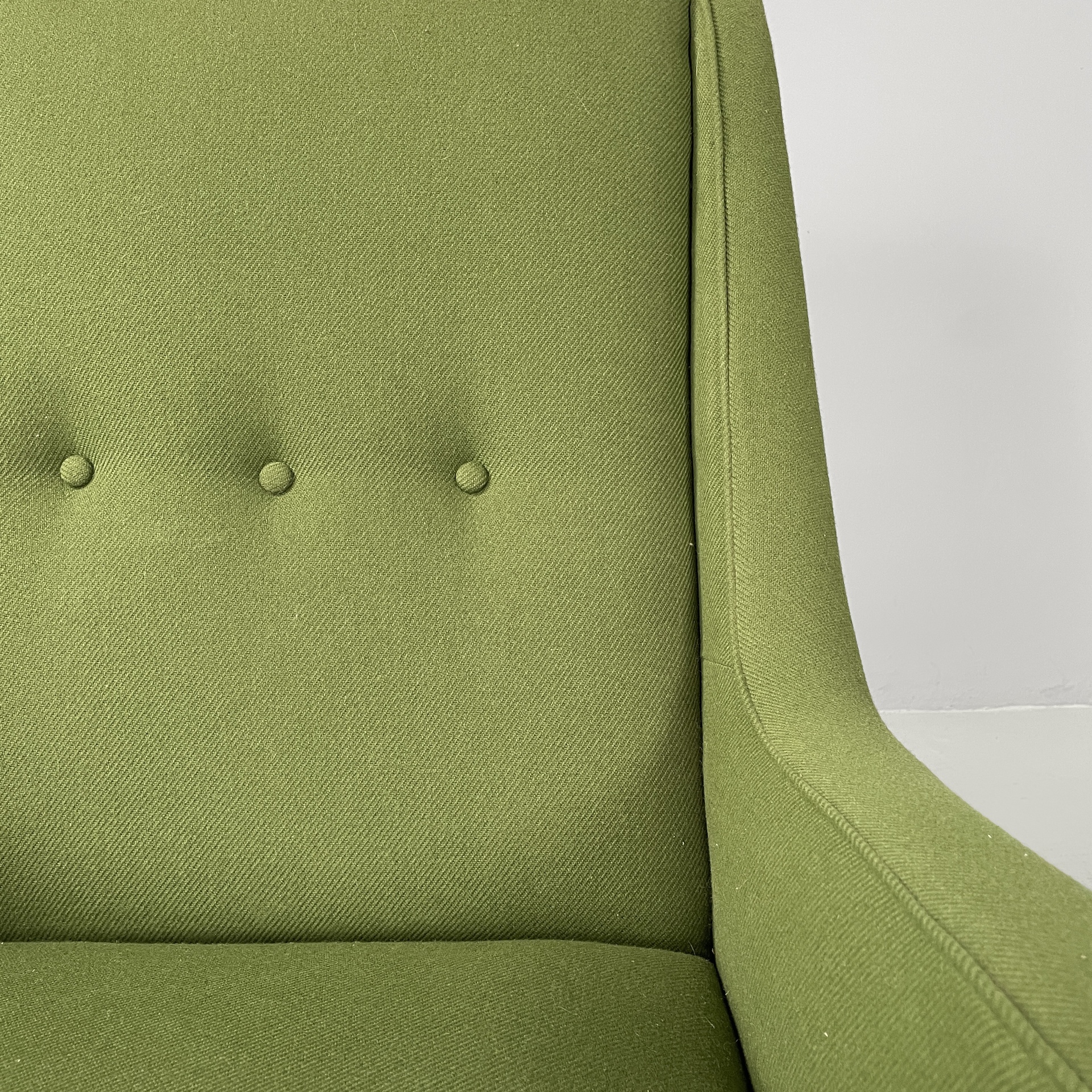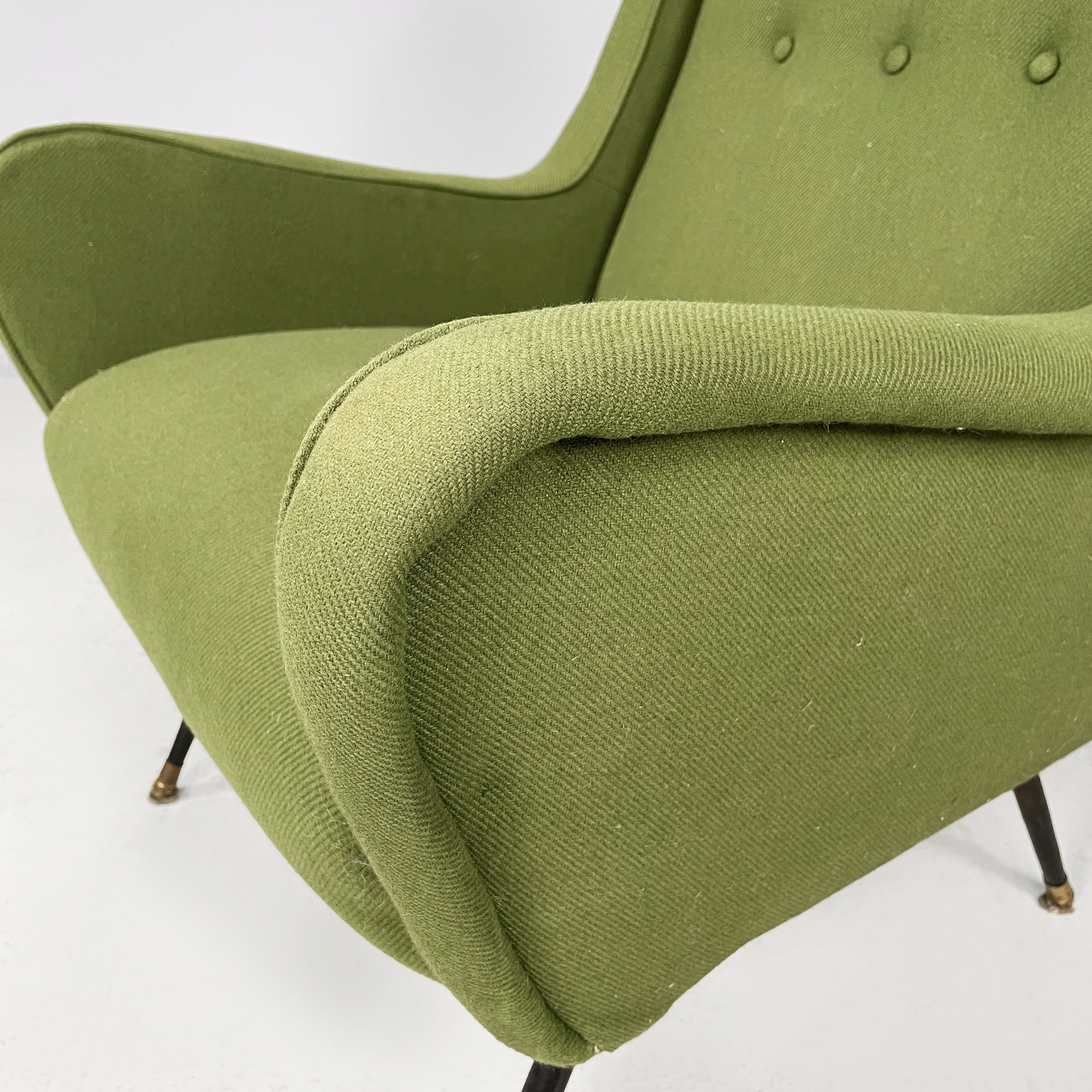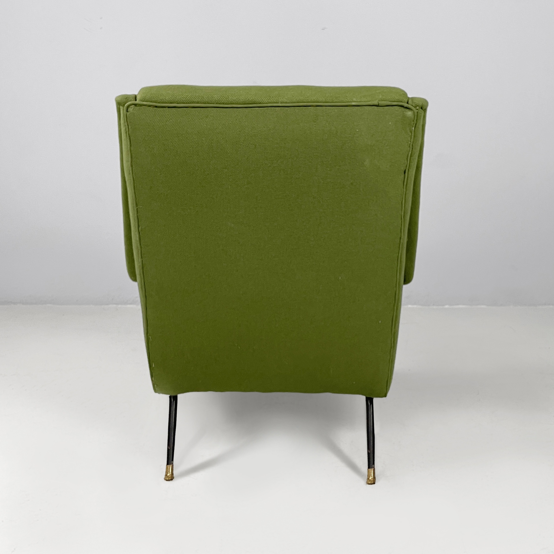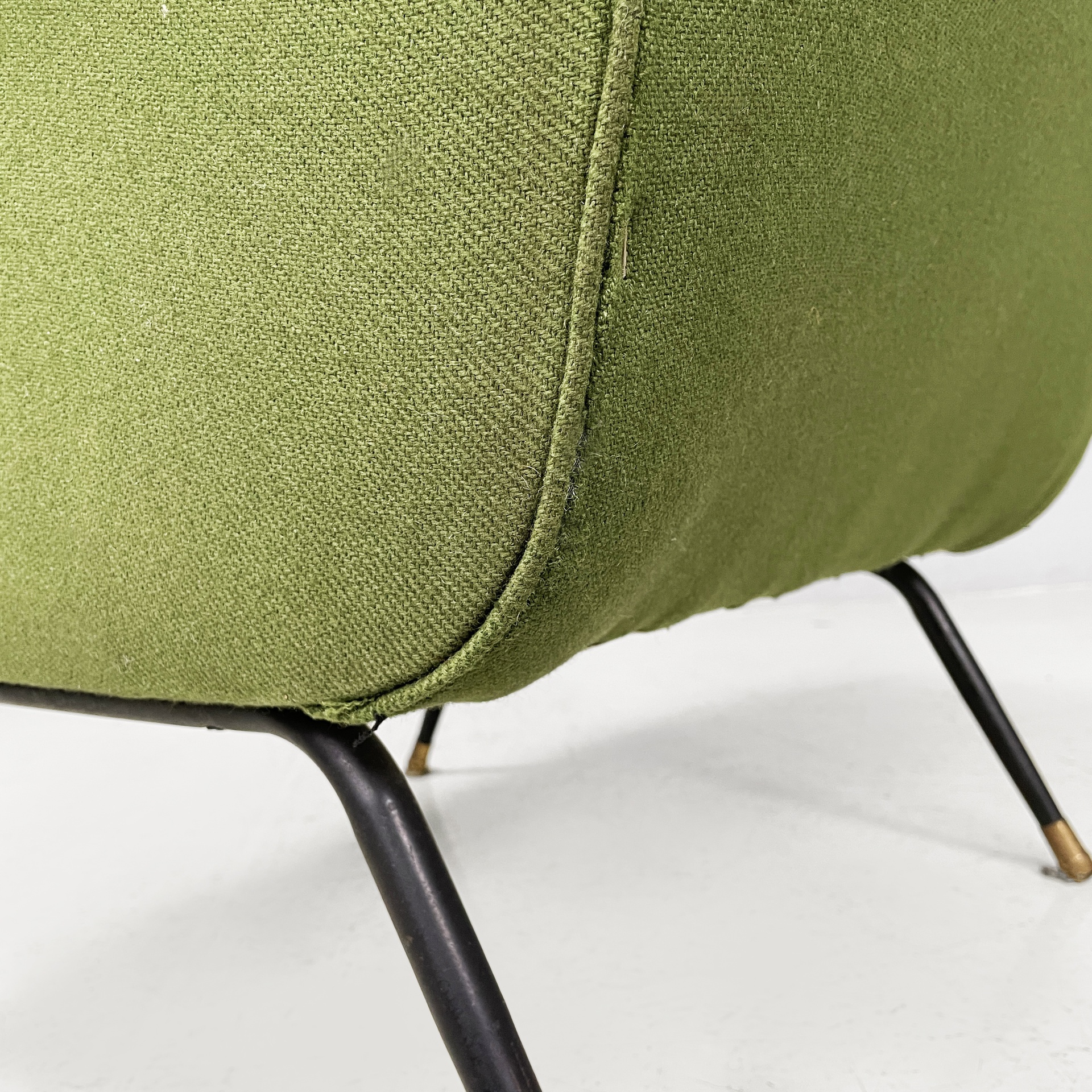 Coppia di poltrone con seduta e schienale imbottiti e rivestiti in tessuto verde. I braccioli sagomati sono rivestiti in tessuto verde. Lo schienale presenta tre bottoni rivestiti in tessuto verde. Le zampe sono in tondino di metallo verniciato nero con piedini in ottone.