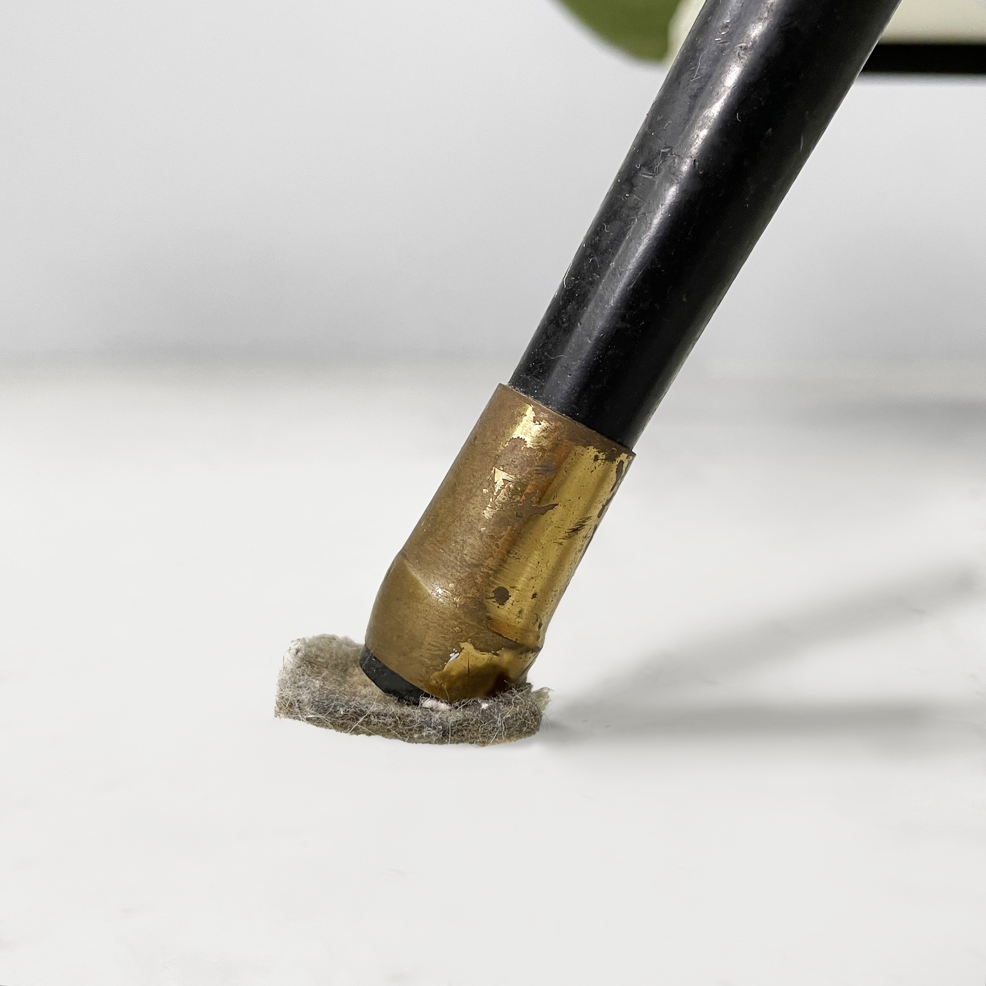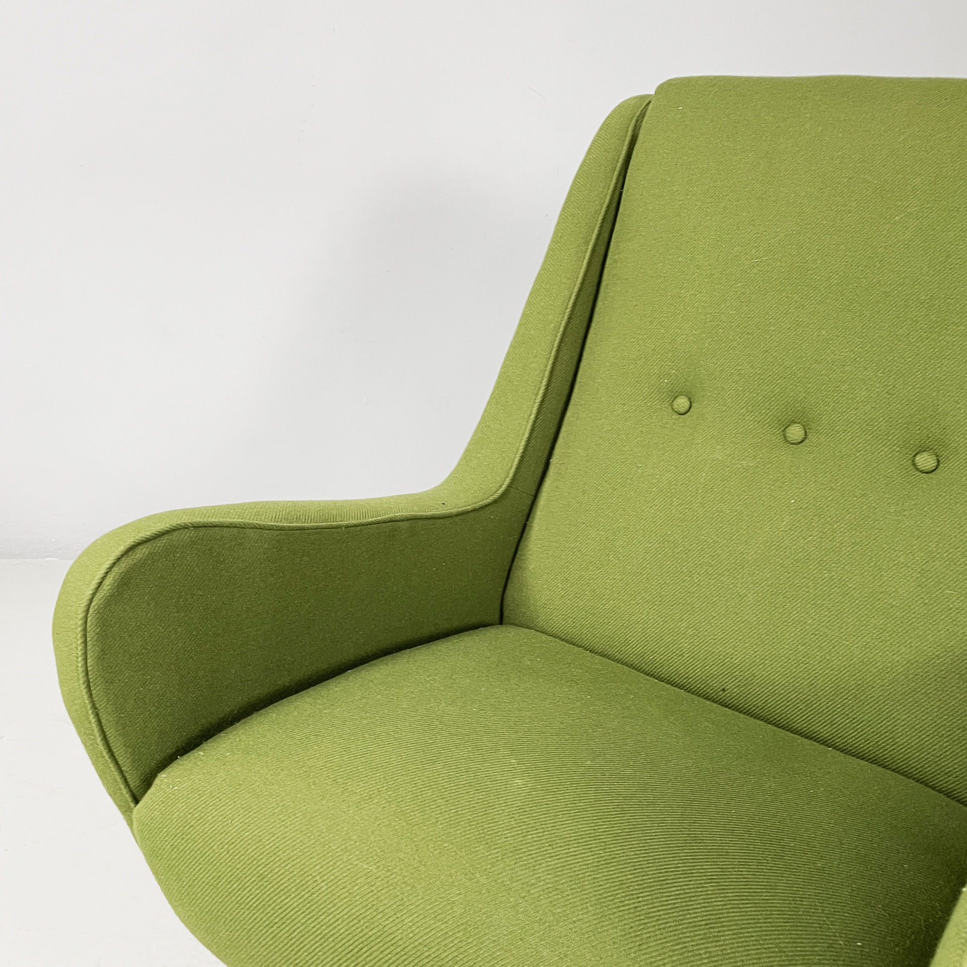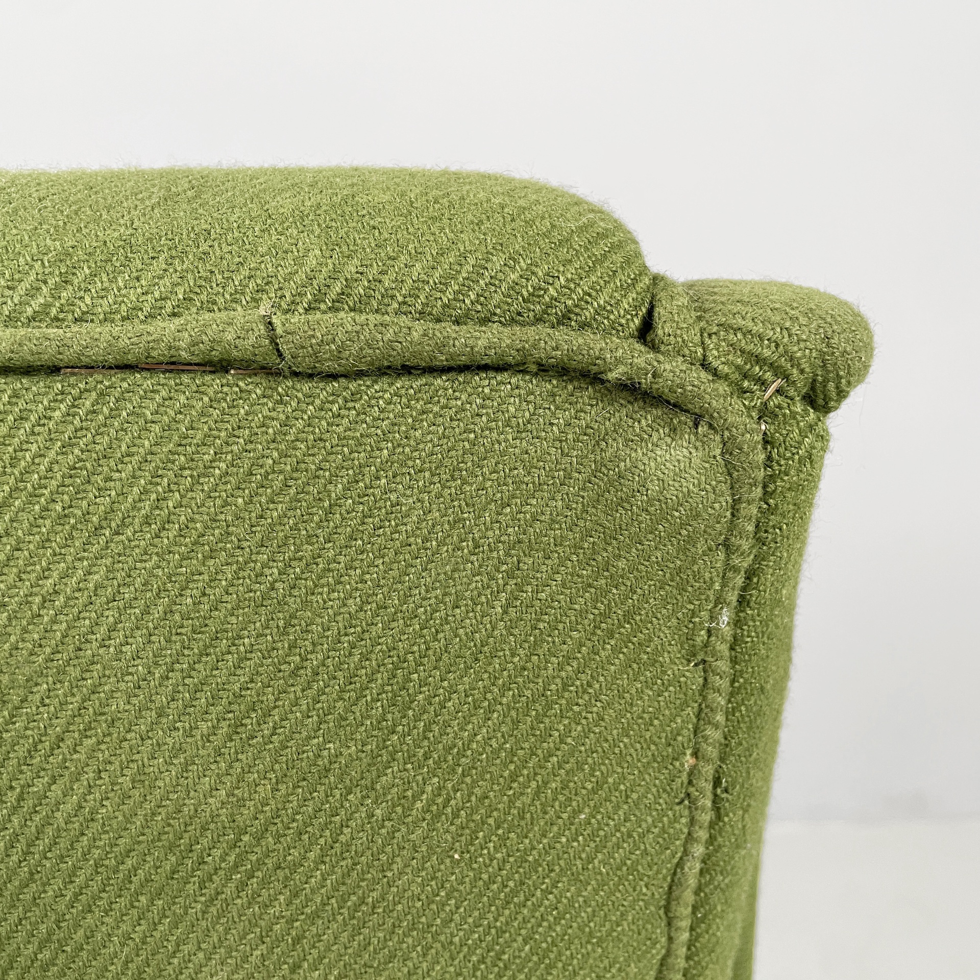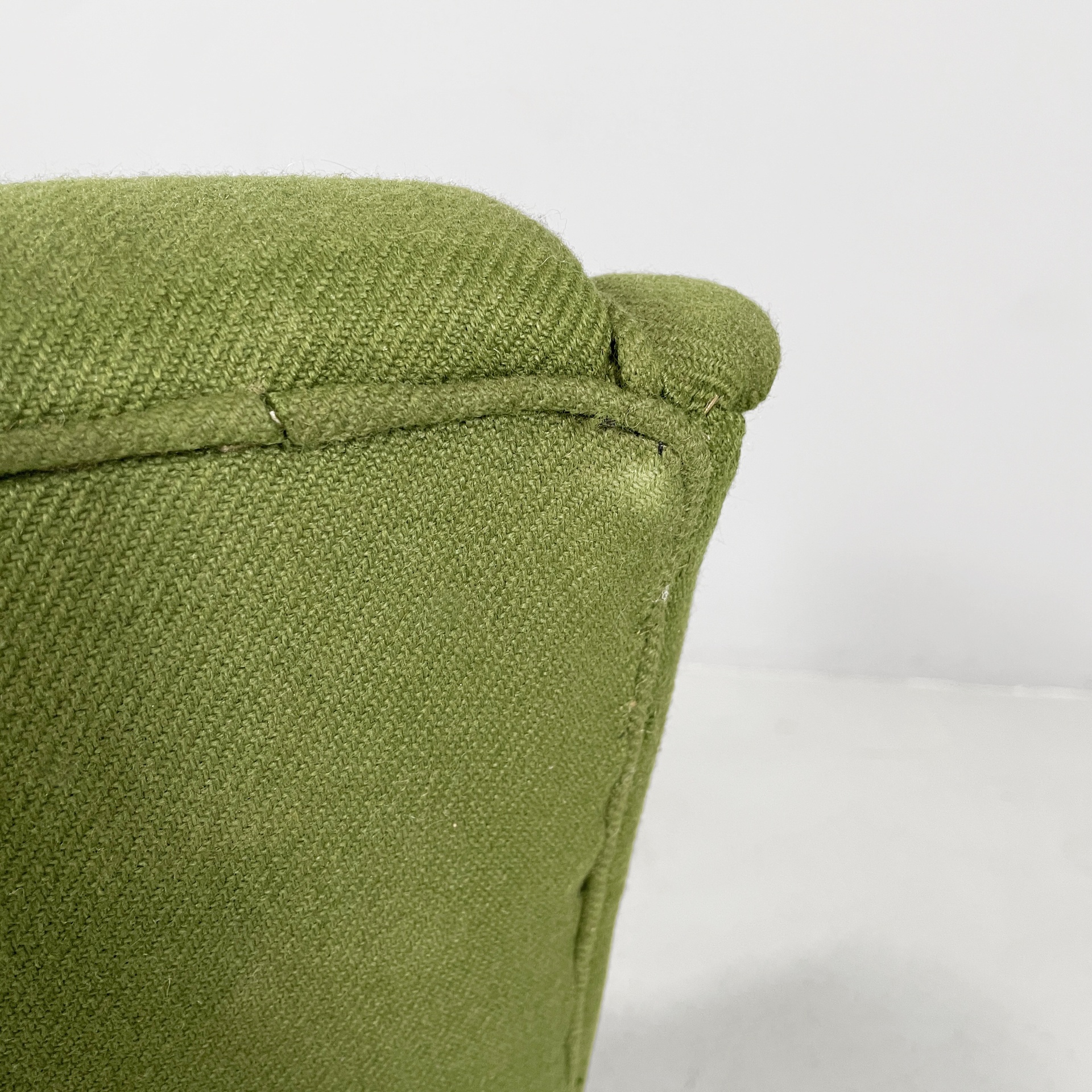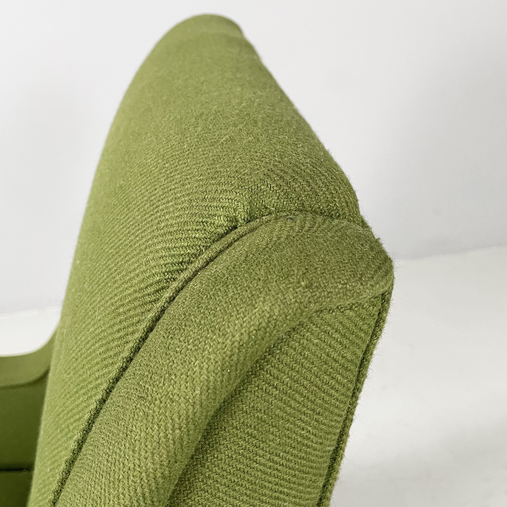 Coppia di poltrone con seduta e schienale imbottiti e rivestiti in tessuto verde. I braccioli sagomati sono rivestiti in tessuto verde. Lo schienale presenta tre bottoni rivestiti in tessuto verde. Le zampe sono in tondino di metallo verniciato nero con piedini in ottone.