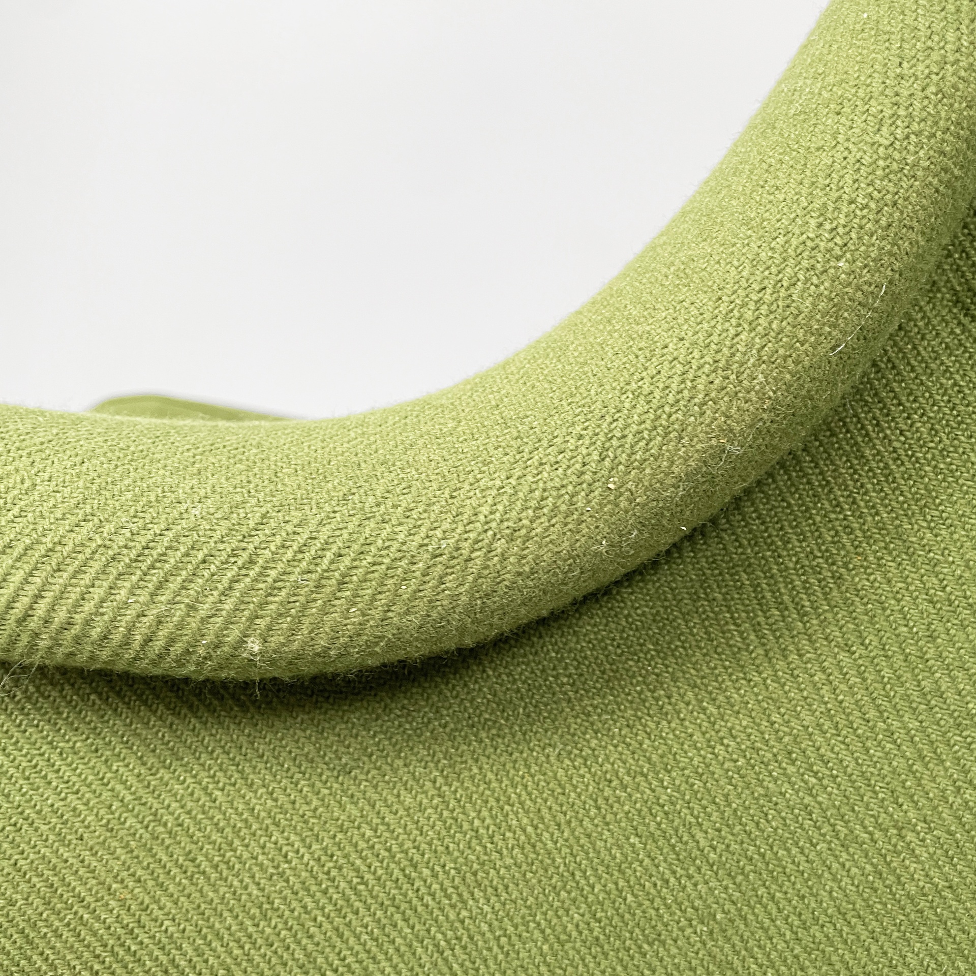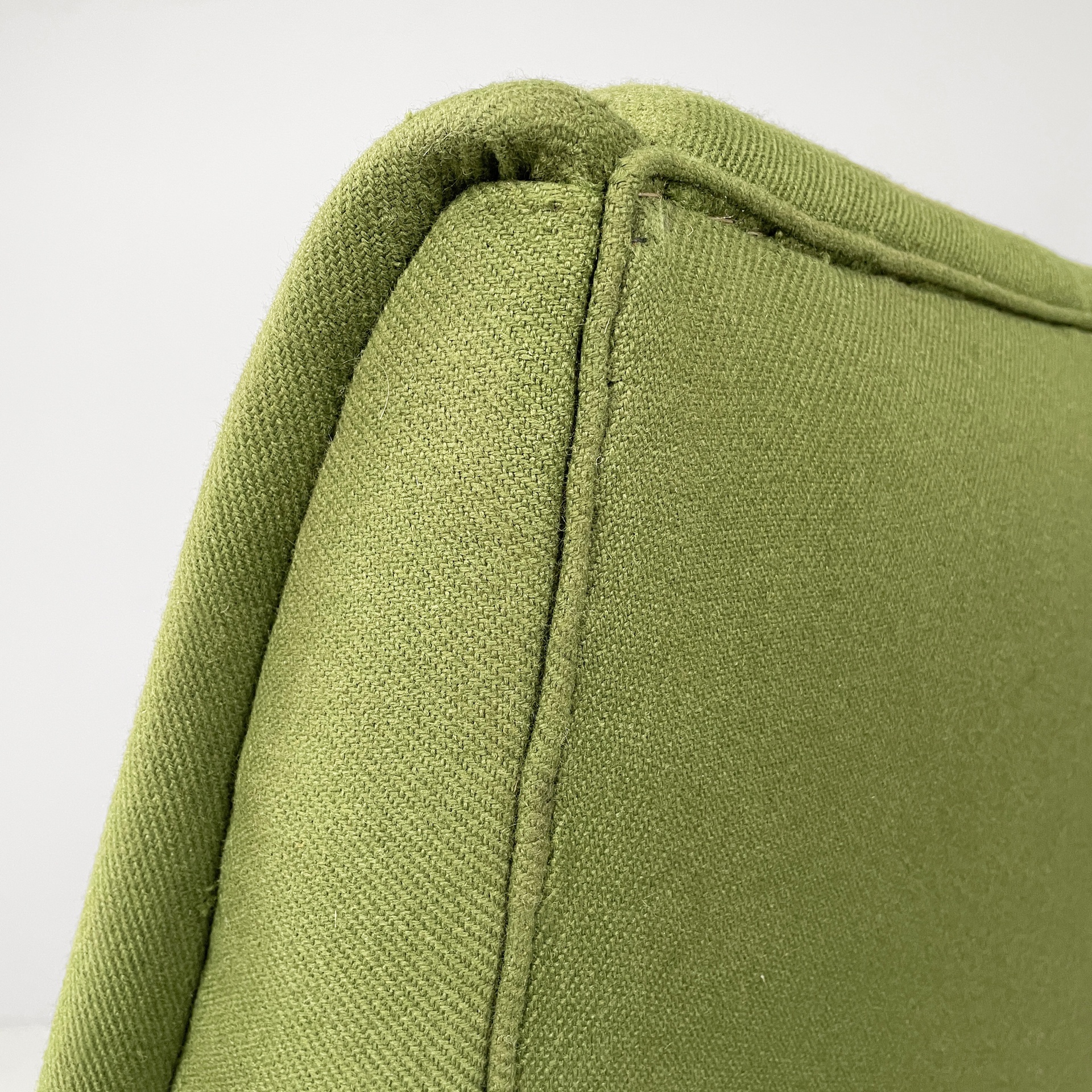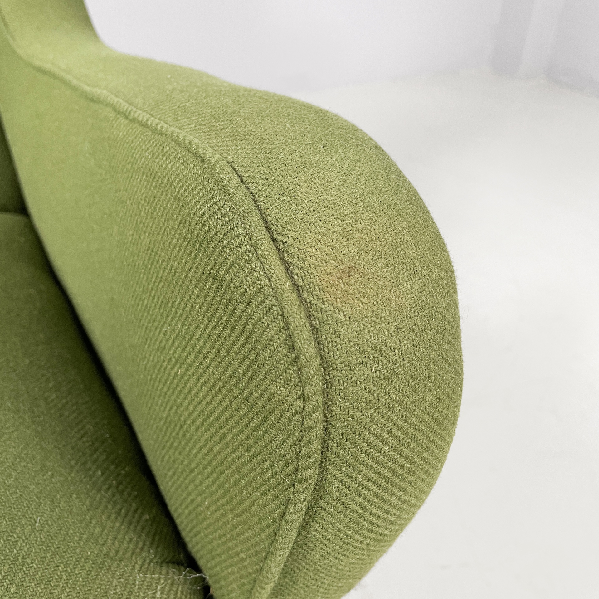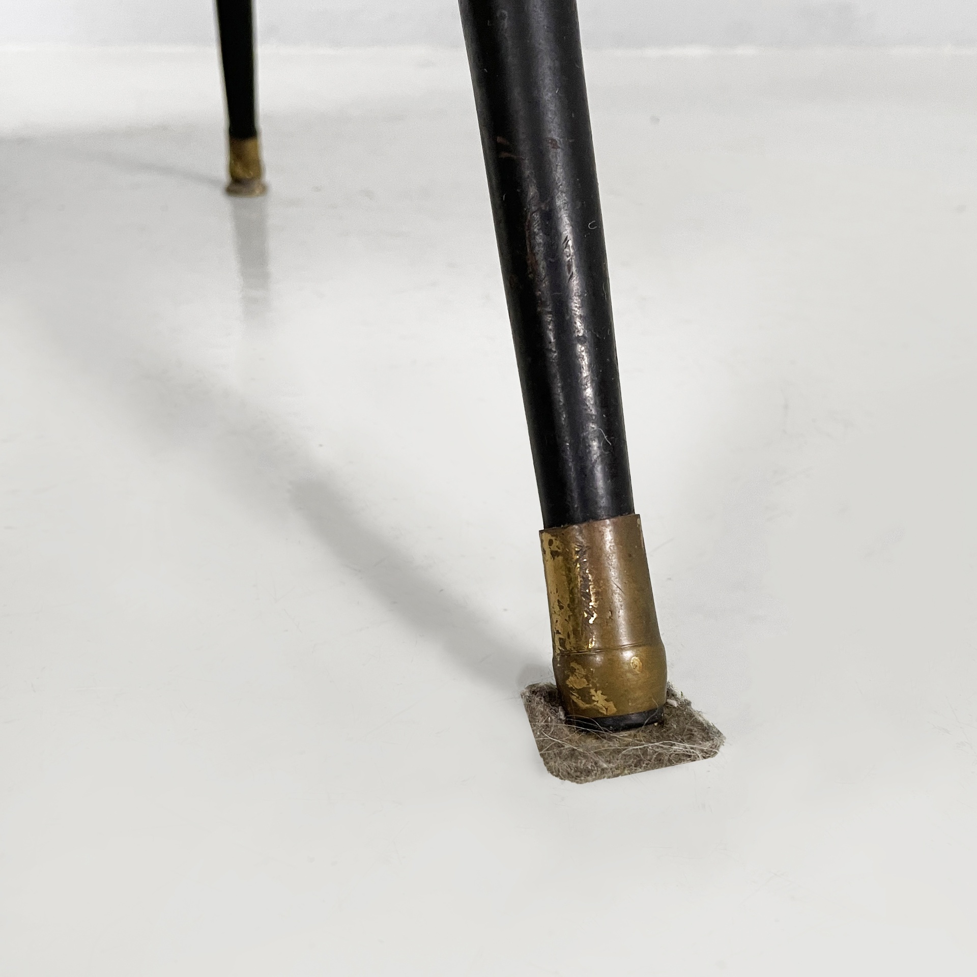 Coppia di poltrone con seduta e schienale imbottiti e rivestiti in tessuto verde. I braccioli sagomati sono rivestiti in tessuto verde. Lo schienale presenta tre bottoni rivestiti in tessuto verde. Le zampe sono in tondino di metallo verniciato nero con piedini in ottone.