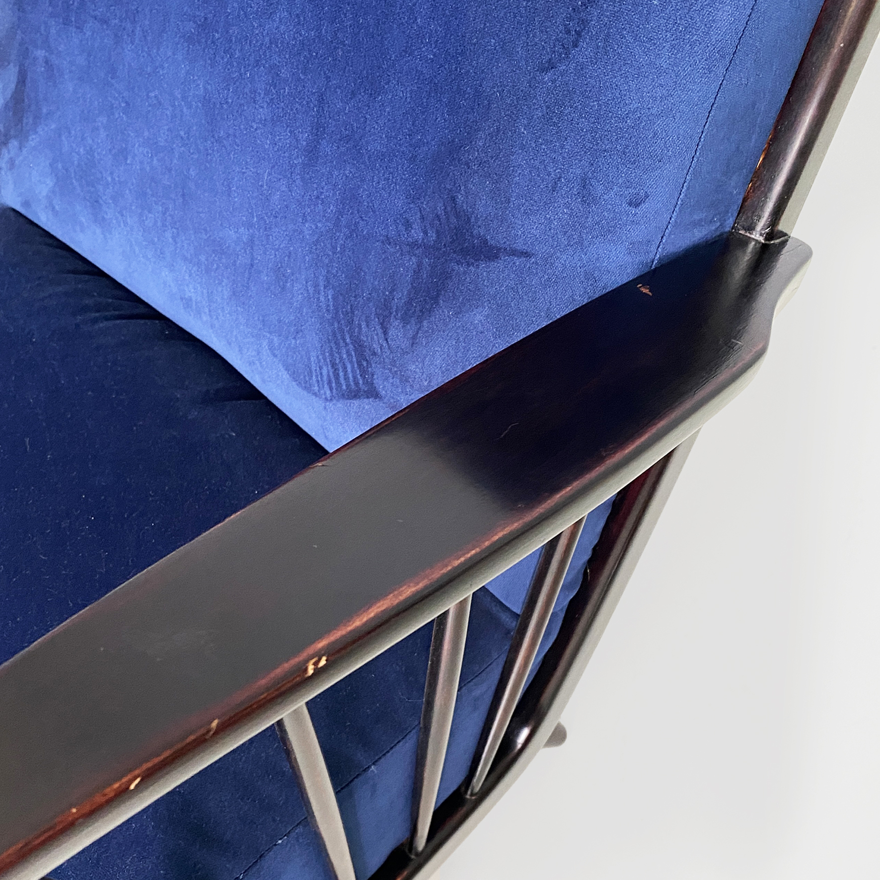 Coppia di poltrone con struttura interamente in legno massello, seduta e schienale imbottiti e rivestiti in velluto blu notte e braccioli ad archetto. Zampe sempre in legno.