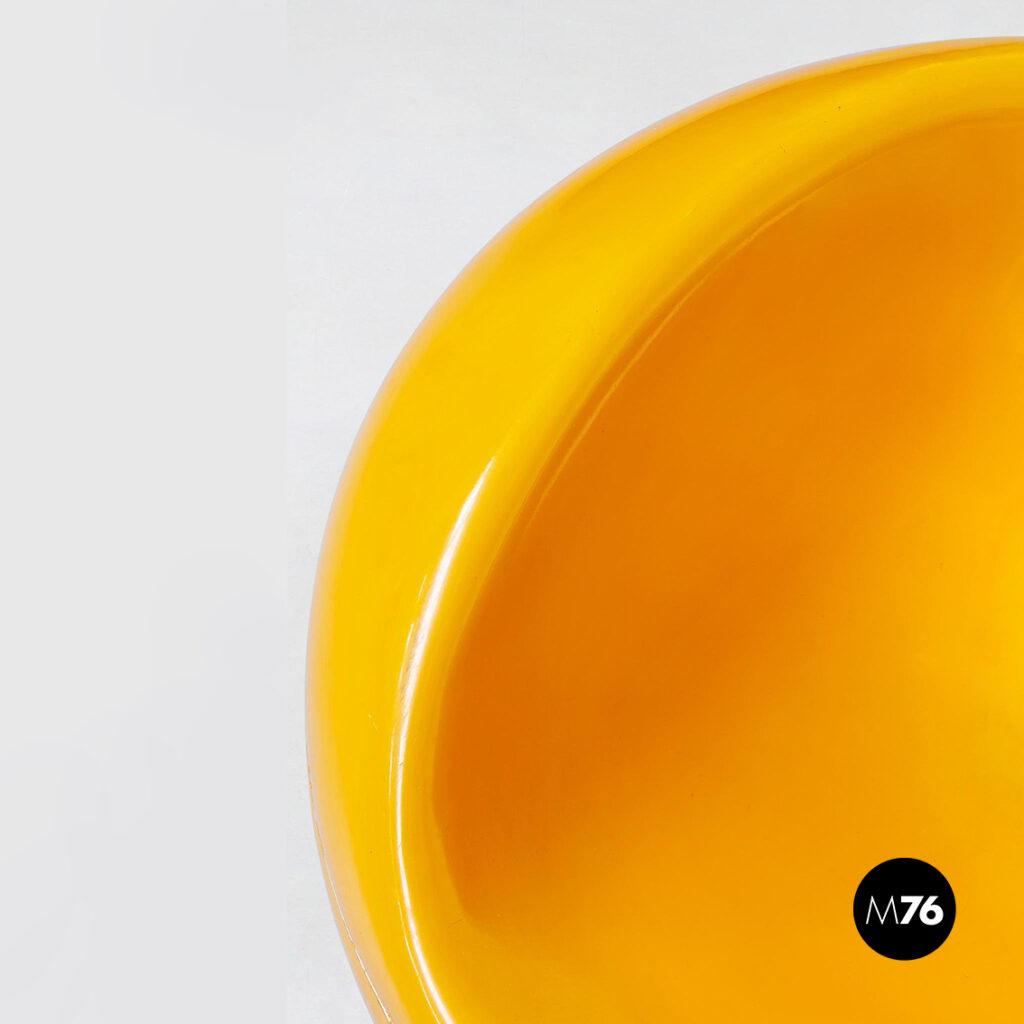 Coppia di poltrone modello Pastille in fibra di vetro gialla fuoco. La struttura di questa seduta è a forma di “caramella”che permette di essere utilizzata anche come sedia a dondolo. Utilizzabile anche in esterno come in giardino.