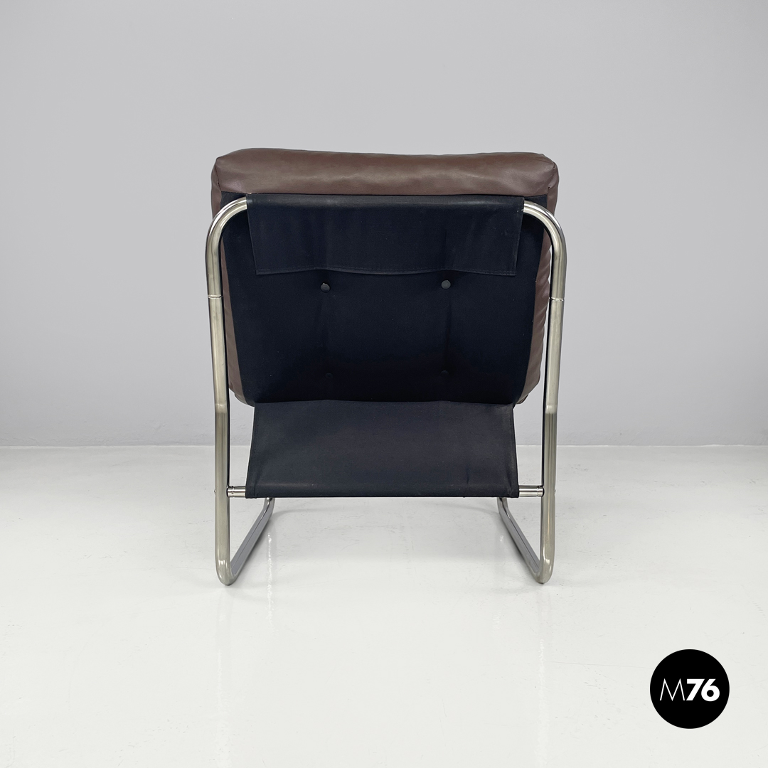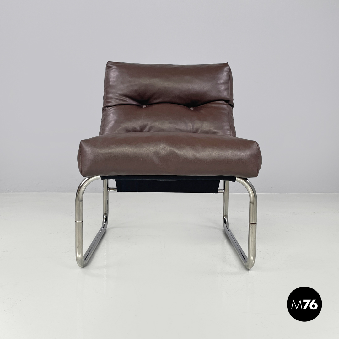 Coppia di poltrone modello Pixi in pelle sintetica marrone. Un unico cuscino imbottito e con otto bottoni compone la seduta e lo schienale, il retro è in tessuto nero. La struttura è in tubolare di metallo cromato.