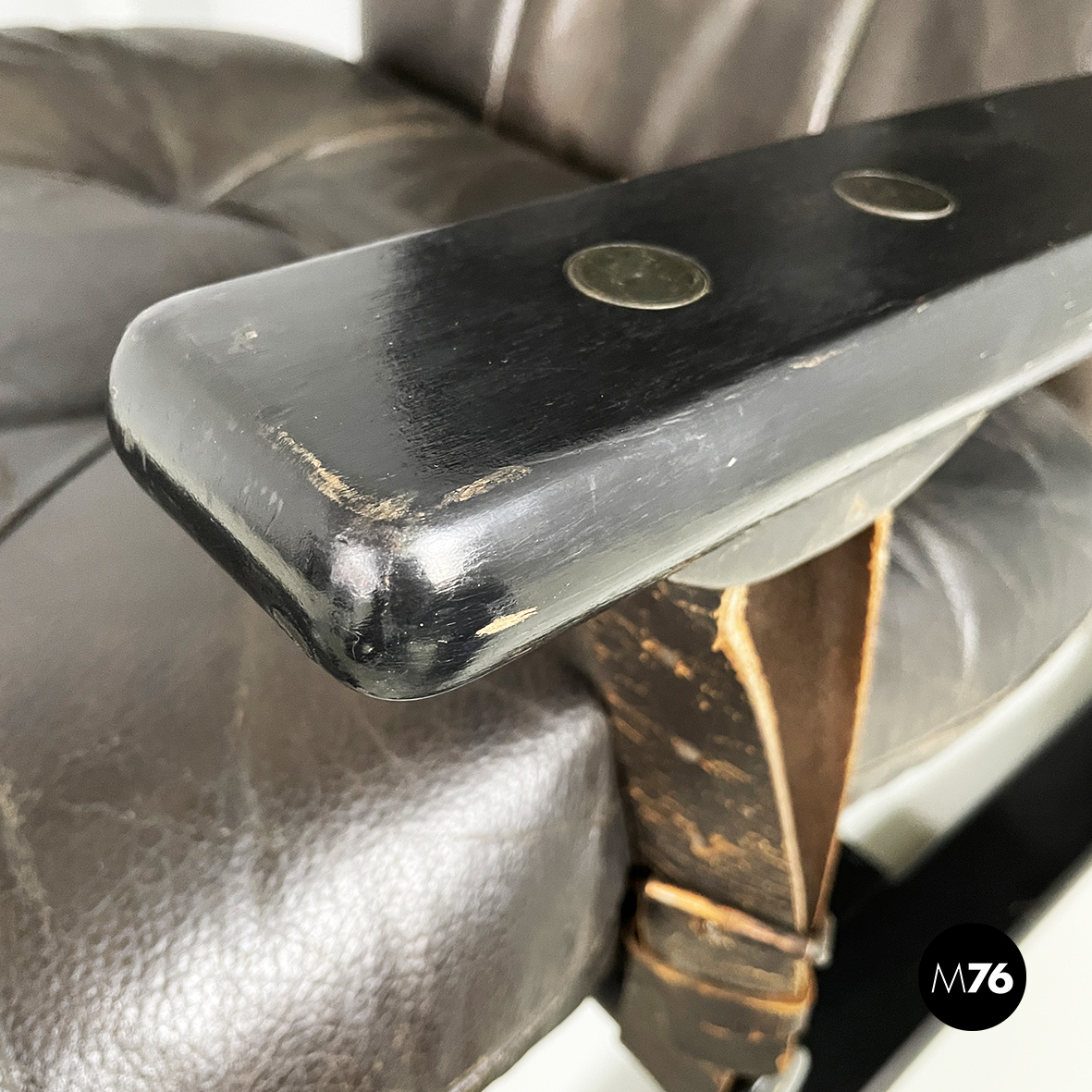 Discrete condizioni. La pelle delle poltrone e dell’ottomana presenta diversi segni dati dall’uso e dal tempo. Le cinghie presentano diversi segni del tempo. Il legno presenta leggeri graffi sparsi.