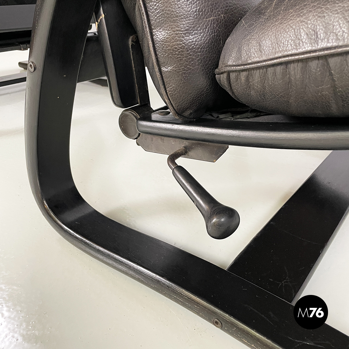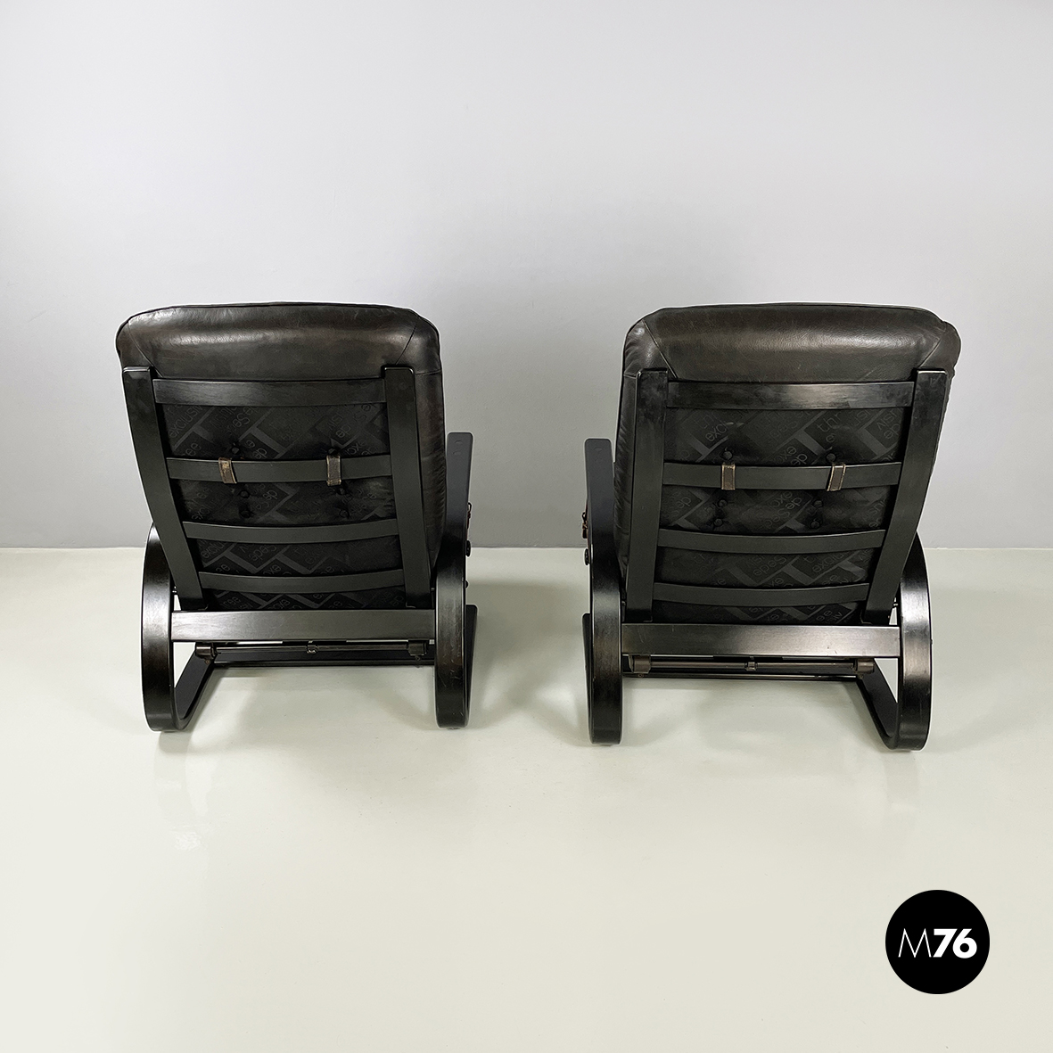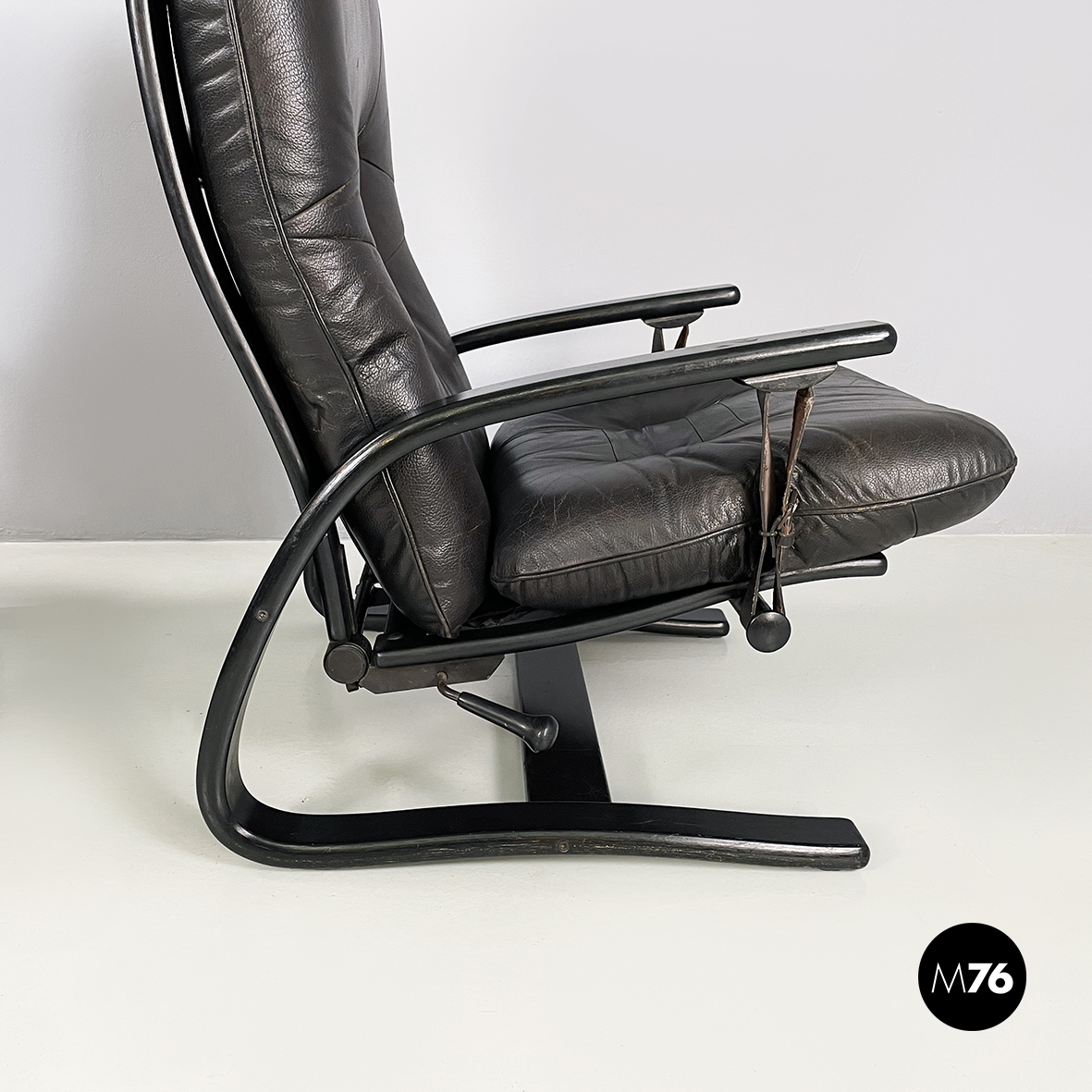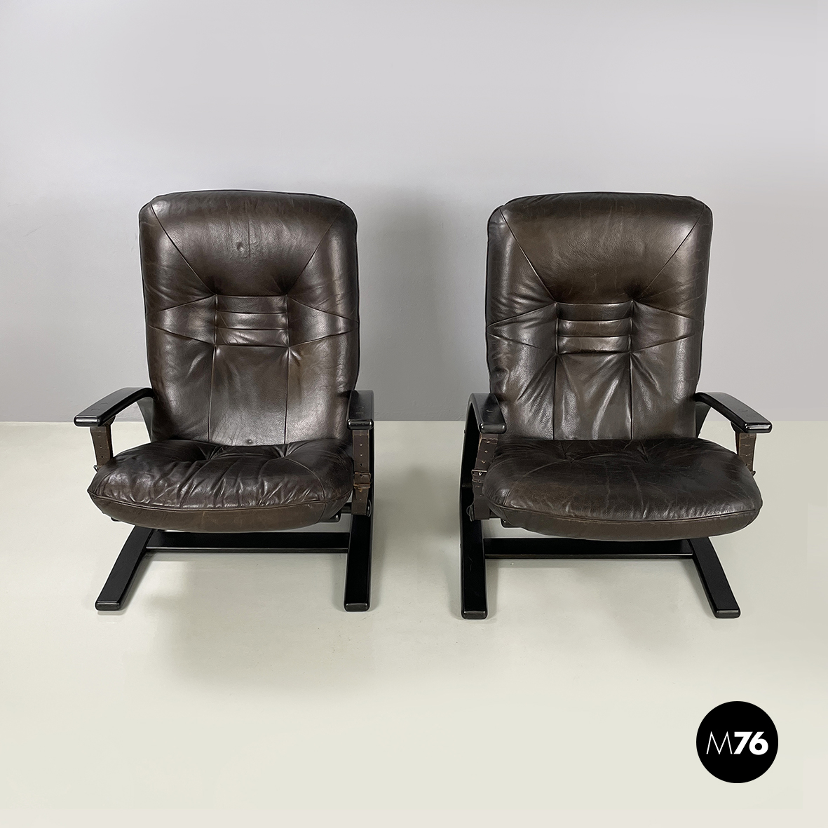 Coppia di poltrone reclinabili e pouf o poggiapiedi in pelle marrone testa di moro e legno scuro. Lo schienale e la seduta squadrati sono imbottiti e rivestiti in pelle marrone scuro, inoltre presentano bottoni. Lo schienale della poltrona è reclinabile grazie ad una manopola presenta a lato della seduta. Lo schienale e la seduta sono collegati alla struttura grazie a delle cinghie di cuoio. La struttura è composta da listelli di legno. I braccioli curvati e la zampa, anche essi in legno a sezione rettangolare, hanno una forma a C. Il pouf ha un cuscino imbottito e rivestito in pelle marrone e presenta la medesima struttura delle poltrone.
