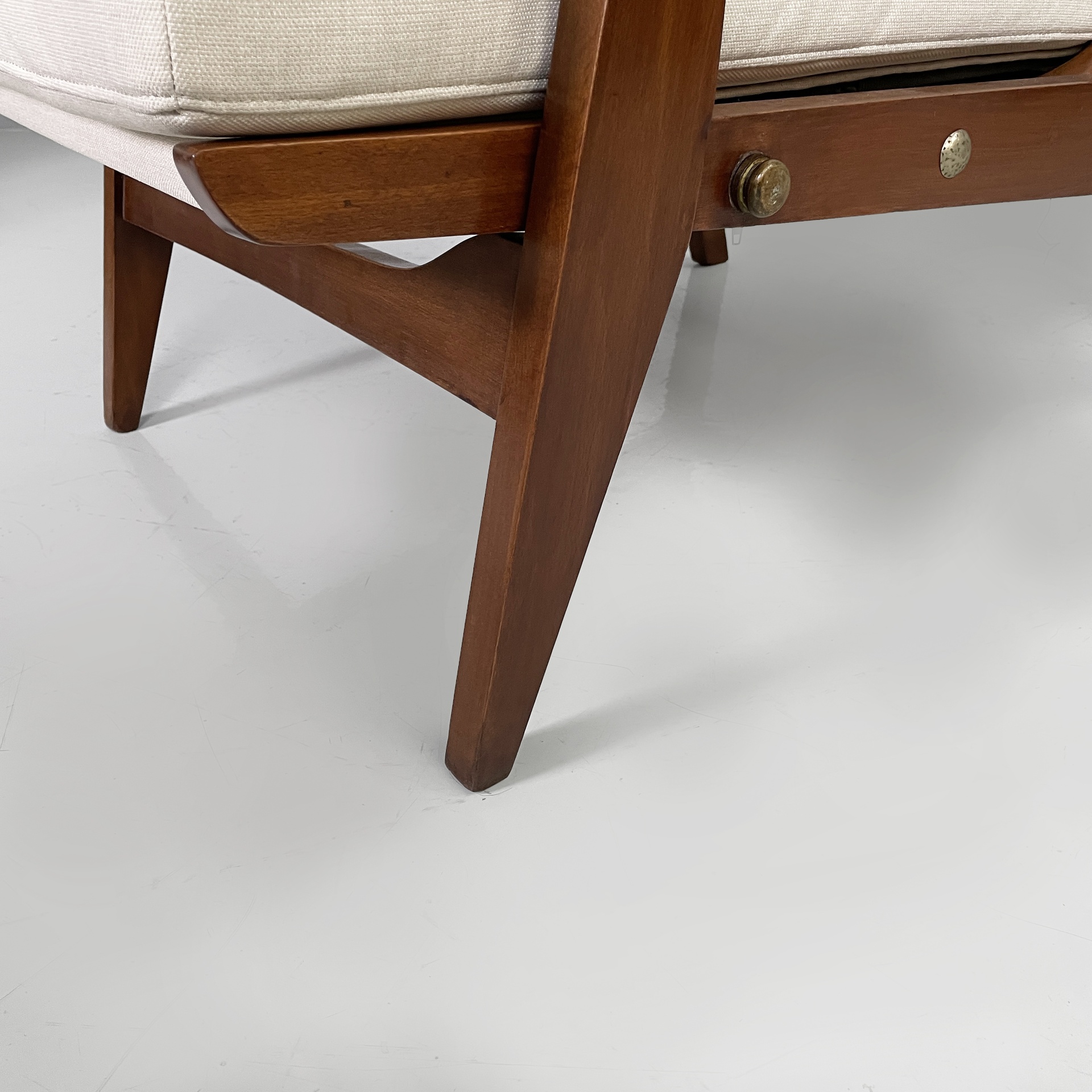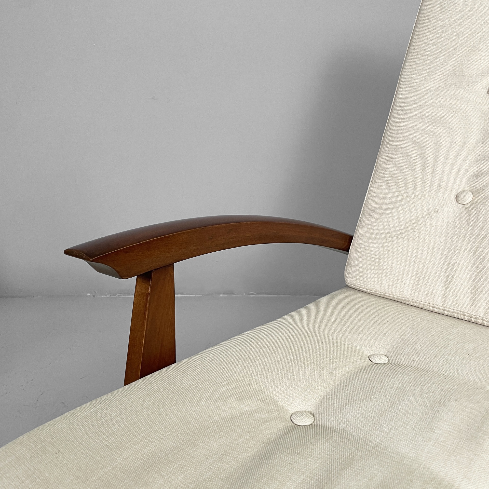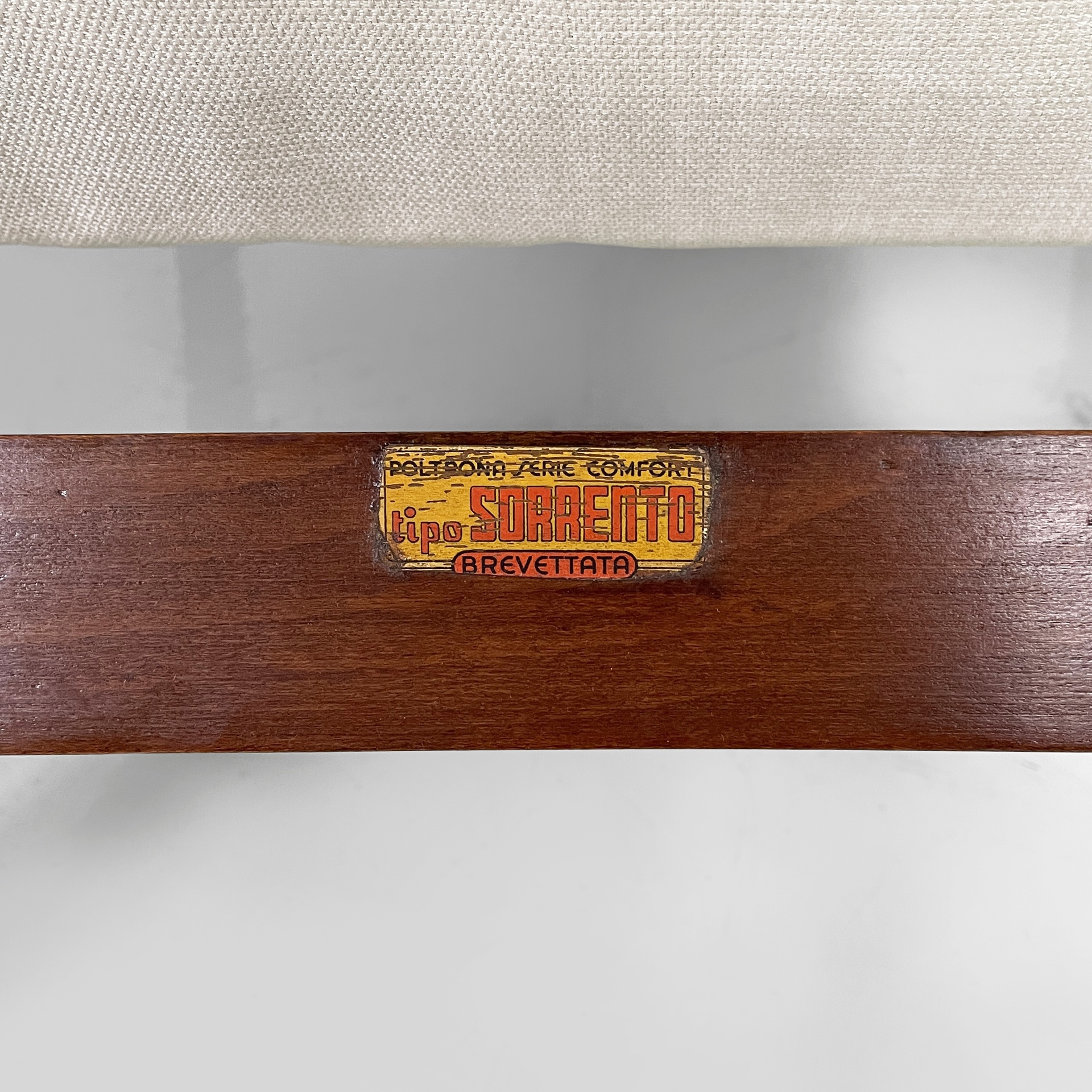Coppia di poltrone reclinabili modello Sorrento. La seduta e lo schienale sono composti da due cuscini imbottiti e rivestiti in tessuto bianco con bottoni. La struttura è in legno, con rifinitura in tessuto bianco. I braccioli in legno sono curvati. Sui lati sono presenti due elementi sporgenti in ottone, che se estratti insieme, permettono alla seduta di reclinarsi. Zampe a sezione squadrata in legno.