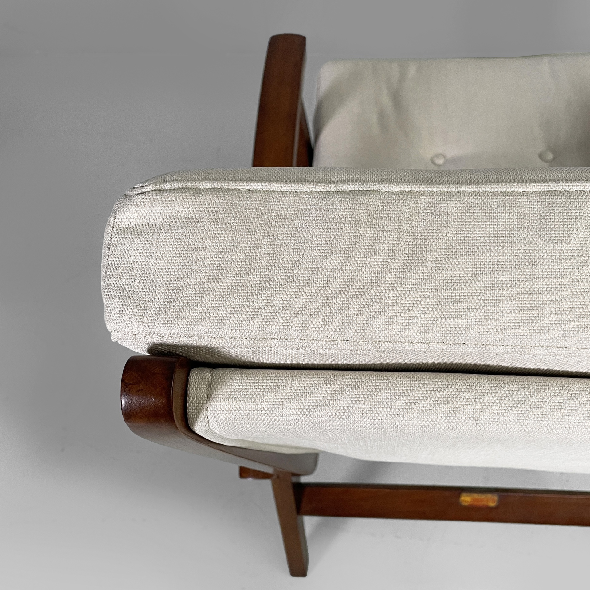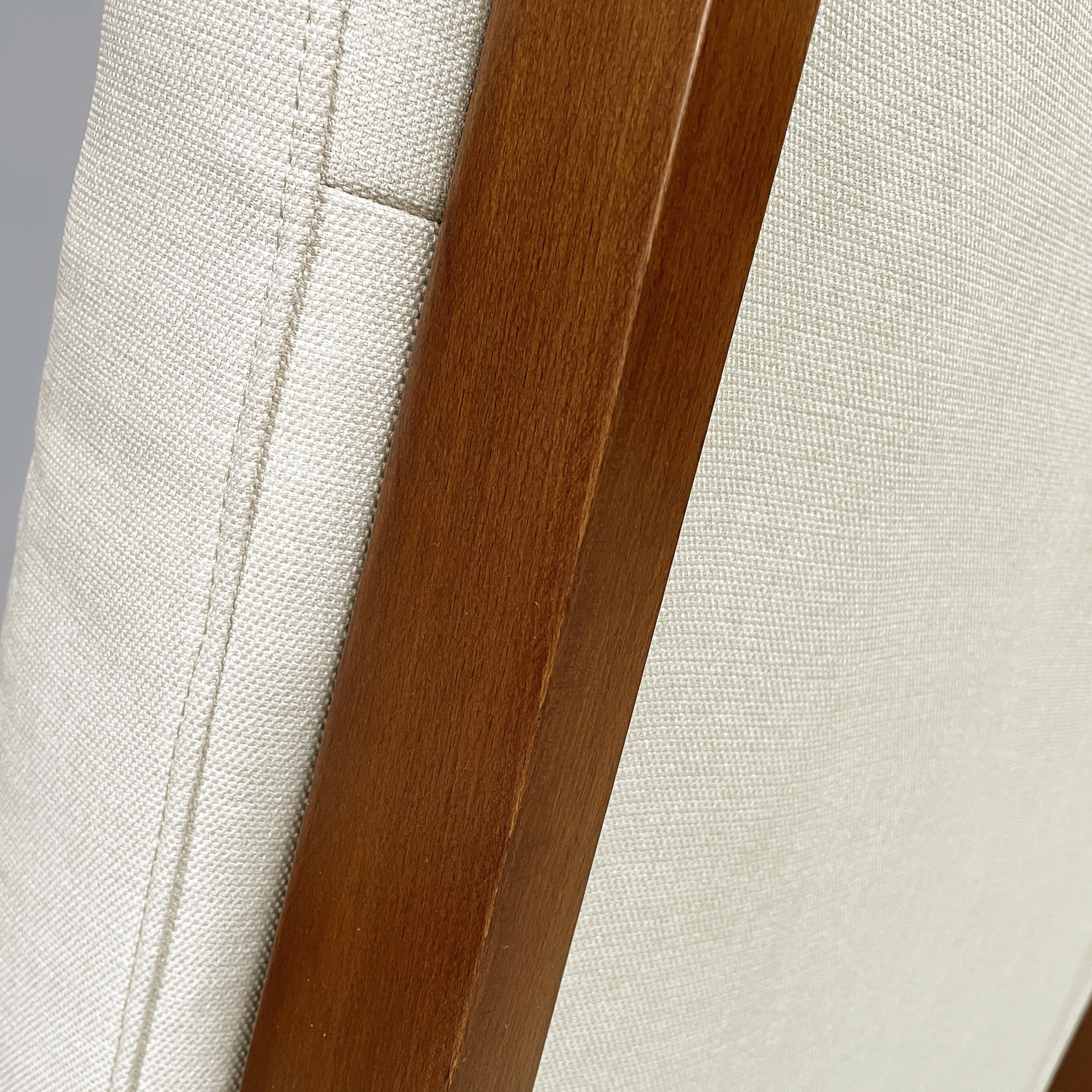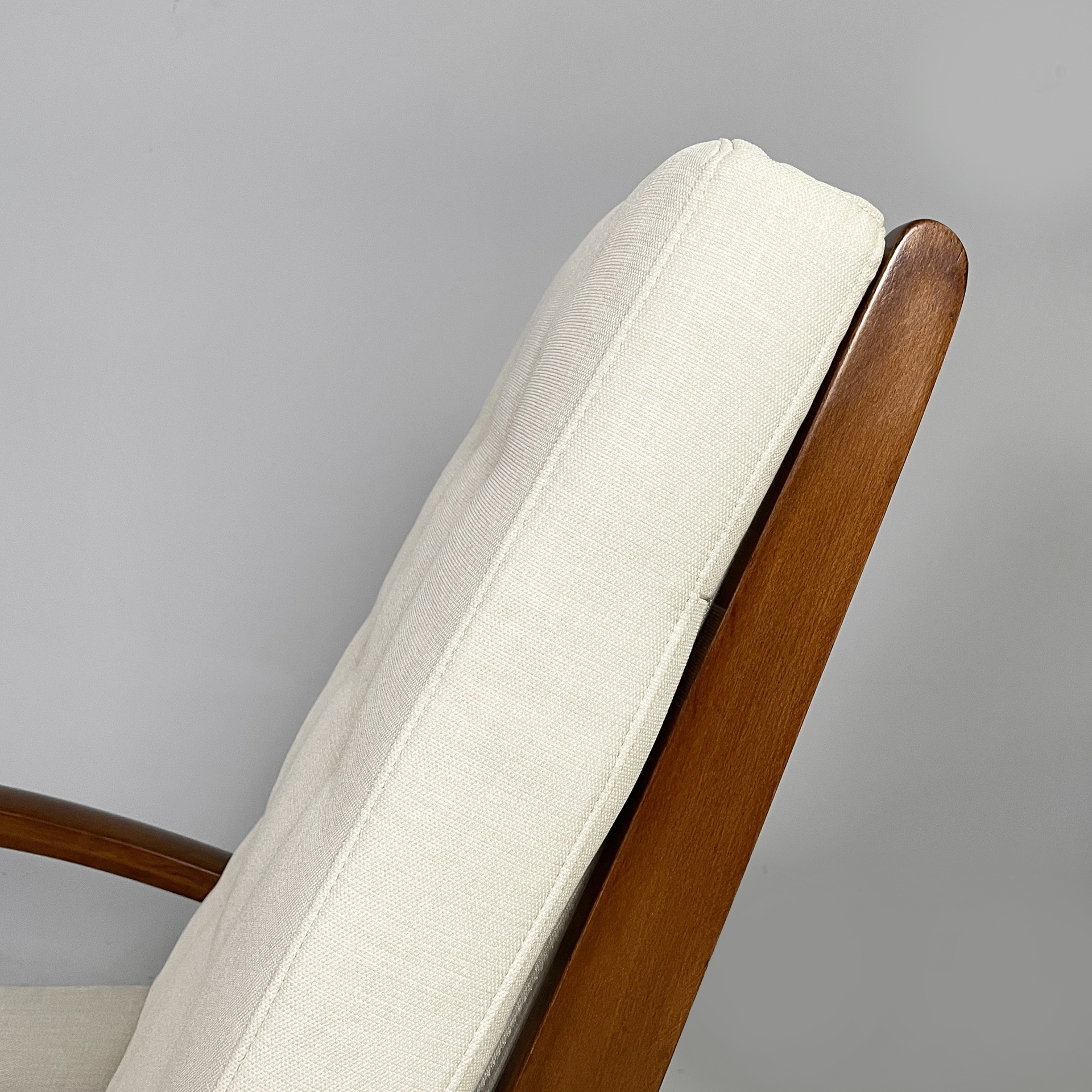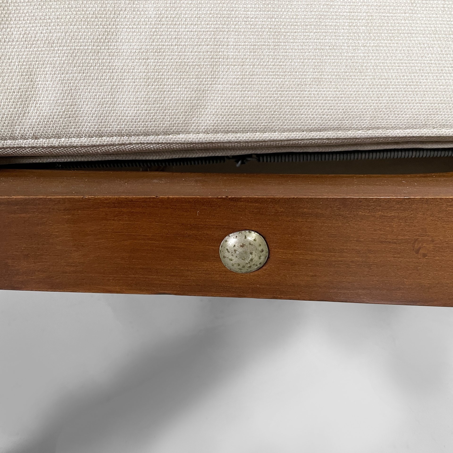 Coppia di poltrone reclinabili modello Sorrento. La seduta e lo schienale sono composti da due cuscini imbottiti e rivestiti in tessuto bianco con bottoni. La struttura è in legno, con rifinitura in tessuto bianco. I braccioli in legno sono curvati. Sui lati sono presenti due elementi sporgenti in ottone, che se estratti insieme, permettono alla seduta di reclinarsi. Zampe a sezione squadrata in legno.
