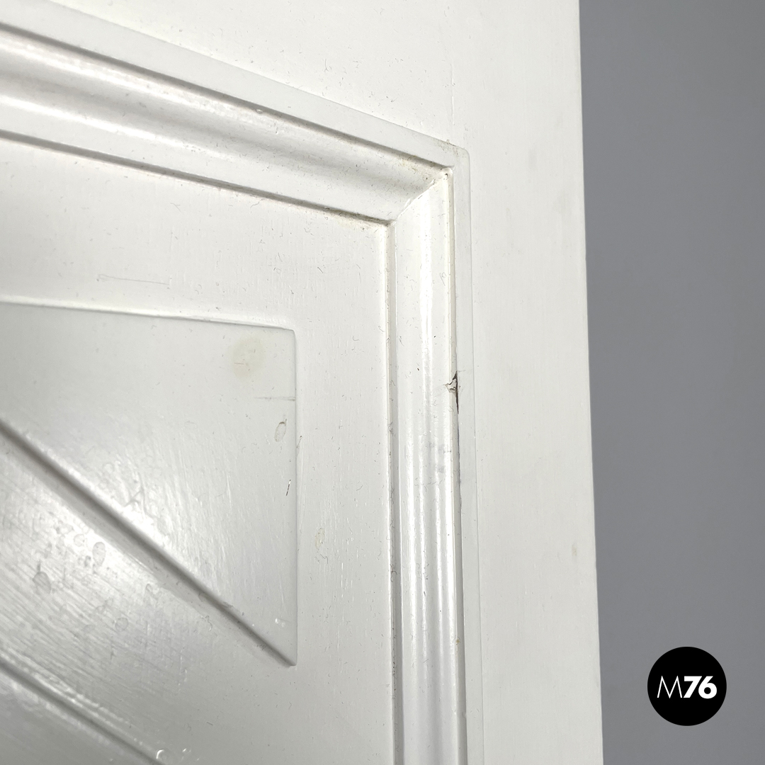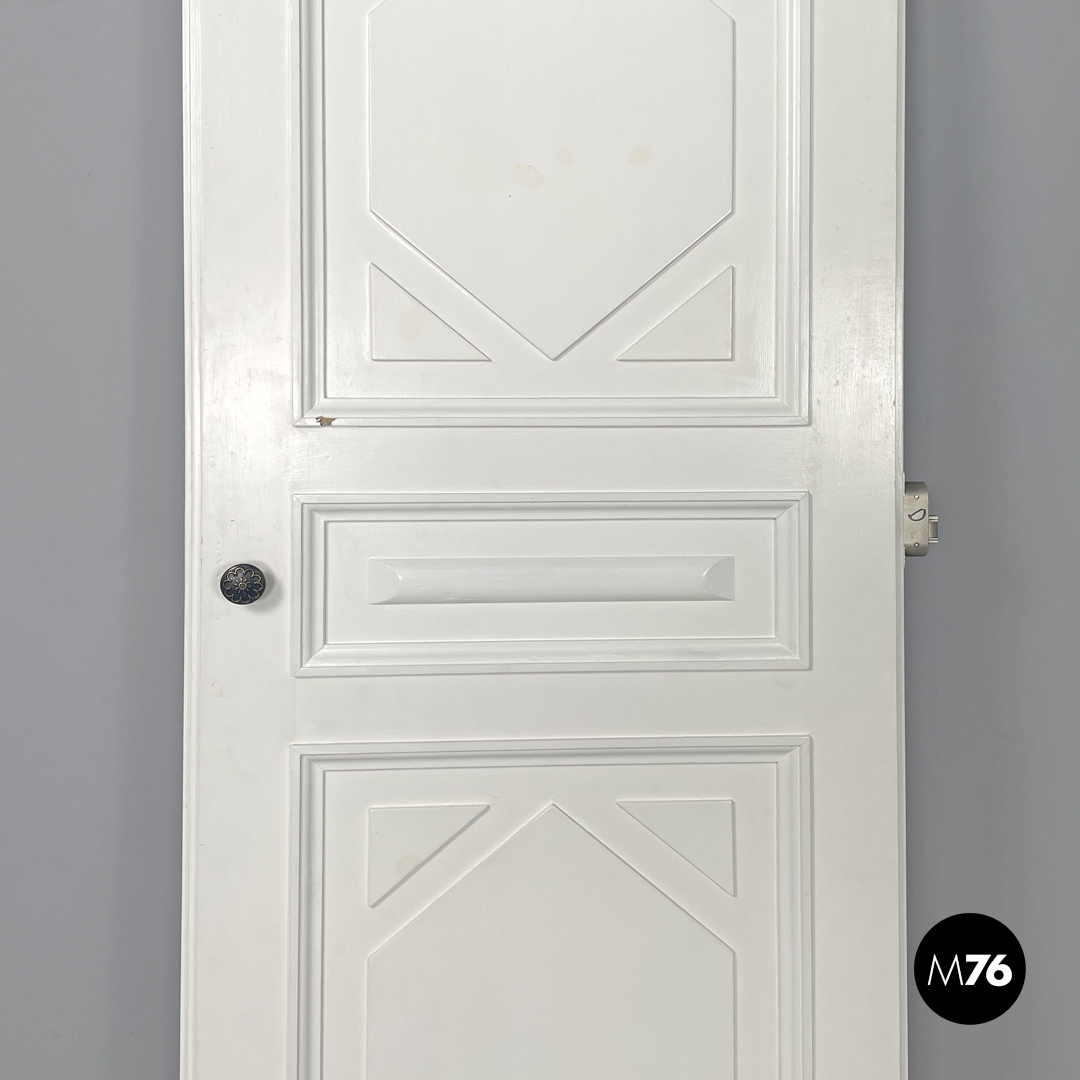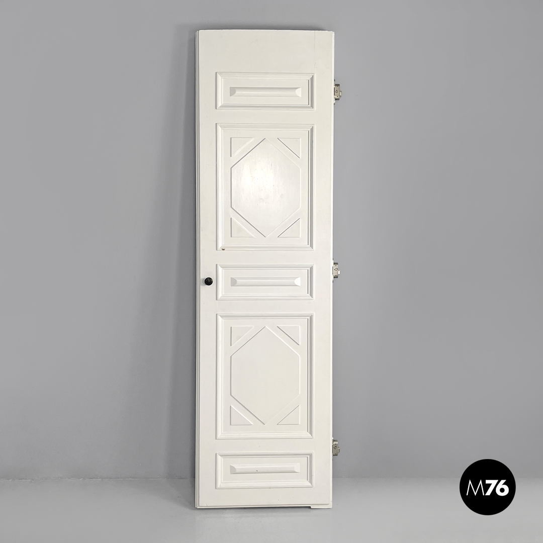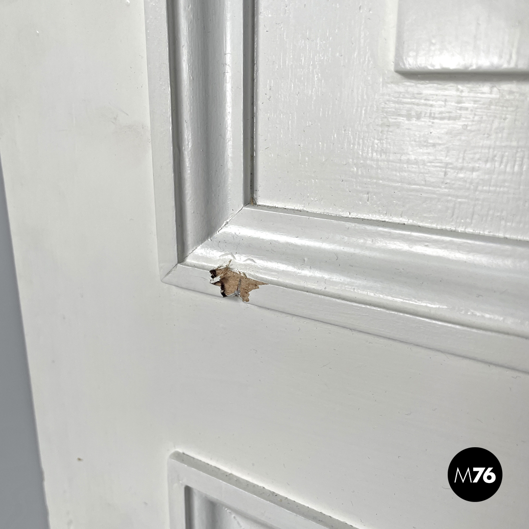 Porta singola a battente interamente in legno verniciato bianco. Una “faccia” della porta è decorate con pattern geometrici con una piccola maniglia in ottone tonda con decorazioni floreali; l’altra è liscia con una maniglia in metallo argentata. La porta presenta delle cerniere in metallo.