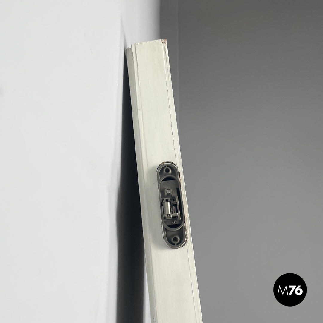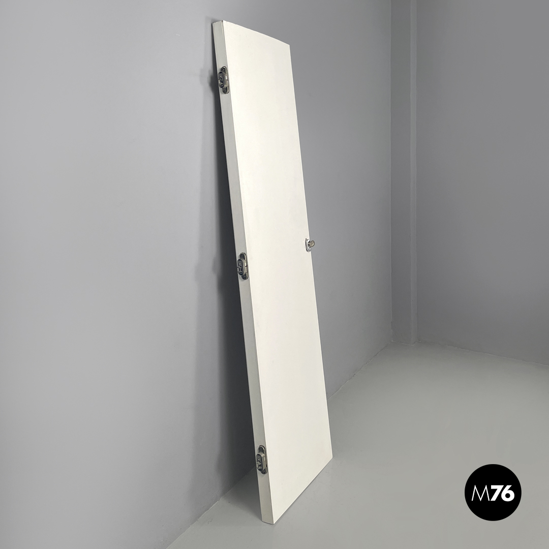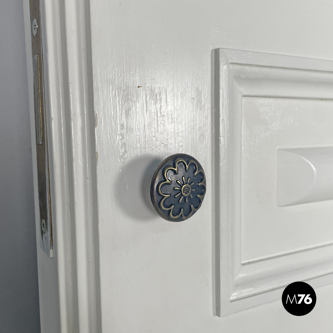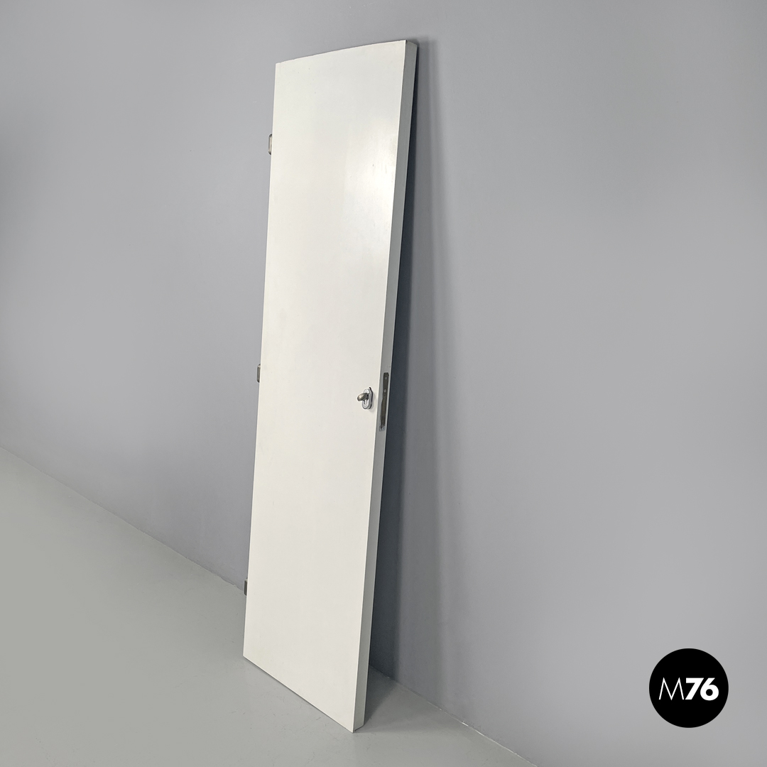 Porta singola a battente interamente in legno verniciato bianco. Una “faccia” della porta è decorate con pattern geometrici con una piccola maniglia in ottone tonda con decorazioni floreali; l’altra è liscia con una maniglia in metallo argentata. La porta presenta delle cerniere in metallo.
