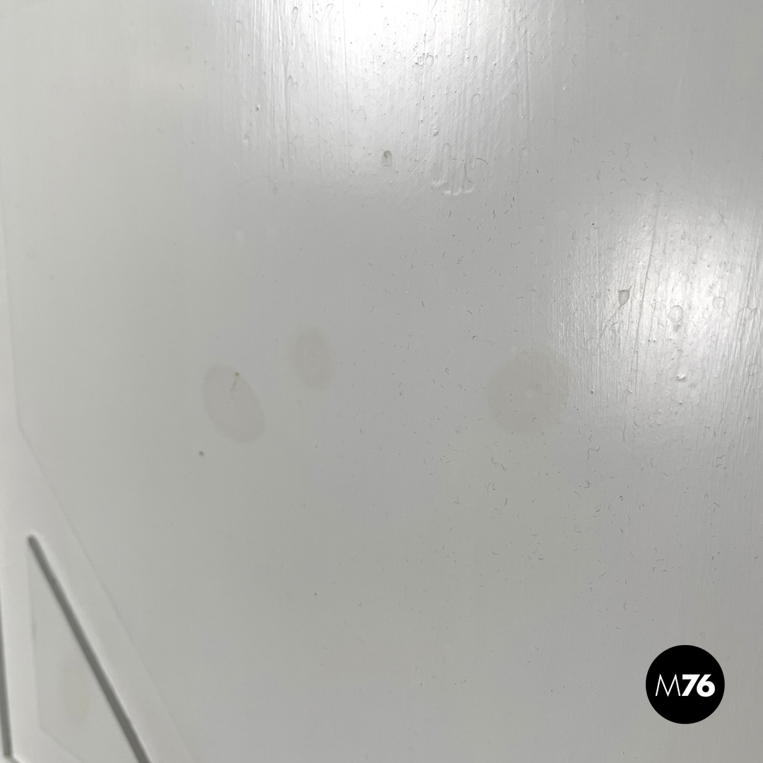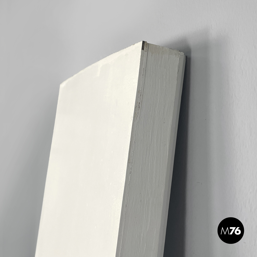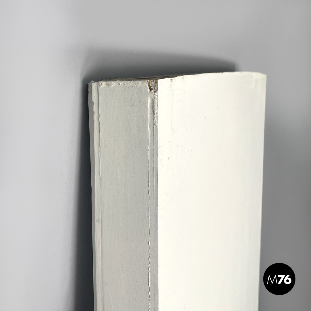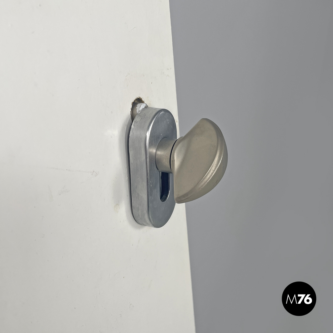 Porta singola a battente interamente in legno verniciato bianco. Una “faccia” della porta è decorate con pattern geometrici con una piccola maniglia in ottone tonda con decorazioni floreali; l’altra è liscia con una maniglia in metallo argentata. La porta presenta delle cerniere in metallo.