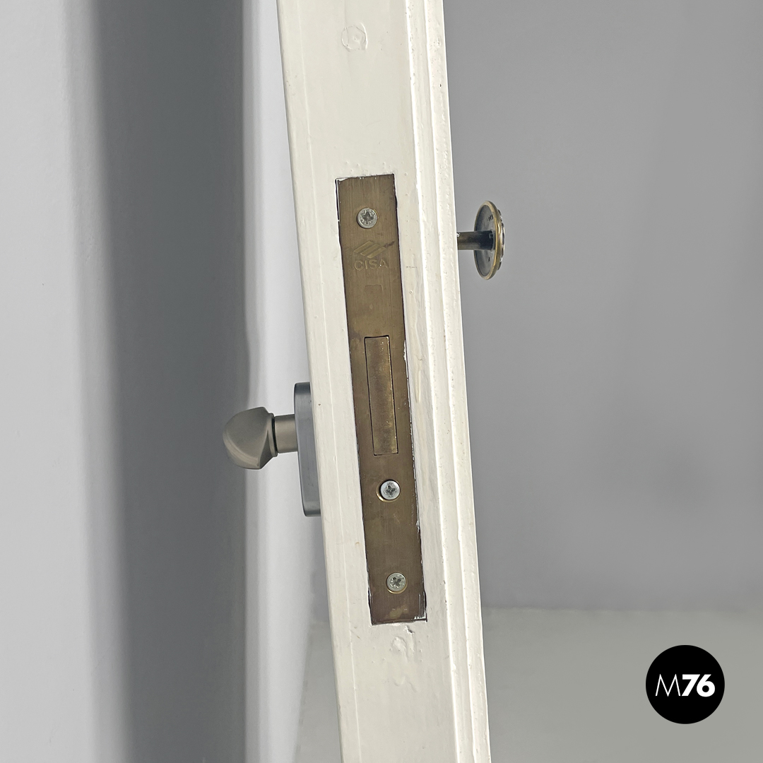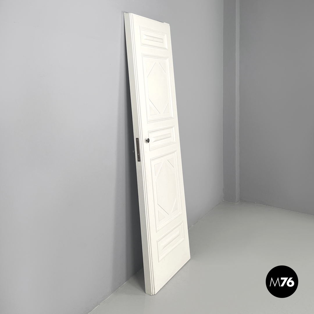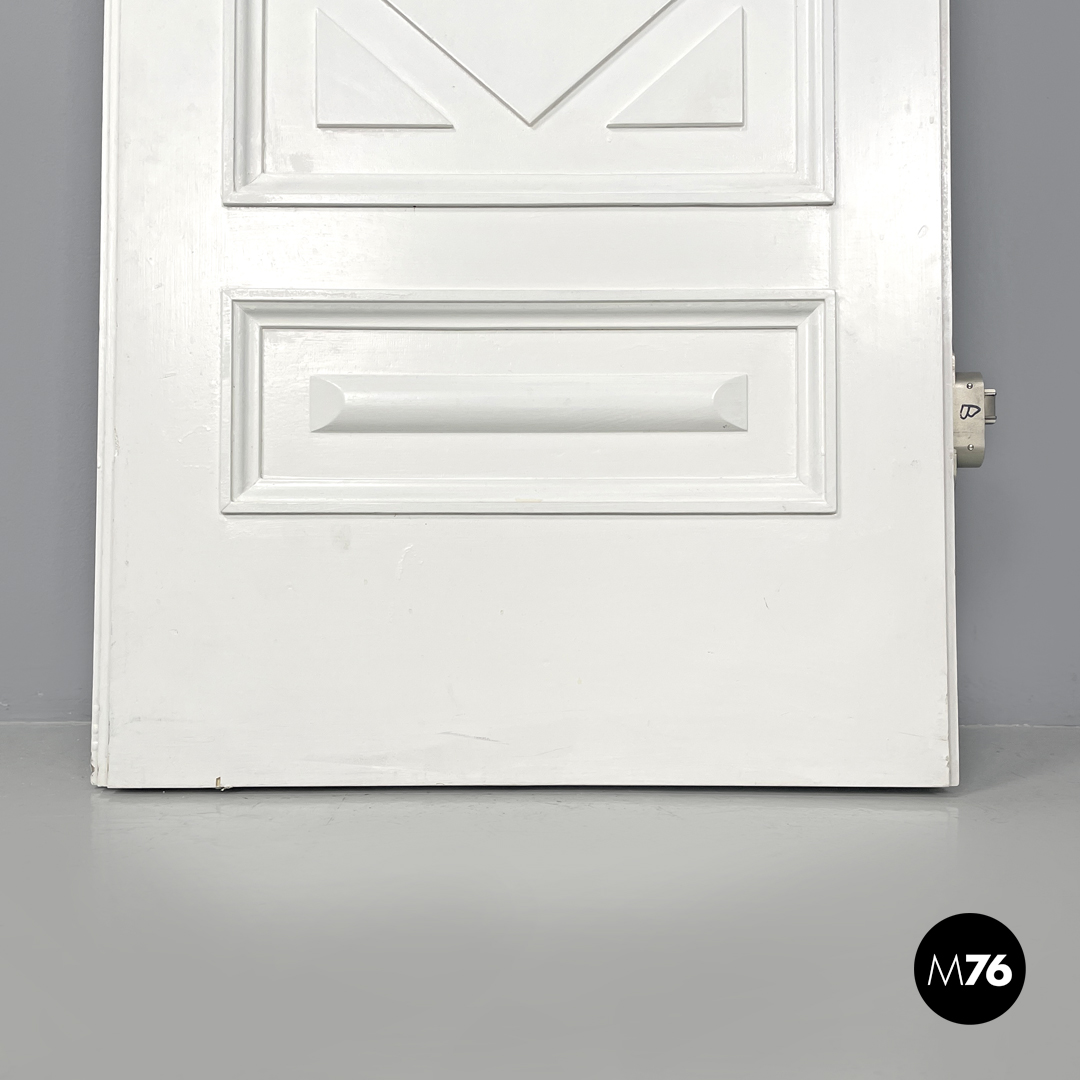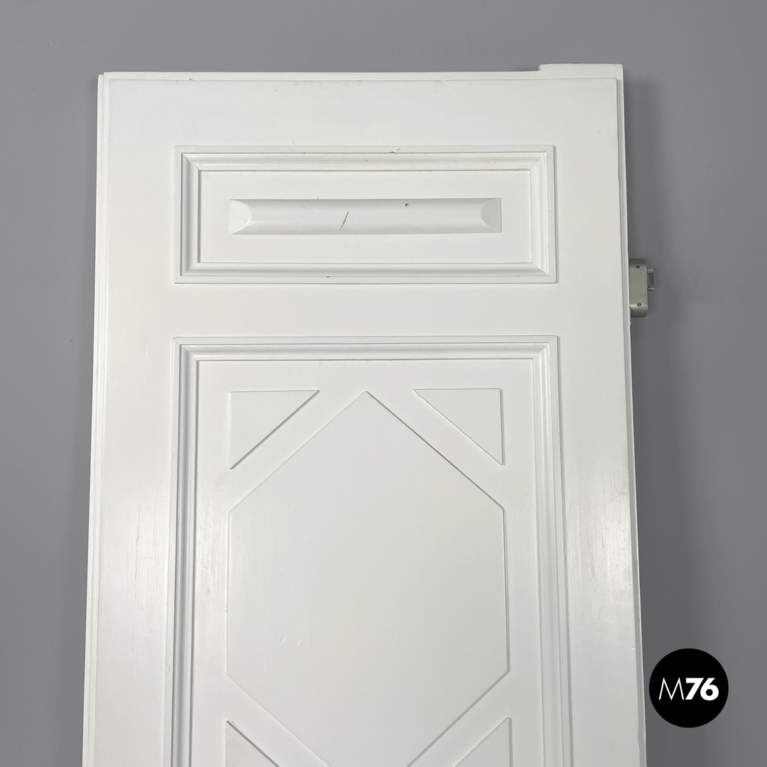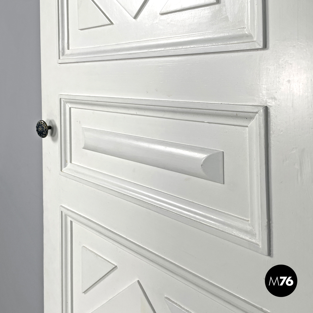 Porta singola a battente interamente in legno verniciato bianco. Una “faccia” della porta è decorata con pattern geometrici con una piccola maniglia in ottone tonda con decorazioni floreali; l’altra è liscia con una maniglia in metallo argentata. La porta presenta delle cerniere in metallo.