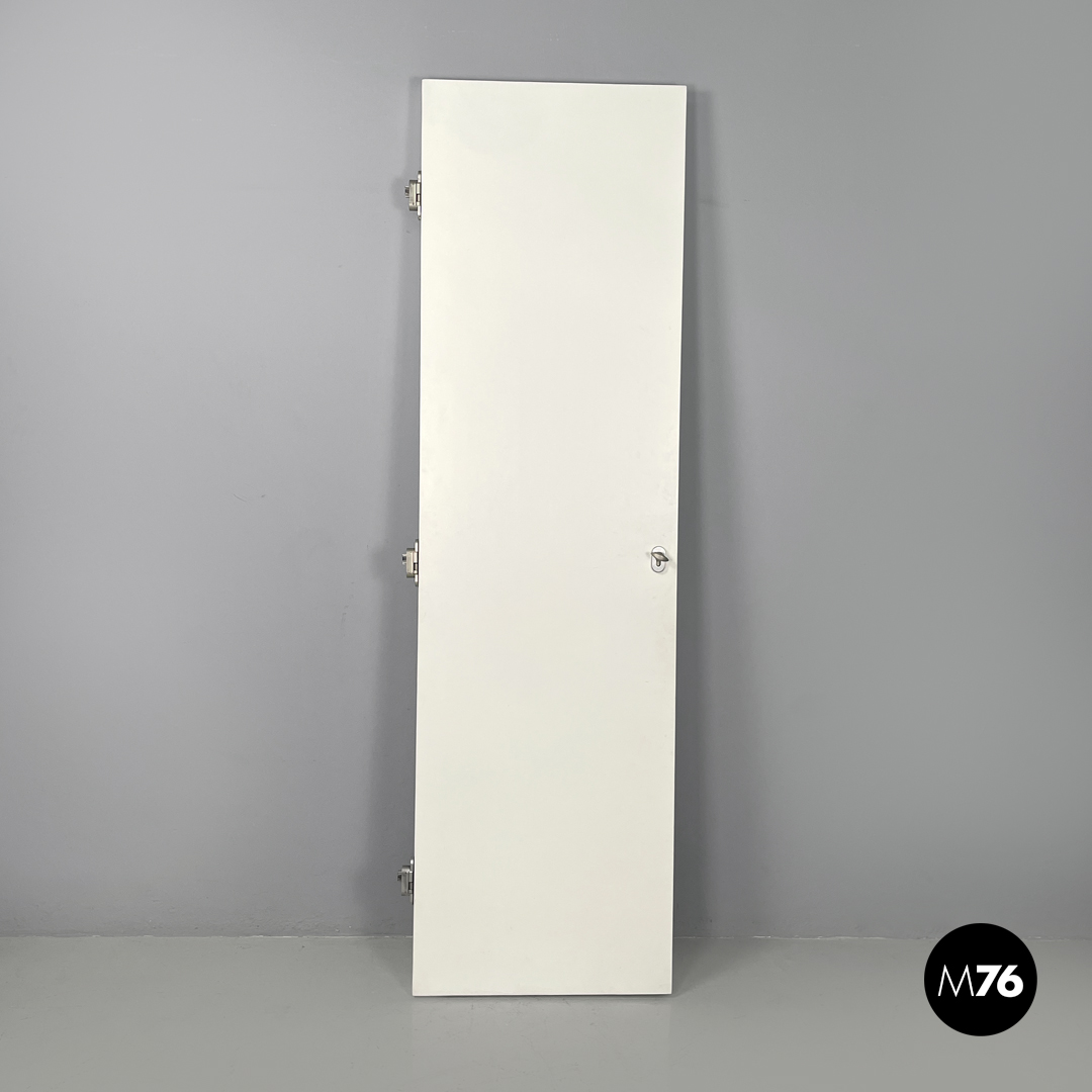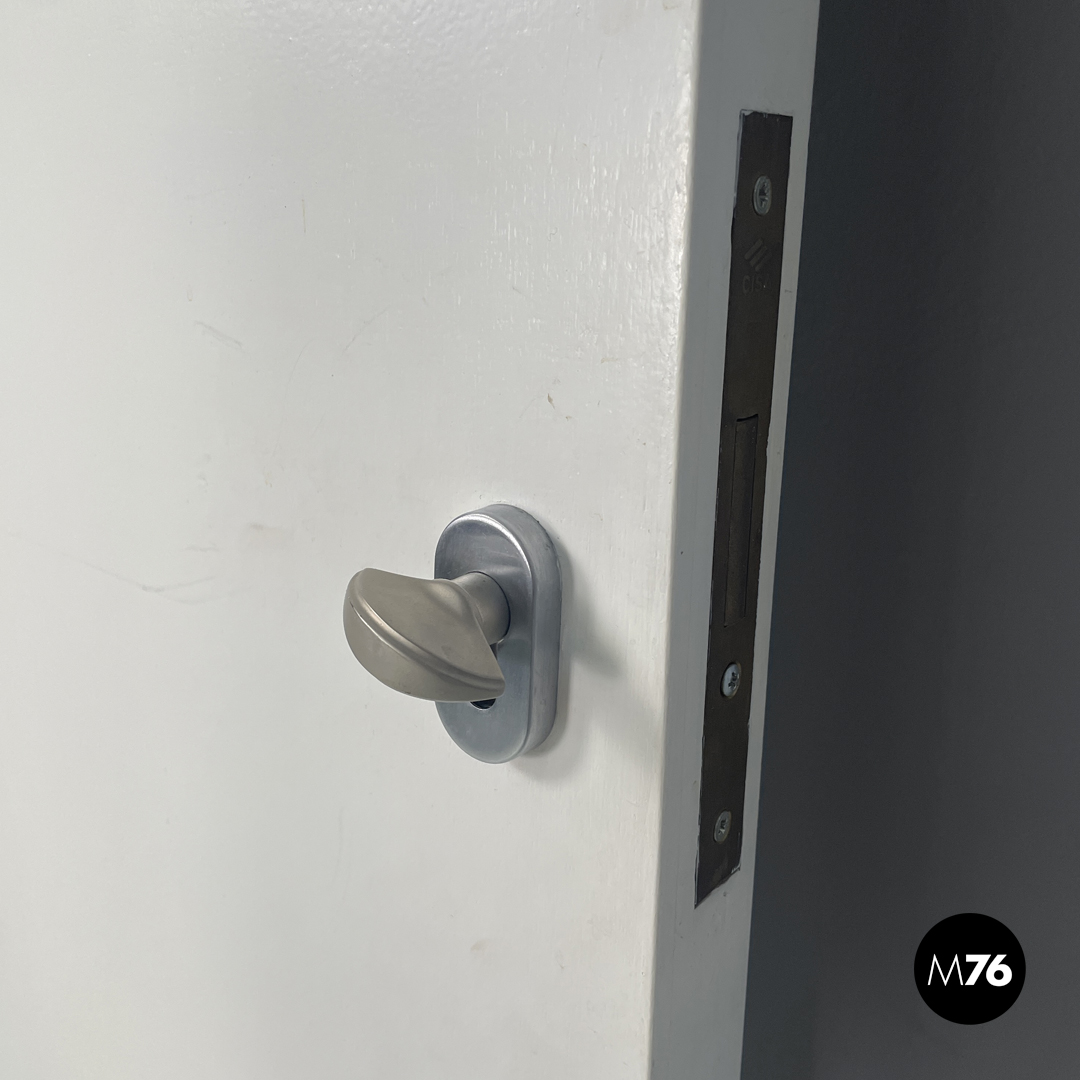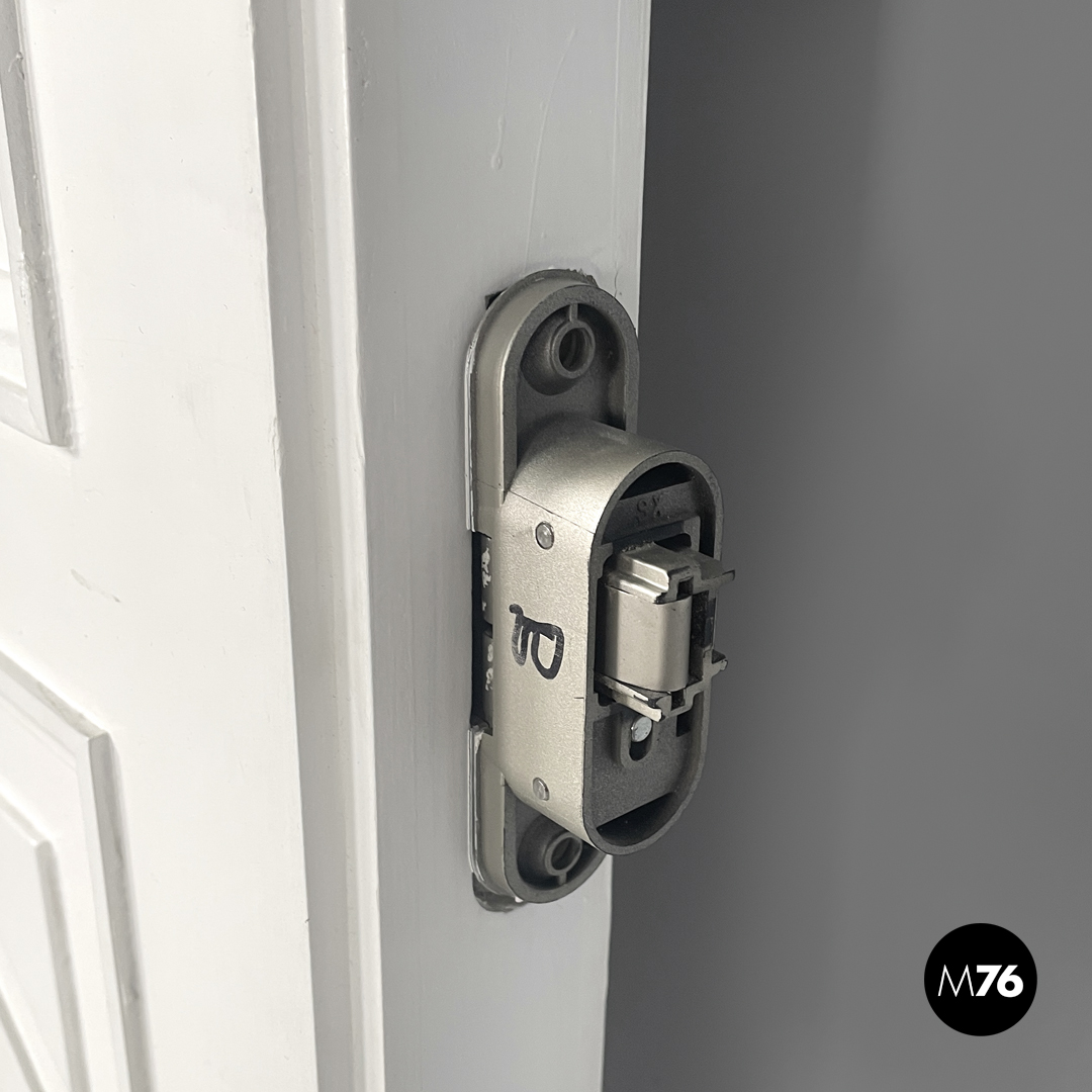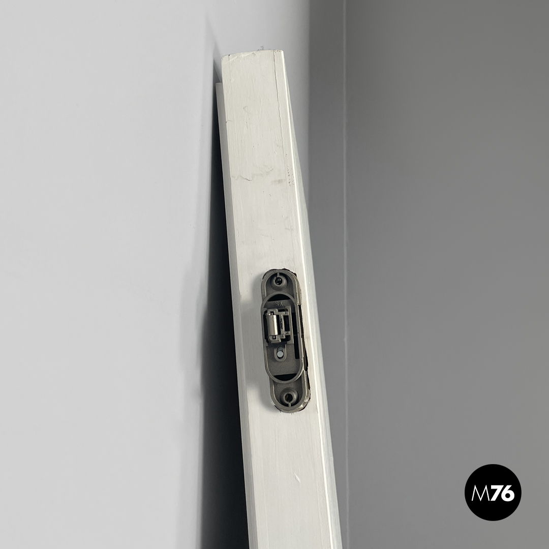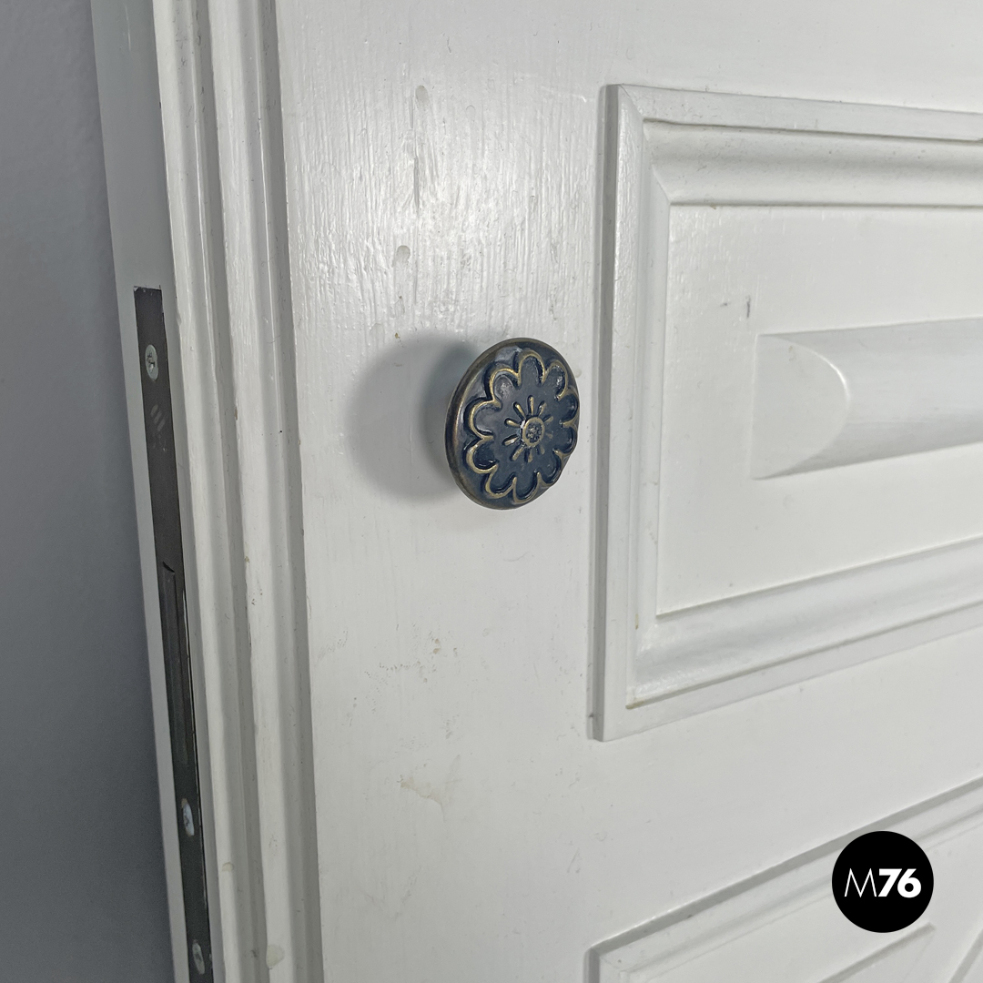 Porta singola a battente interamente in legno verniciato bianco. Una “faccia” della porta è decorata con pattern geometrici con una piccola maniglia in ottone tonda con decorazioni floreali; l’altra è liscia con una maniglia in metallo argentata. La porta presenta delle cerniere in metallo.