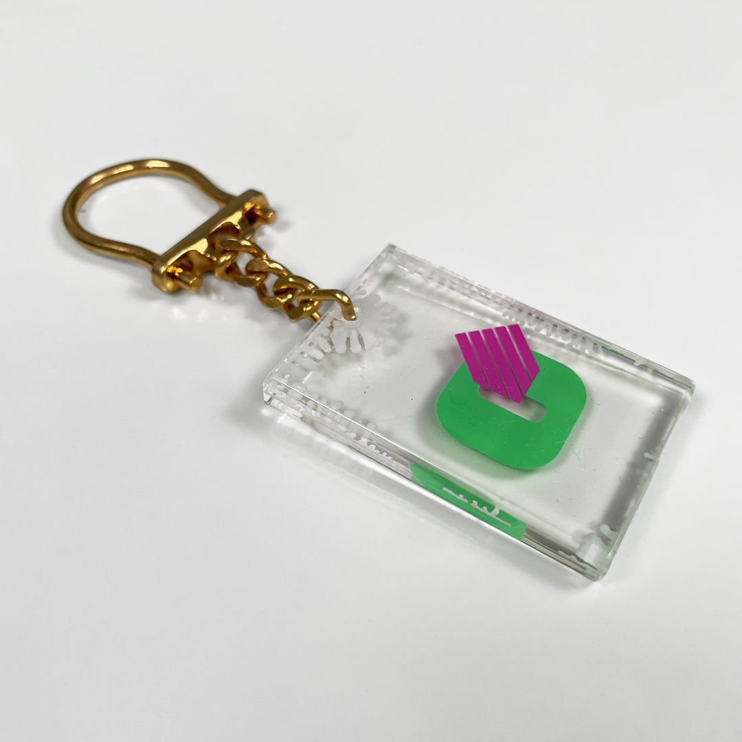 Portachiavi in plastica trasparente. Presenta una catena con gancio in metallo colore oro e ciondolo in plastica con logo. Completo di scatola.