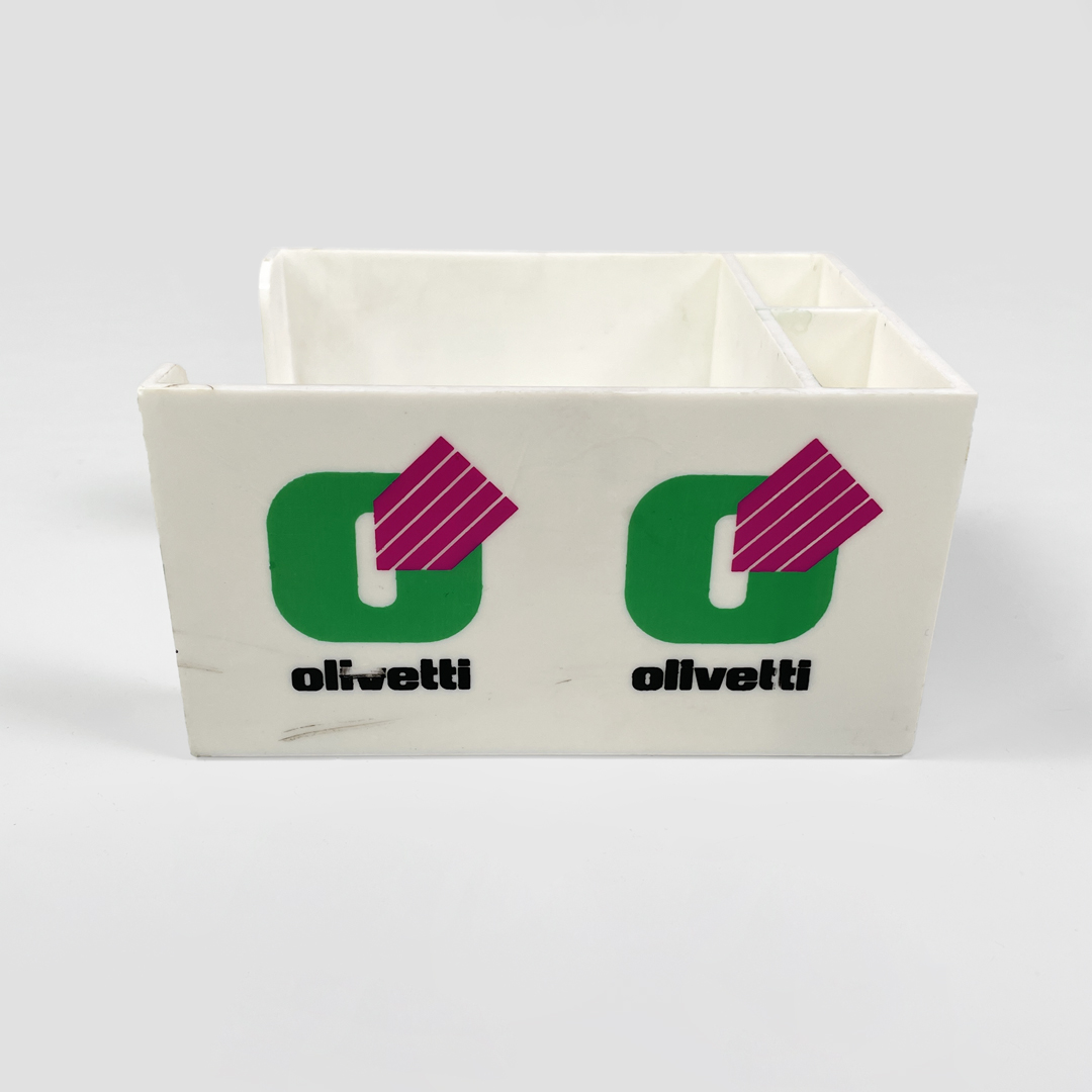 Portaoggetti in plastica bianca. Presenta tre vani, due di uguale dimensione e uno più largo. Su due lati è stampato il logo.