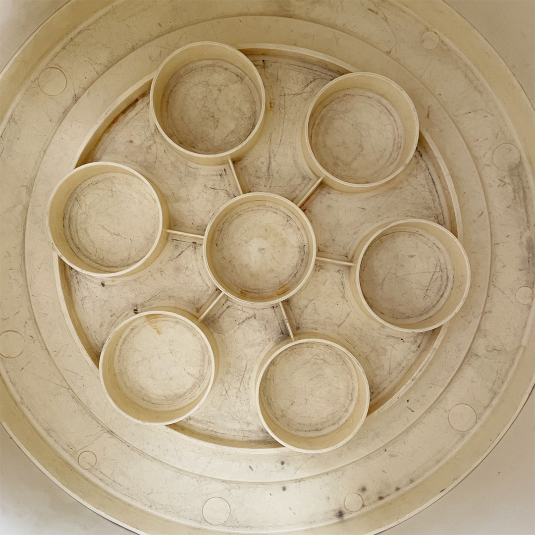 Portaombrelli modello Dedalo interamente in plastica. La struttura a base tonda è in ABS di colore bianco. Presenta sette spazi per l’inserimento degli ombrelli.