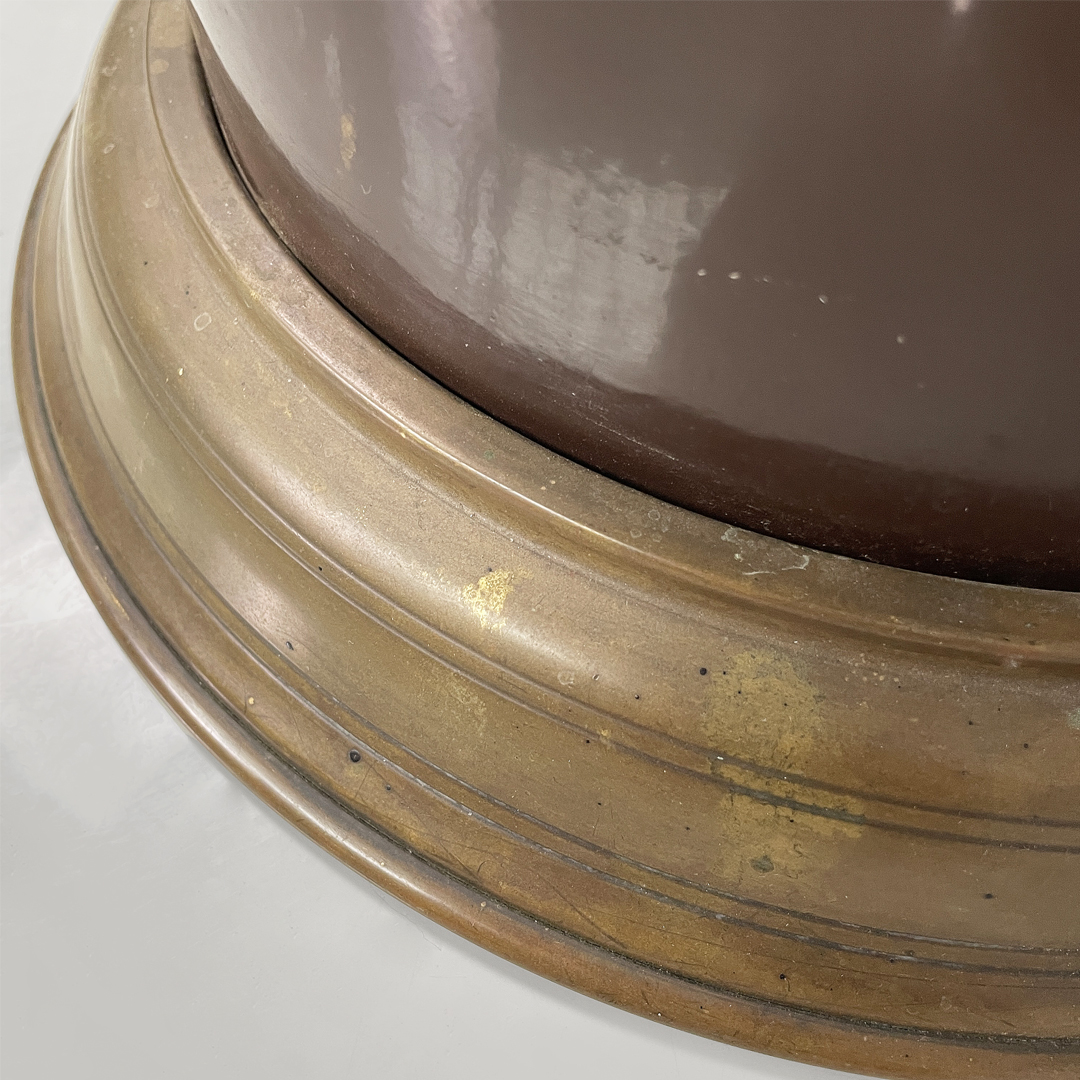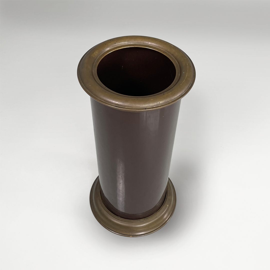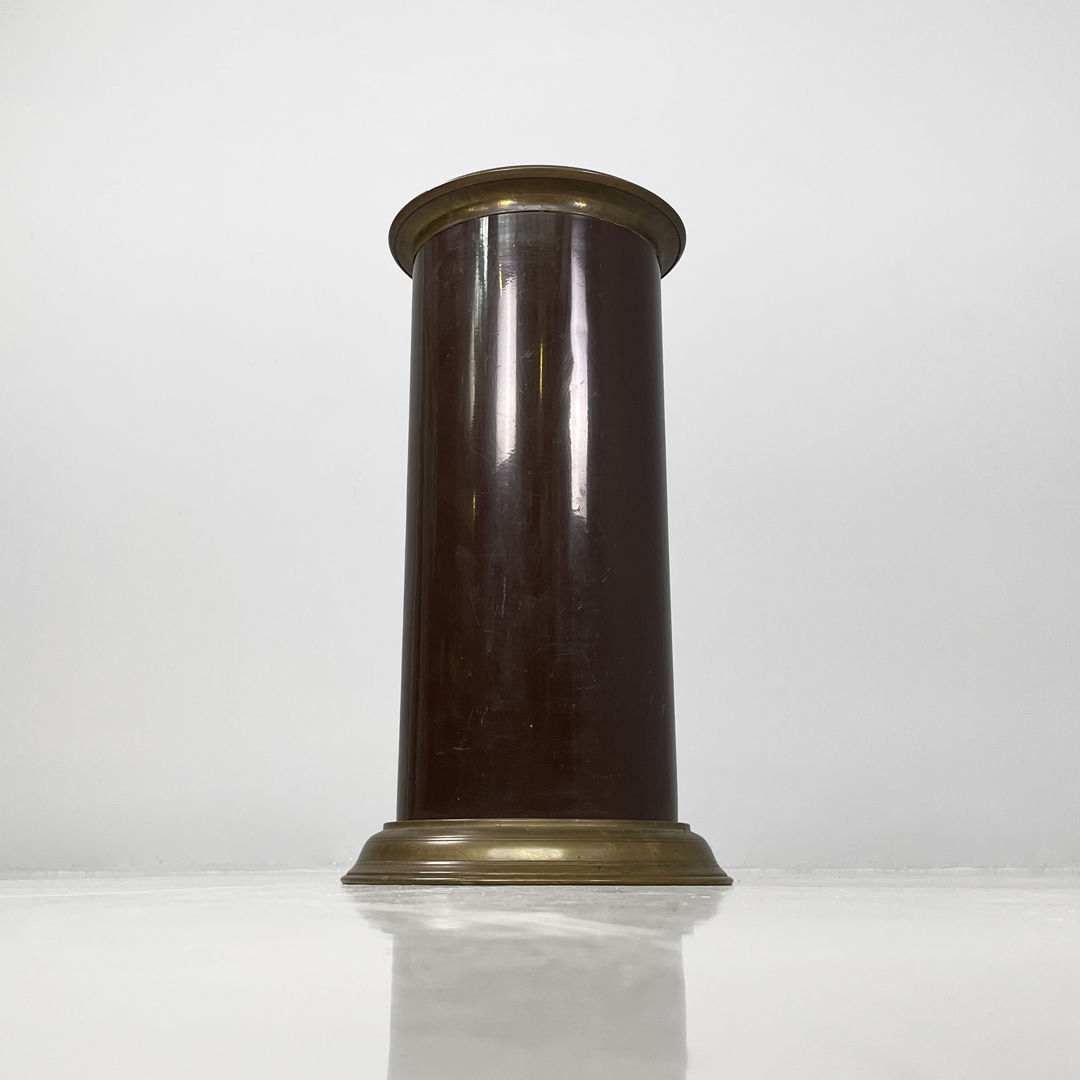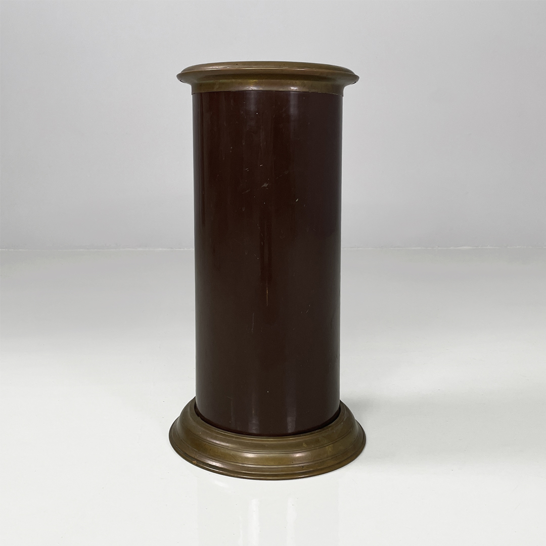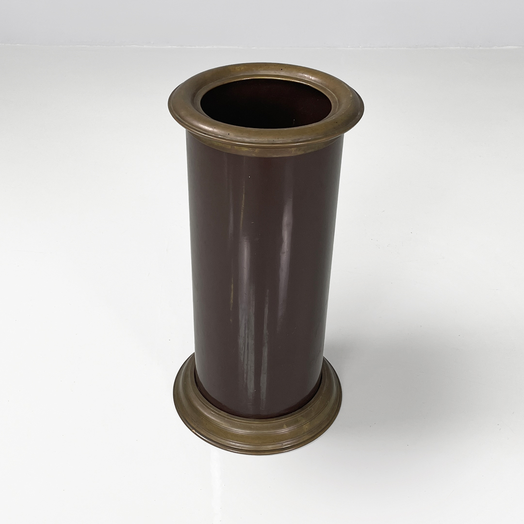 Portaombrelli o cestino a base tonda in bronzo e metallo smaltato marrone.
