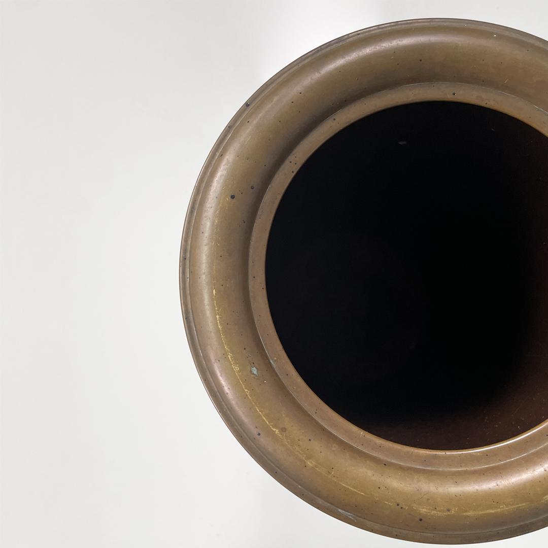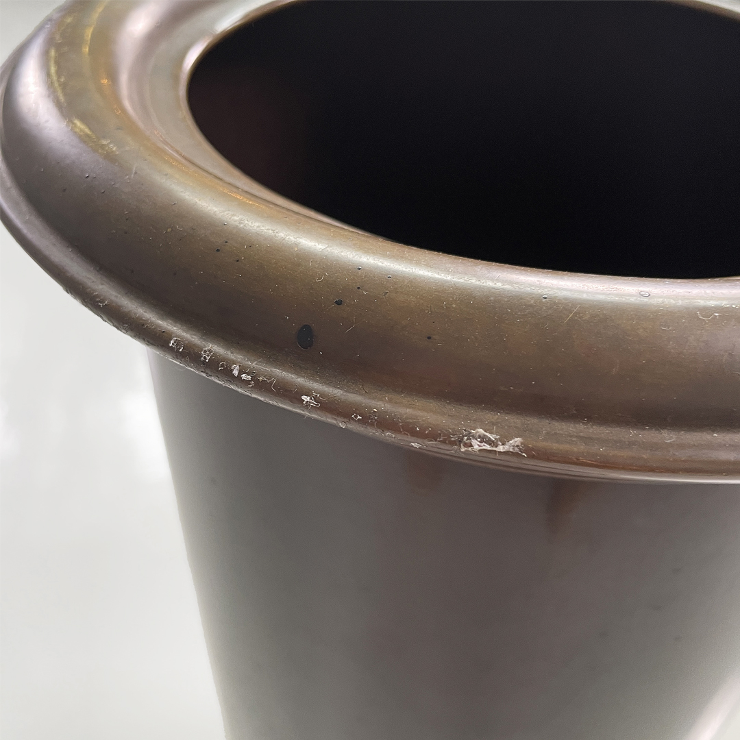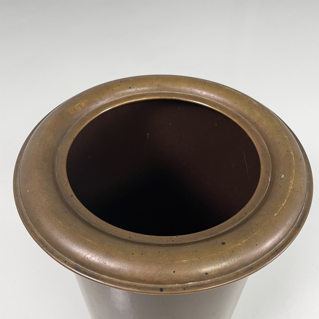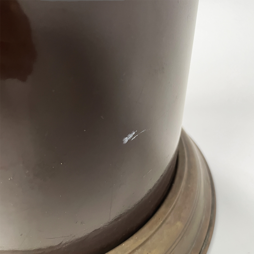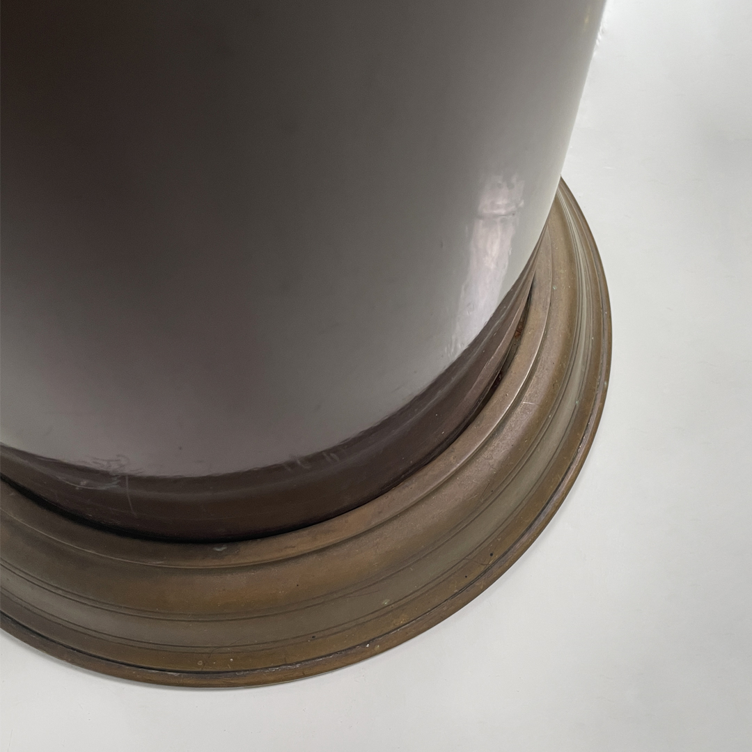 Portaombrelli o cestino a base tonda in bronzo e metallo smaltato marrone.