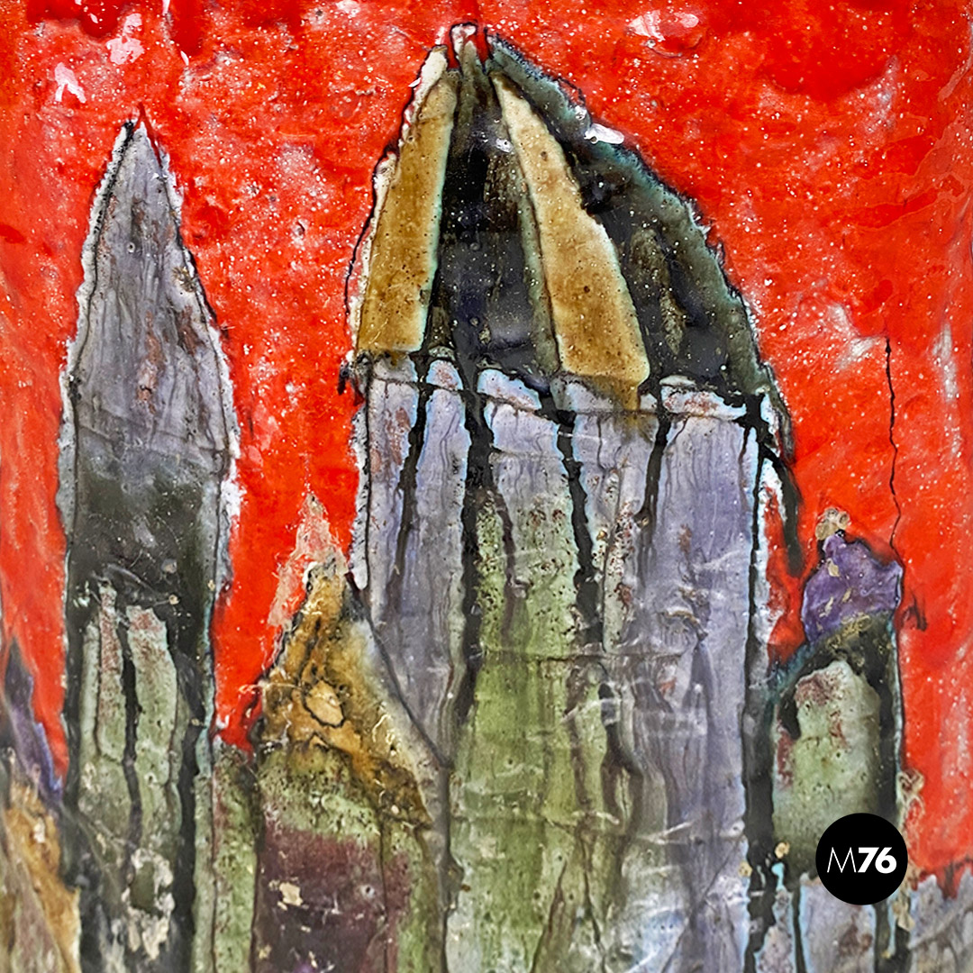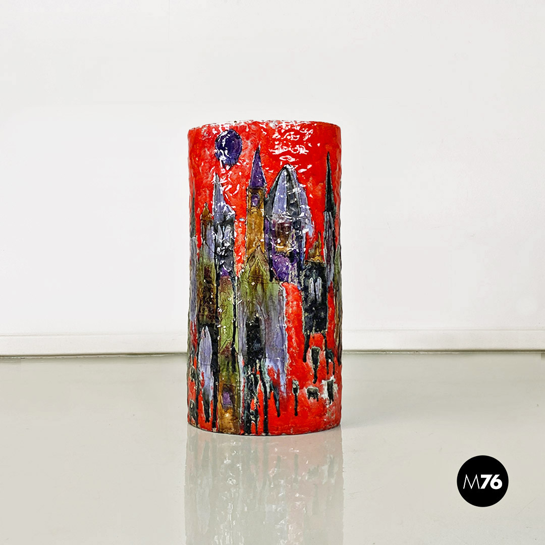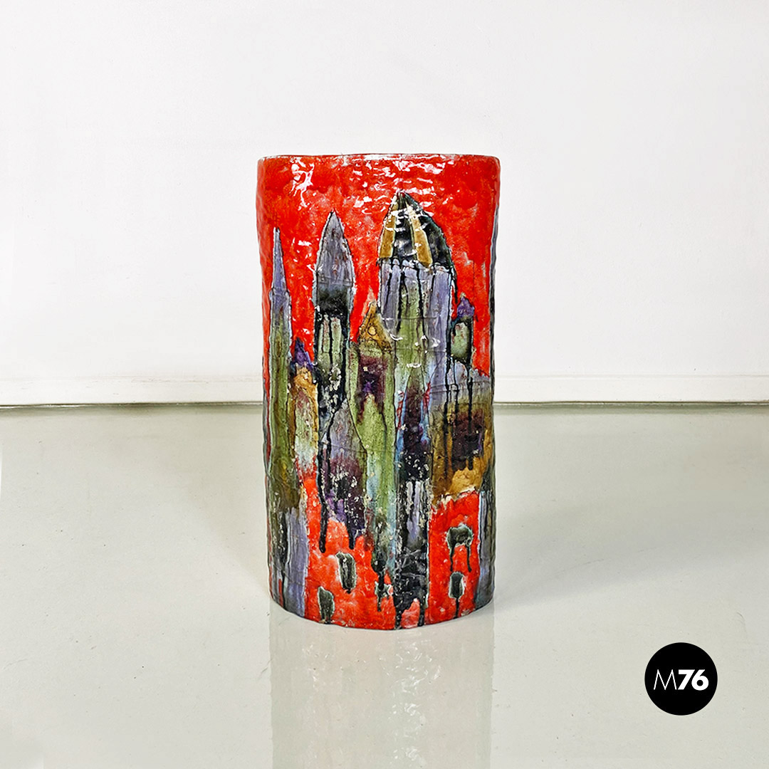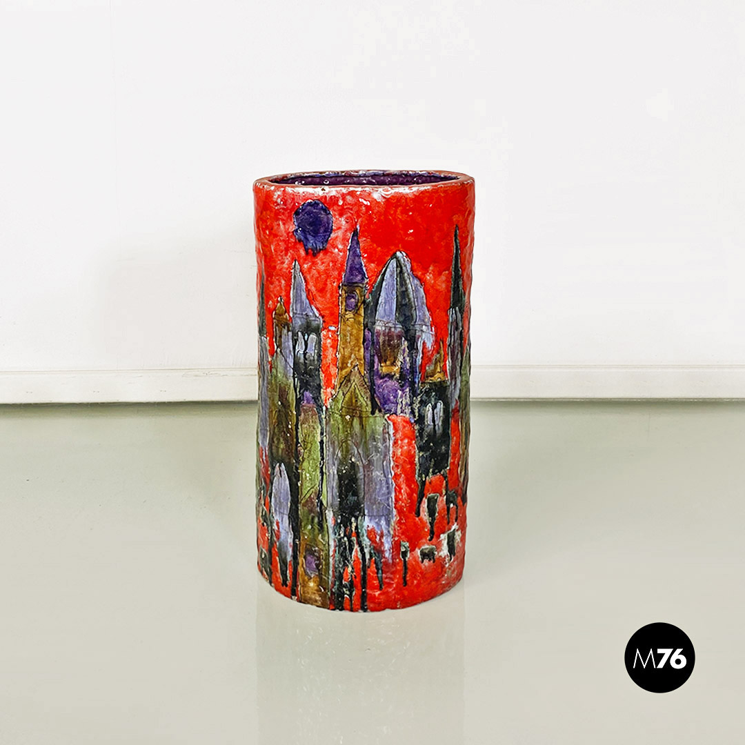 Portaombrelli con base di forma ellittica, con struttura interamente in ceramica multicolore con fondo arancione e colorazione in rilievo sui toni del blu, verde e nero, rappresentanti in maniera stilizzata degli alti palazzi.