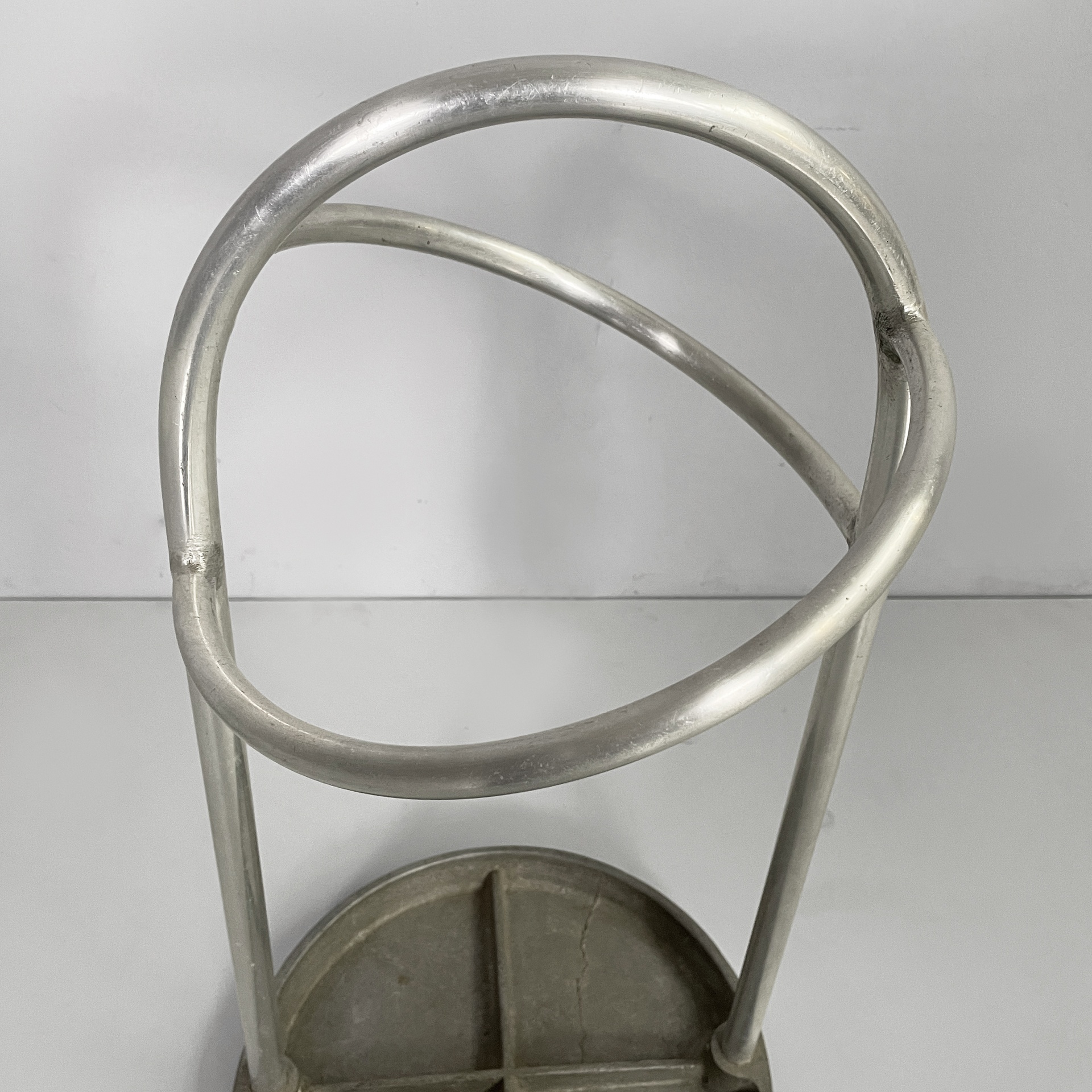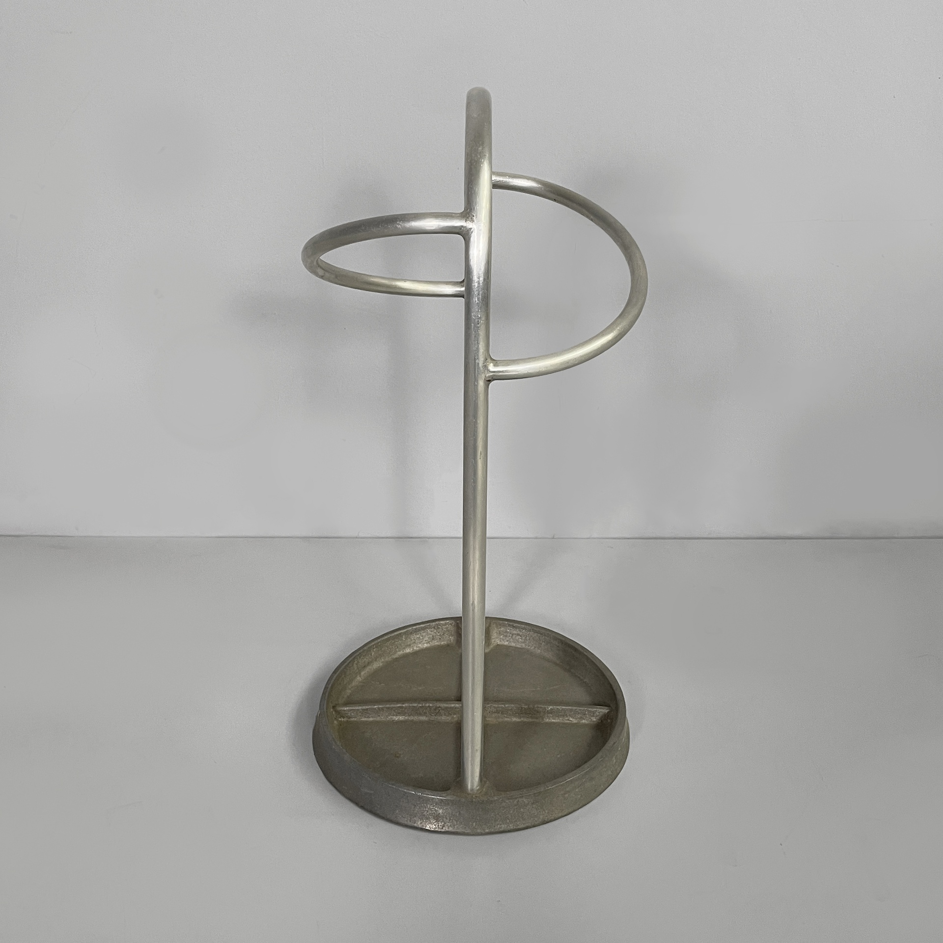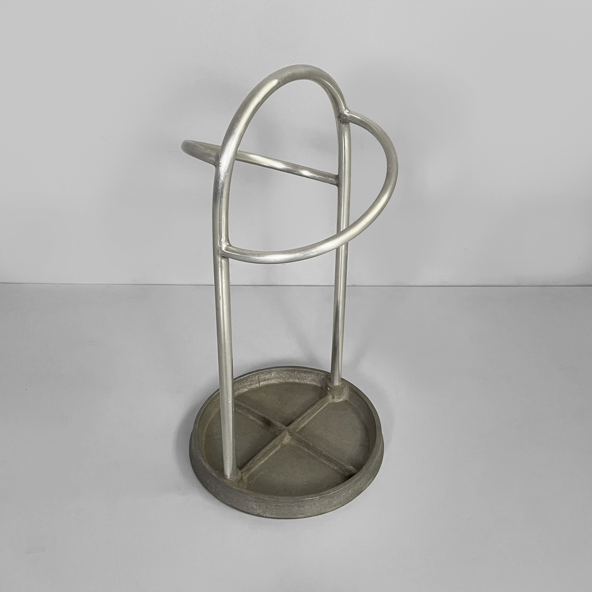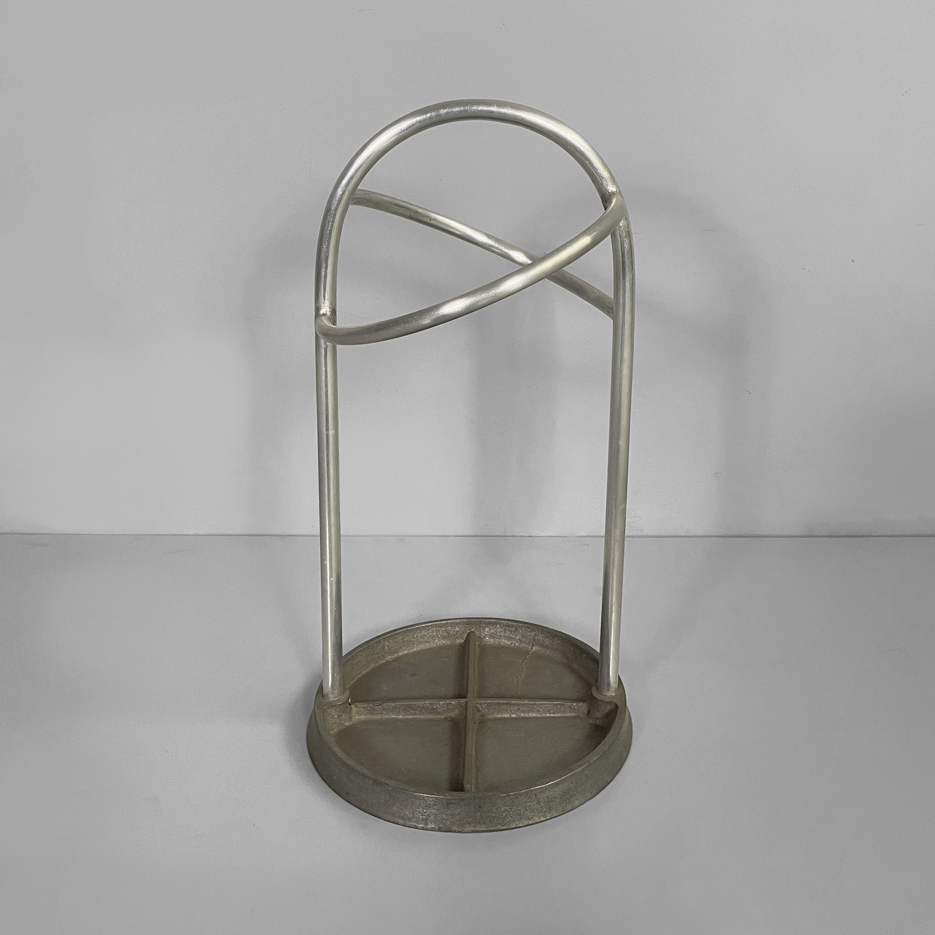 Portaombrelli a base tonda in metallo. La struttura è composta da tubolari di metallo curvati. La base è tonda. Art Deco.
