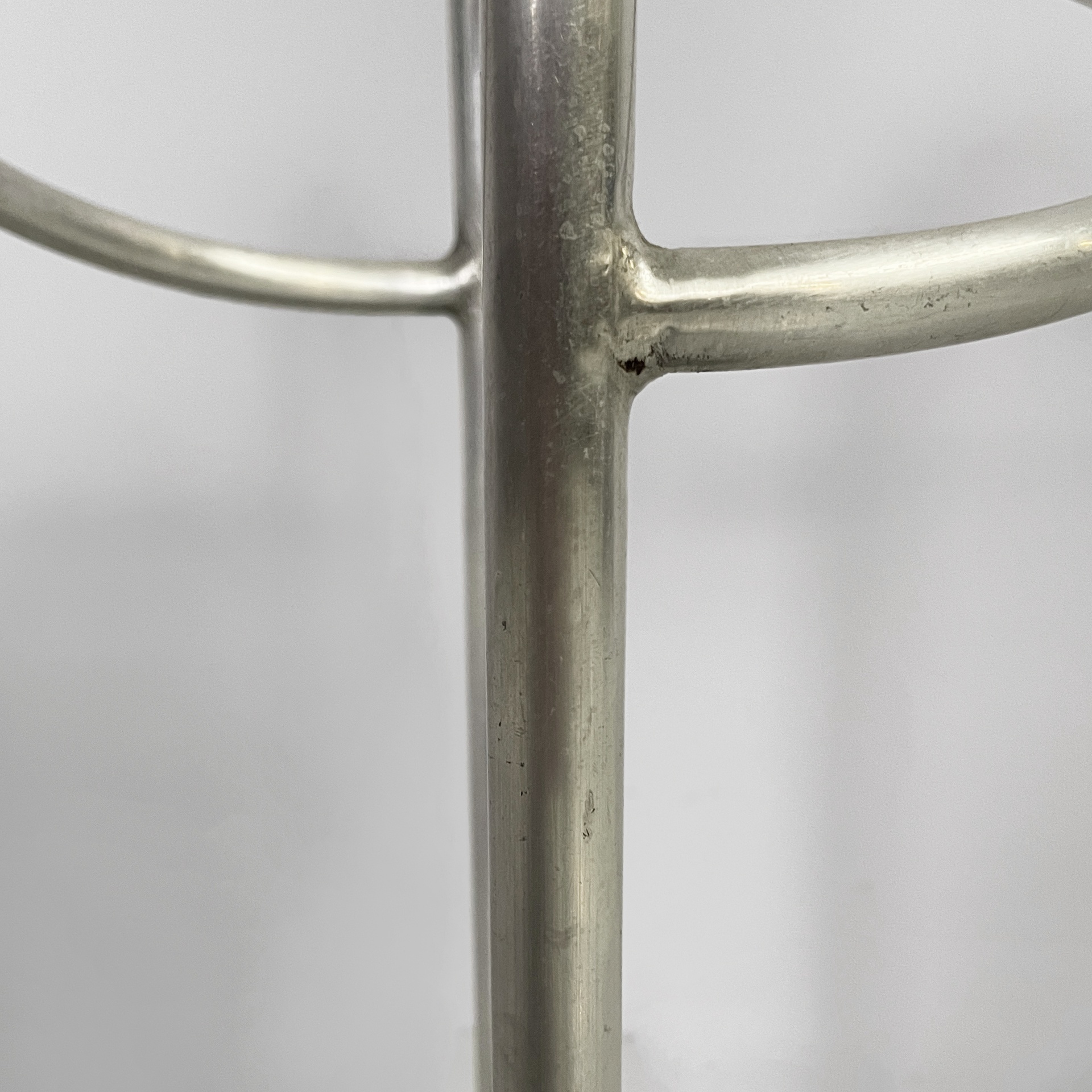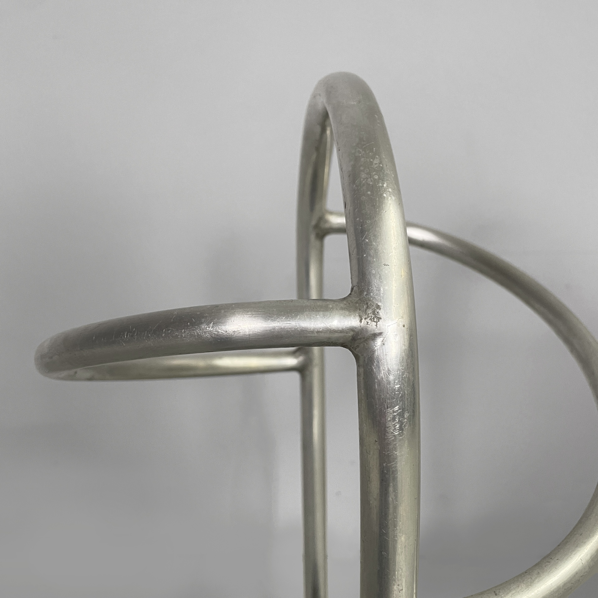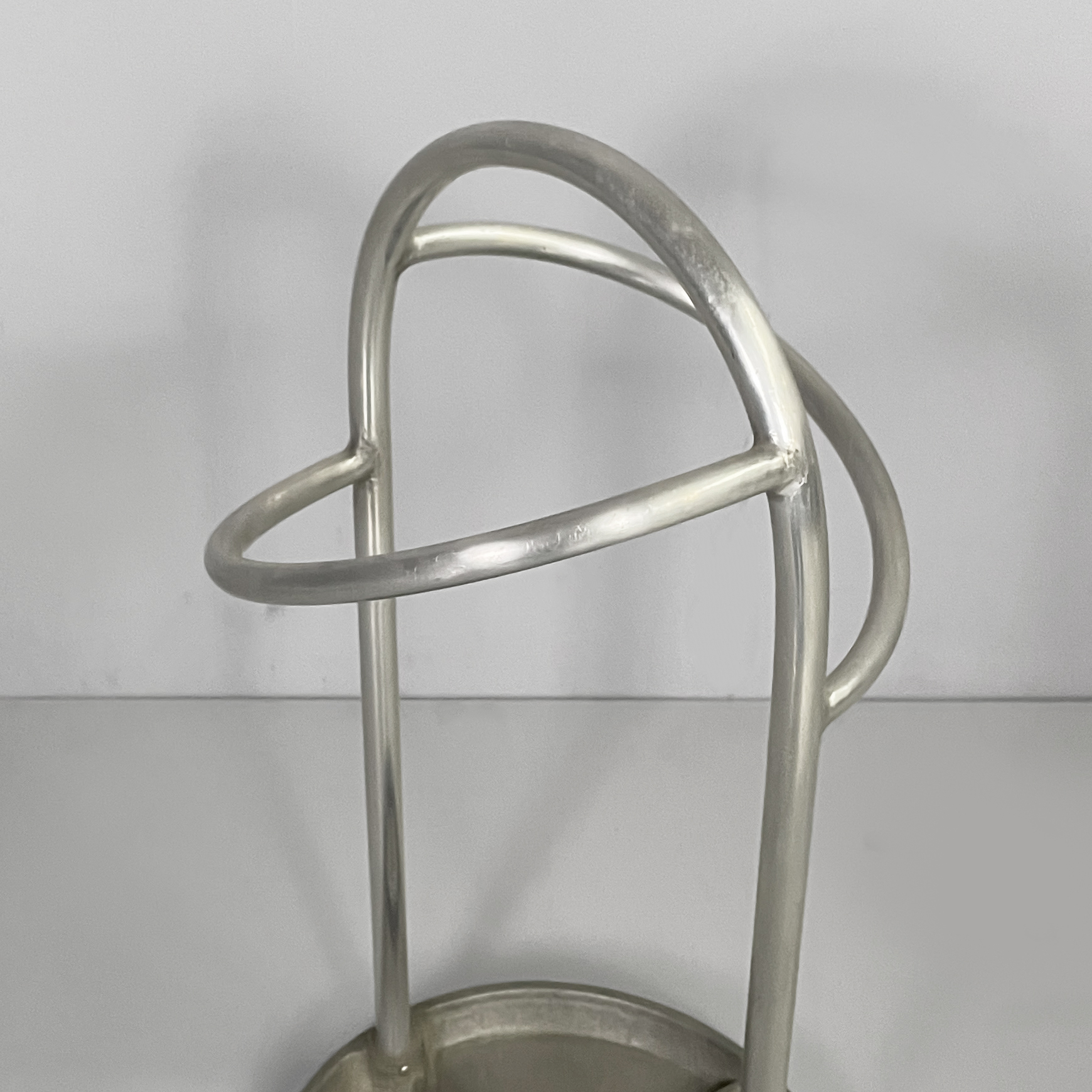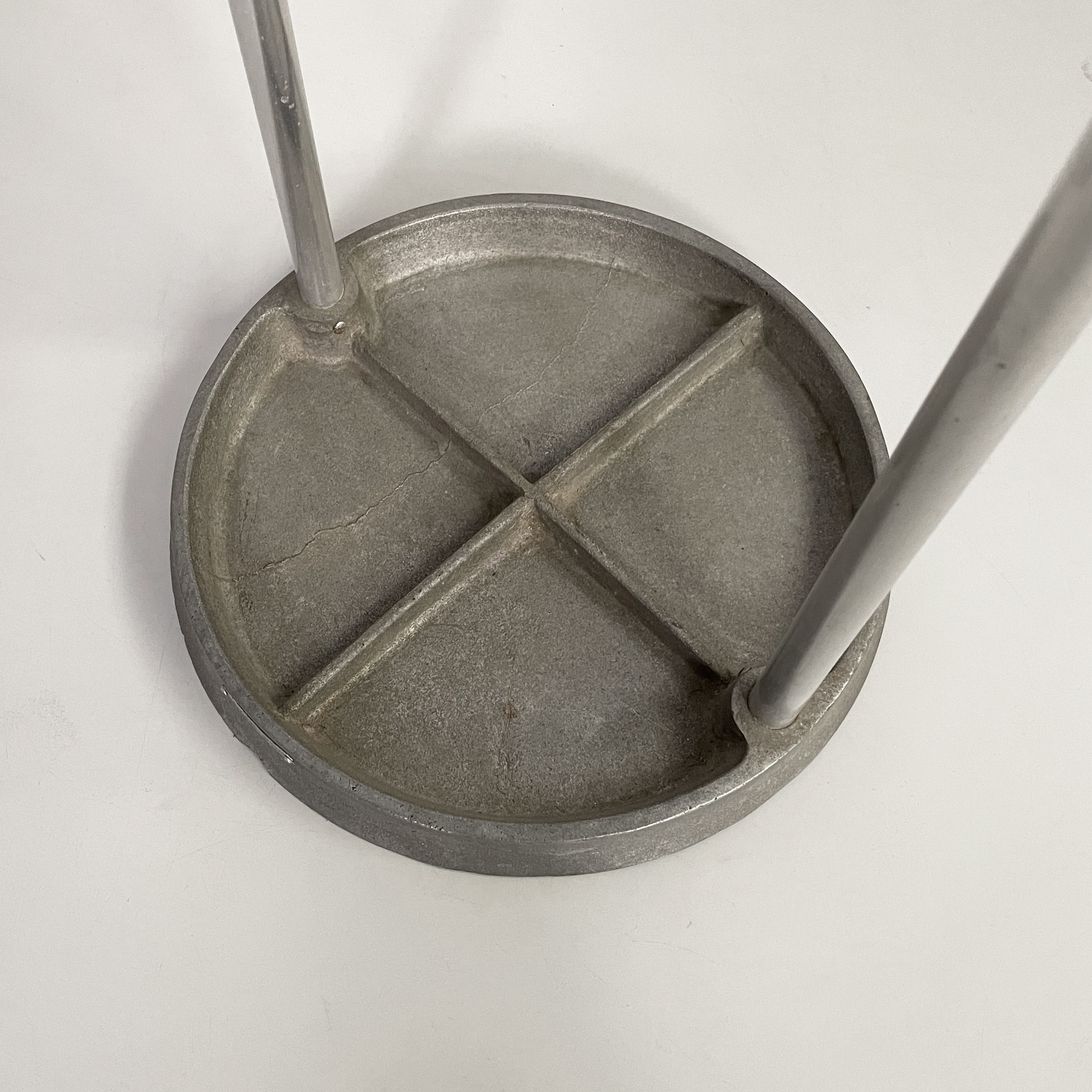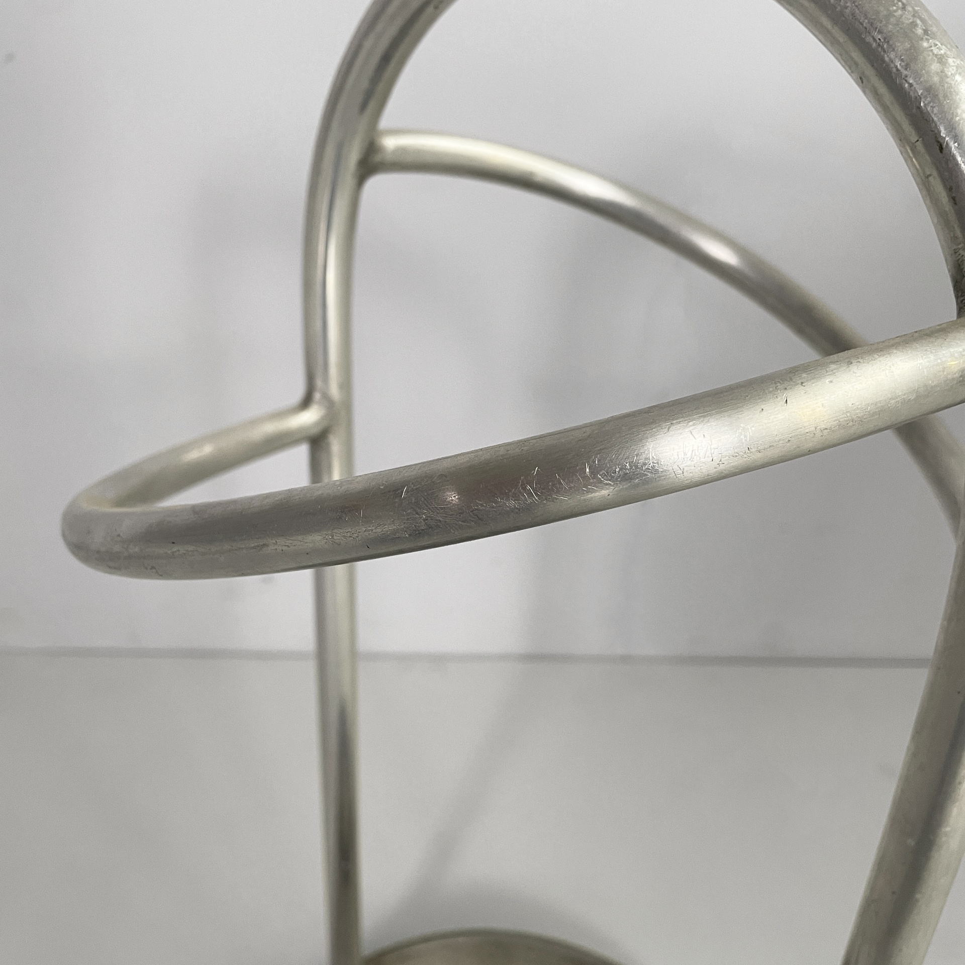 Portaombrelli a base tonda in metallo. La struttura è composta da tubolari di metallo curvati. La base è tonda. Art Deco.