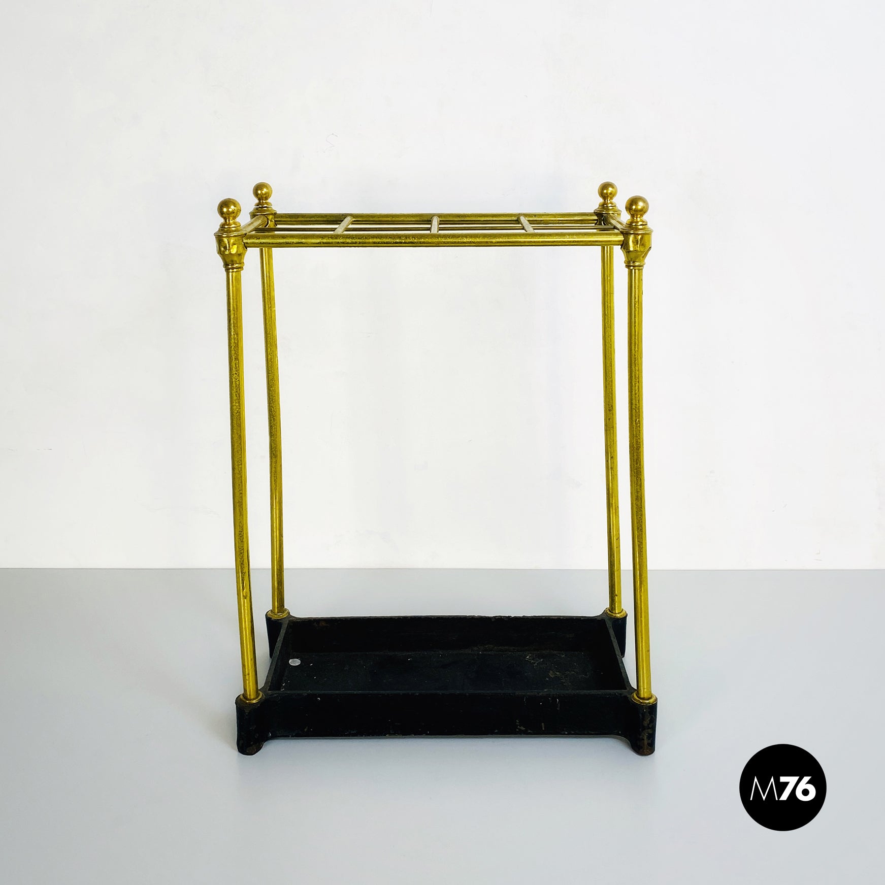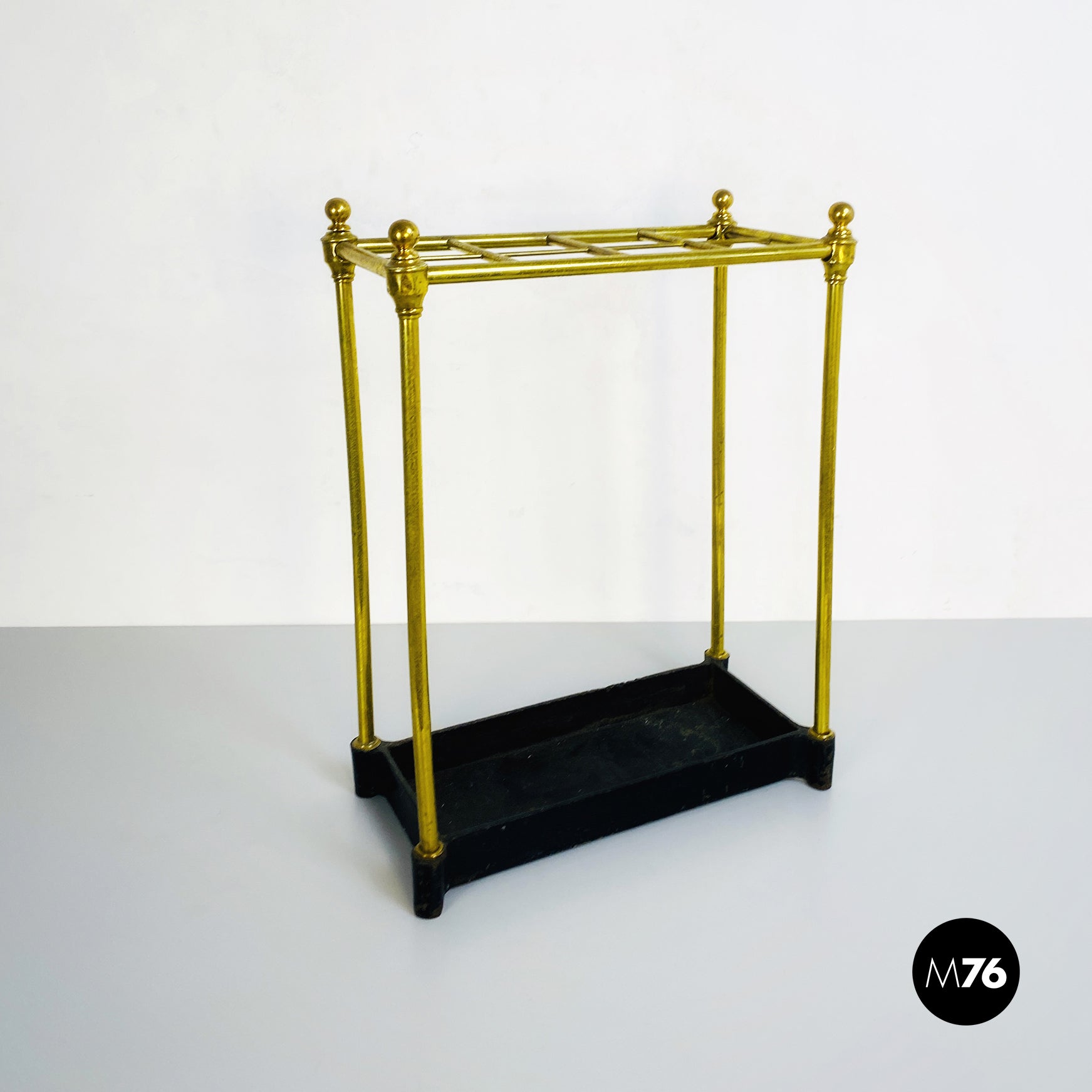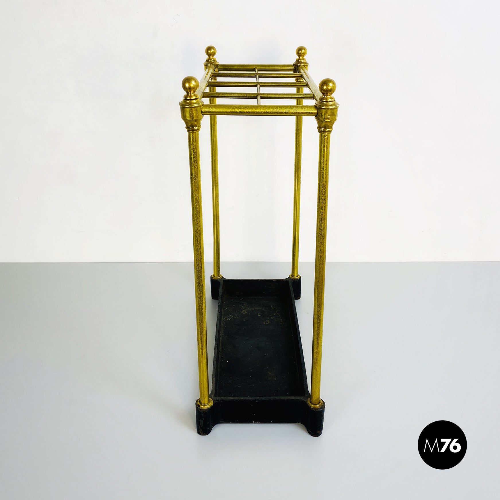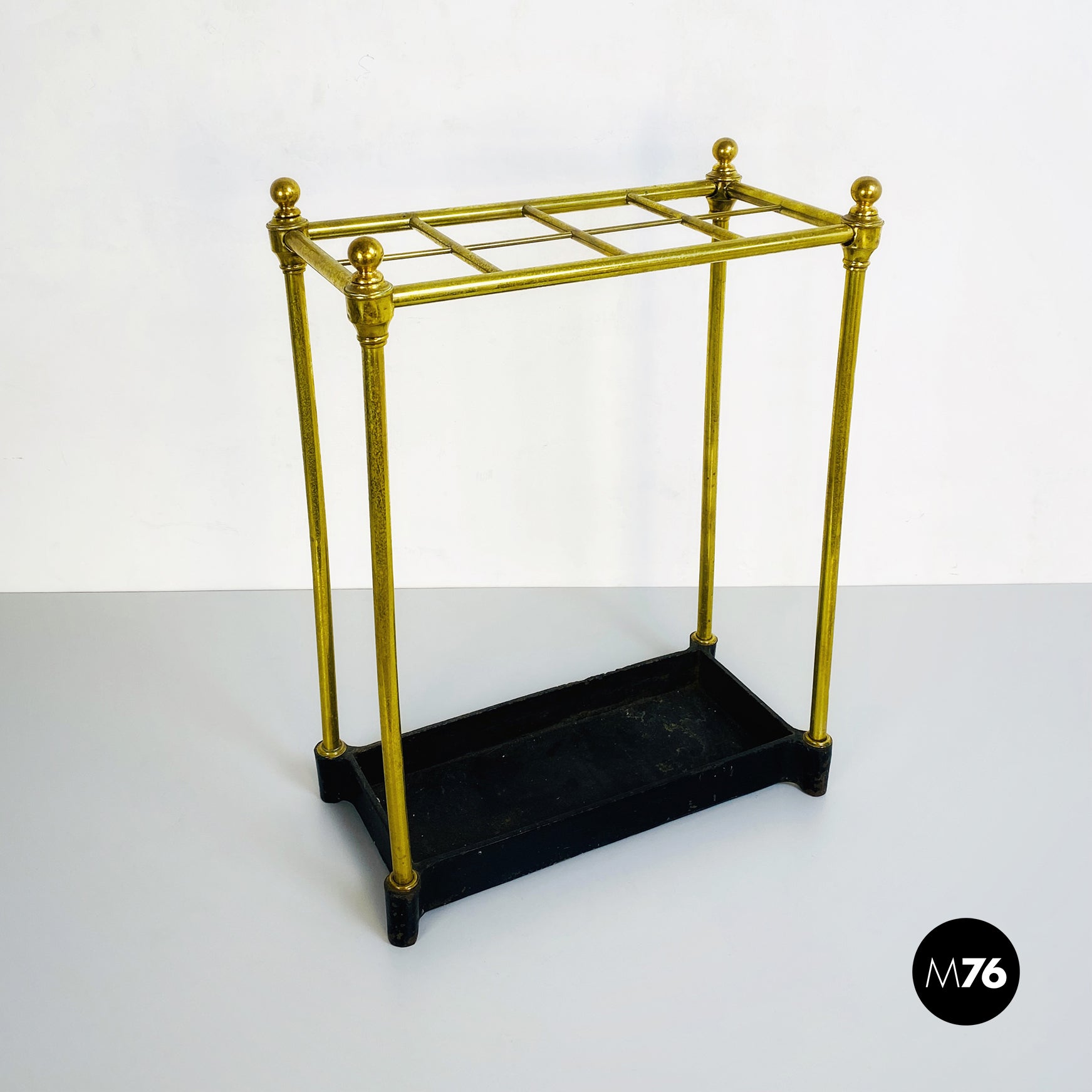 Portaombrelli a base rettangolare, composto da otto fori contenitivi creati da una griglia in ottone, base in ferro battuto nero e pomelli decorativi in ottone.